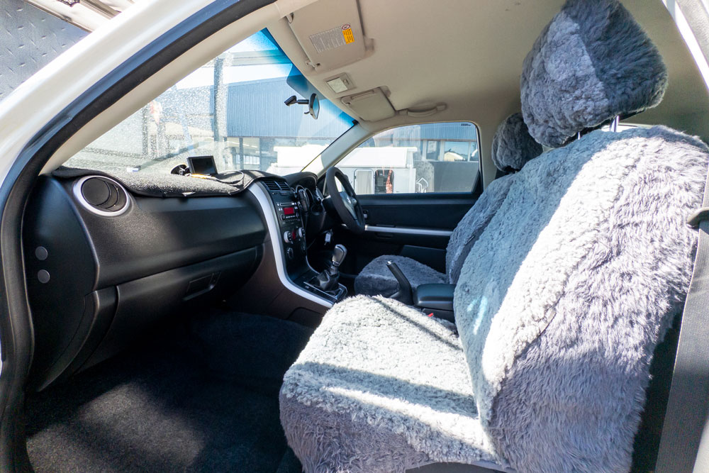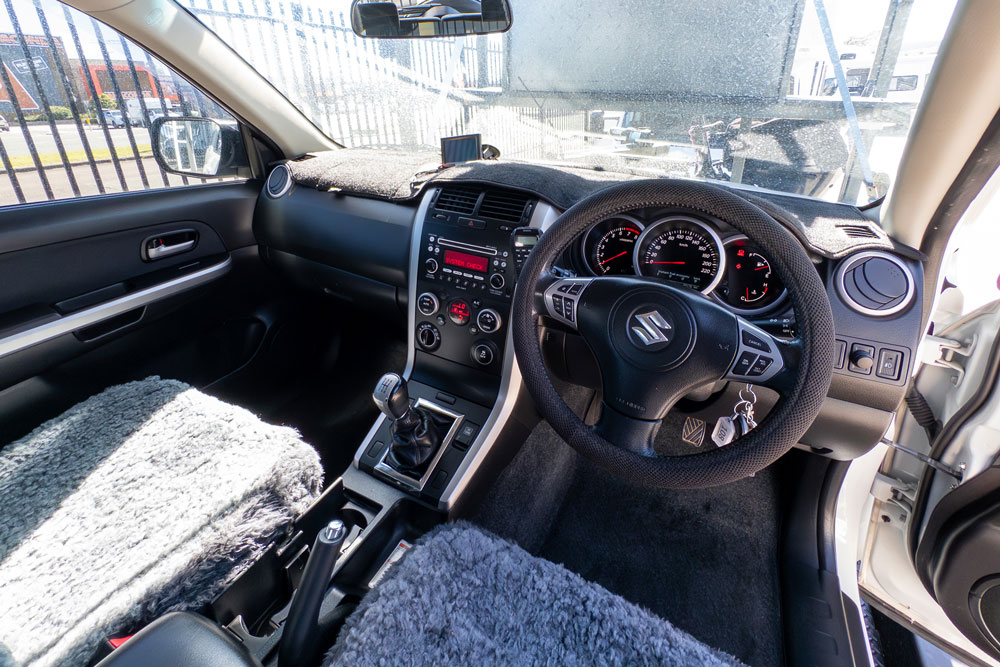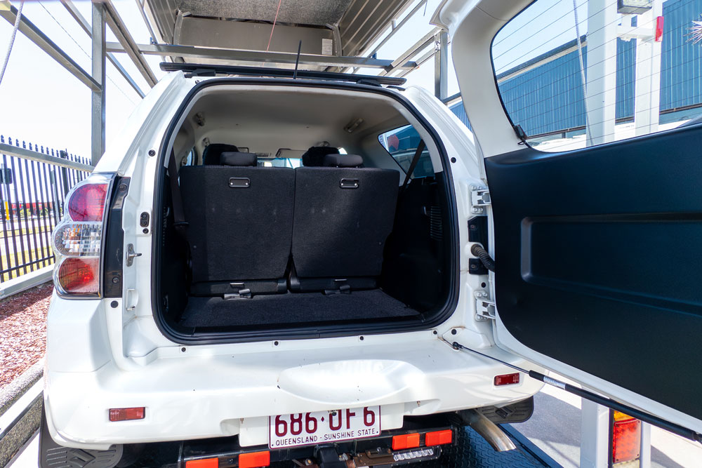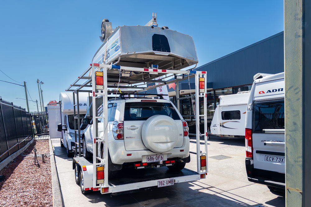 This custom-built tandem-axle toy hauler is the ultimate setup for adventurers who refuse to leave anything behind. Featuring a heavy-duty skeletal frame designed for multi-vehicle transport, this rig comfortably carries a 2013 Suzuki Grand Vitara 4×4 on the main bed while securing a Stressco 379 Tripper aluminum tinnie on the integrated overhead rack.