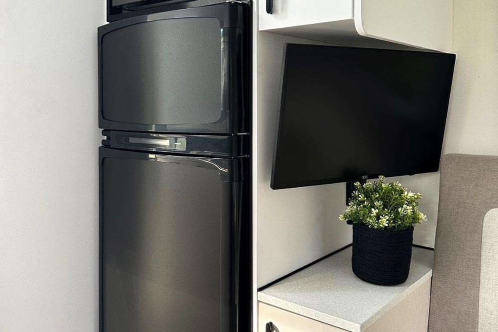 Inside, the well-equipped kitchen, smart TV, and automatic climate control create a home-like experience wherever you roam. With a 100L fresh water tank, solar panels, and a lithium battery, off-grid adventures are easier than ever.