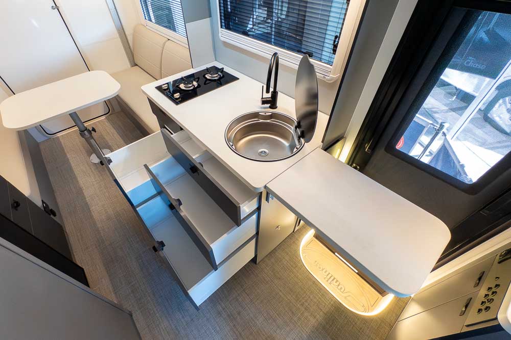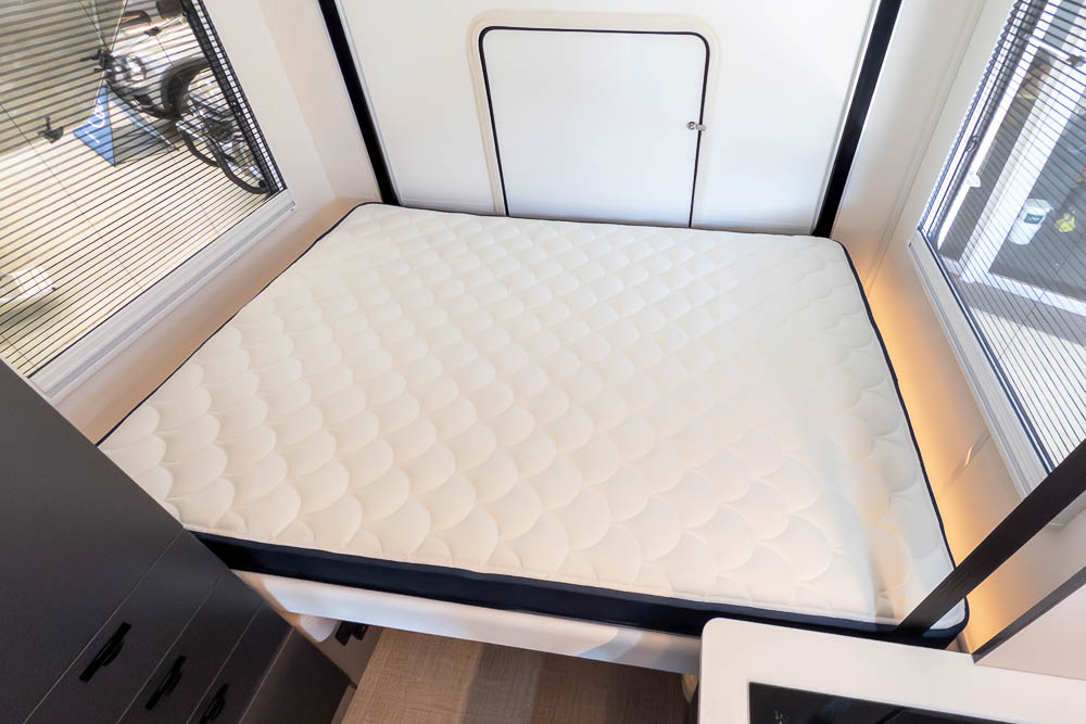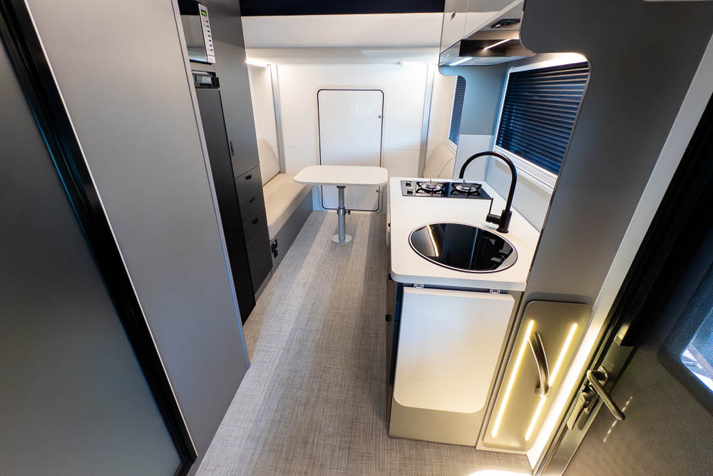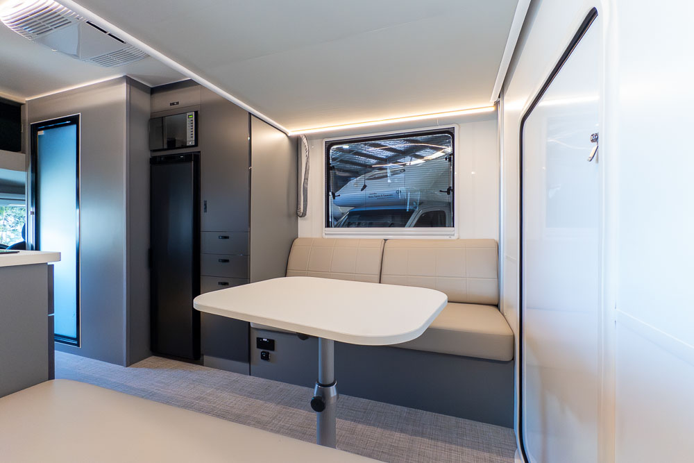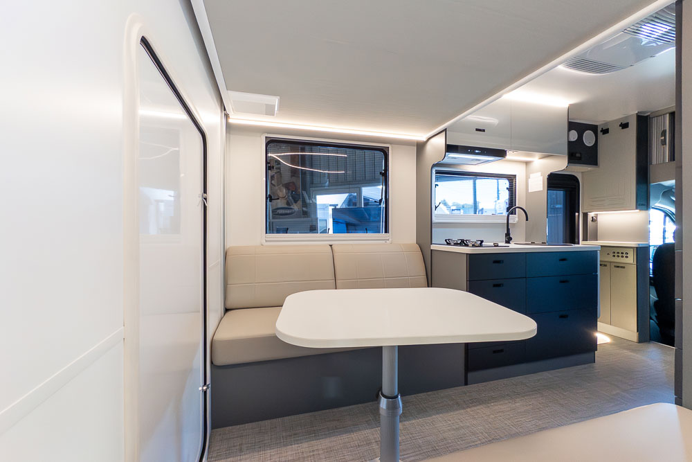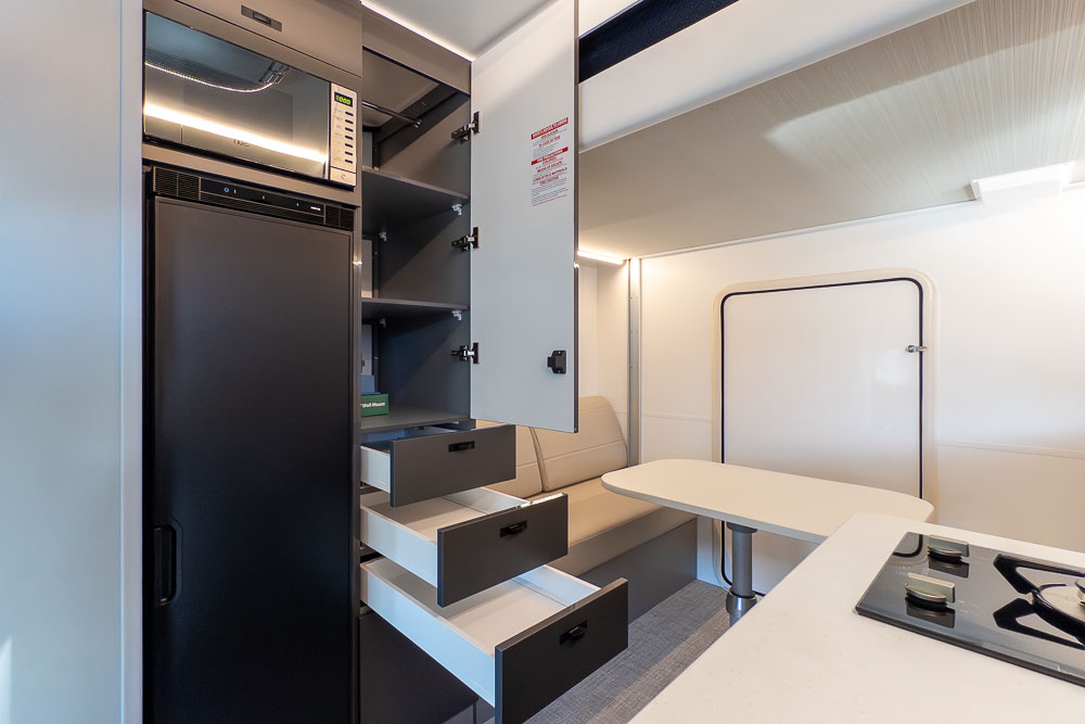 A defining feature across the range is the innovative DryZone ensuite, which separates the shower and toilet areas to maximise practicality and comfort. The electric drop-down double bed positioned above the rear lounge creates a versatile rear living zone by day and a comfortable sleeping space by night, without permanently sacrificing floor area.