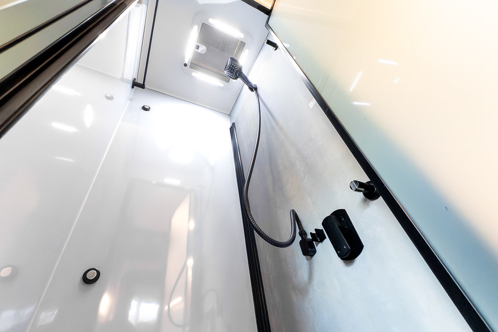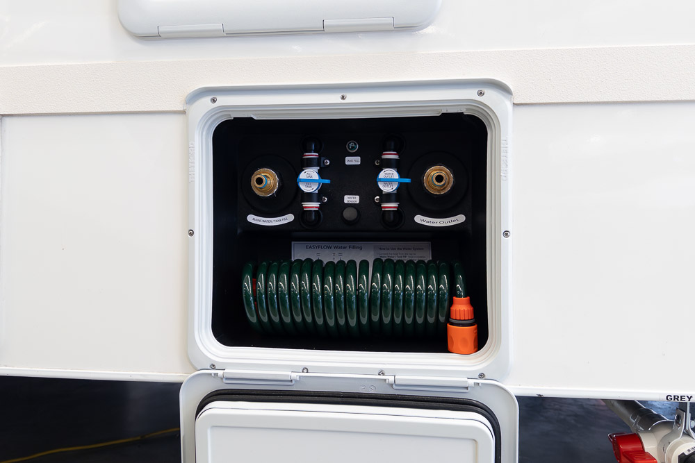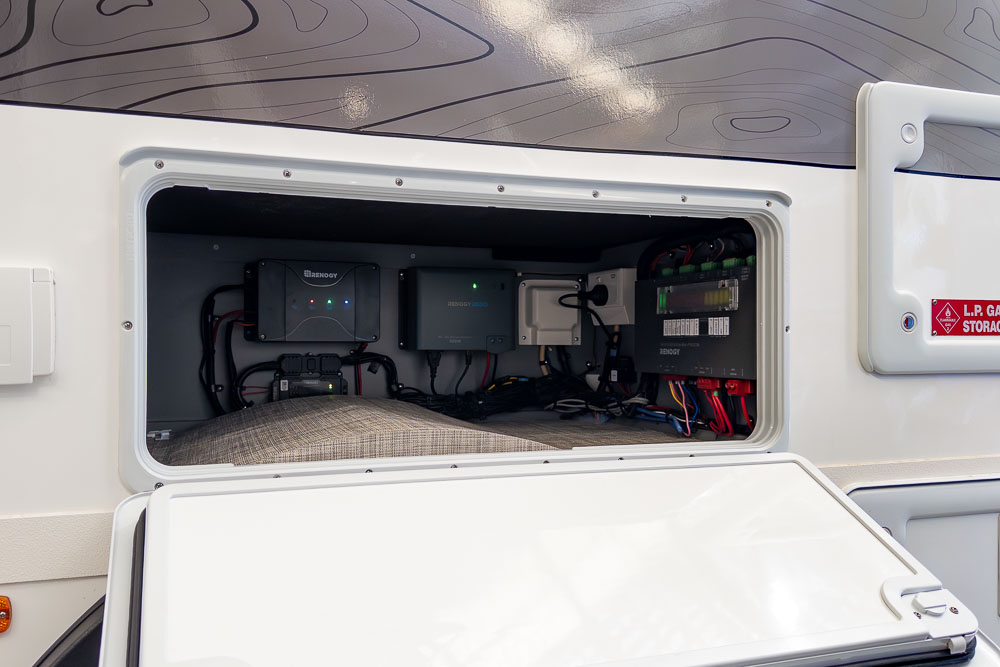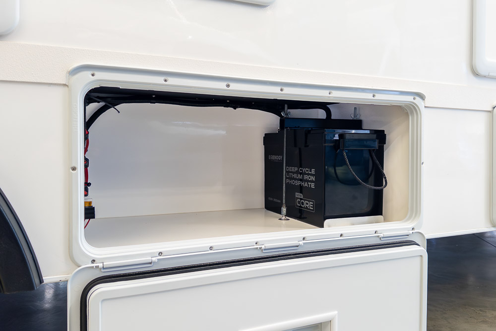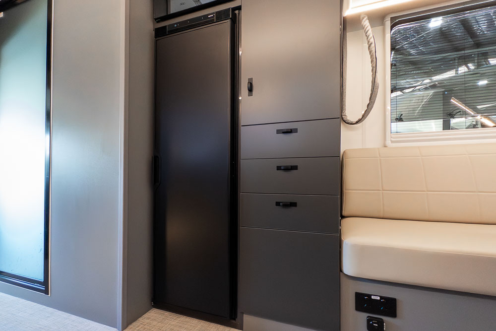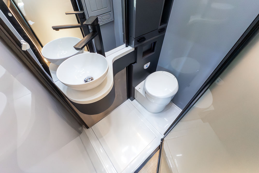 A defining feature across the range is the innovative DryZone ensuite, which separates the shower and toilet areas to maximise practicality and comfort. The electric drop-down double bed positioned above the rear lounge creates a versatile rear living zone by day and a comfortable sleeping space by night, without permanently sacrificing floor area.
