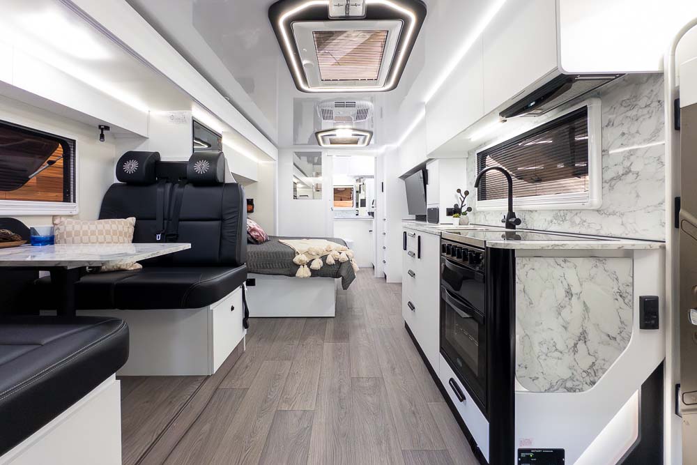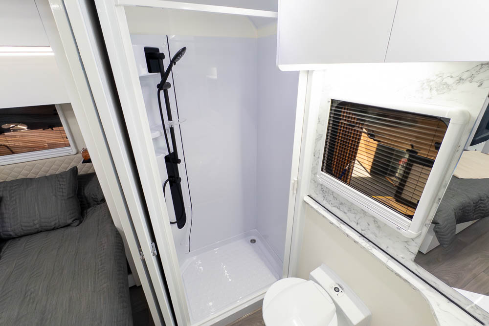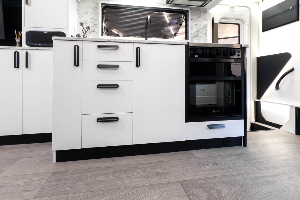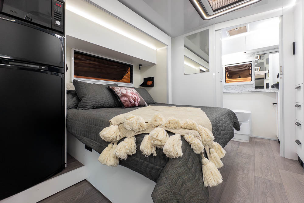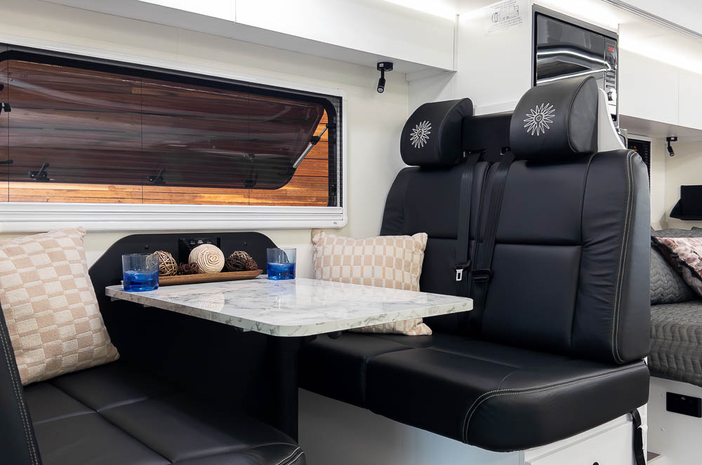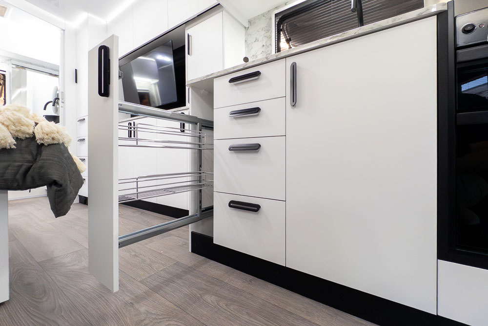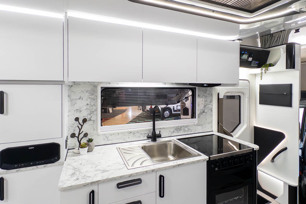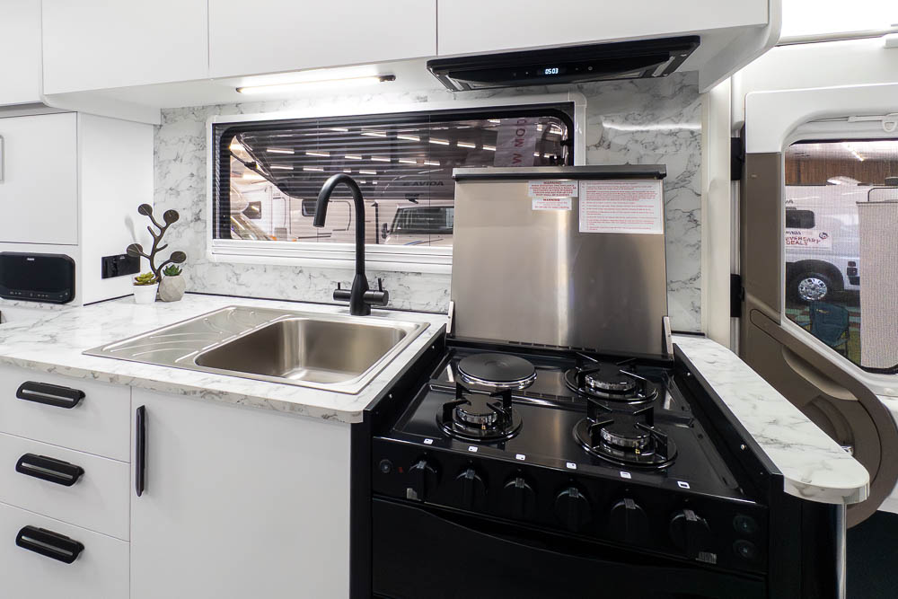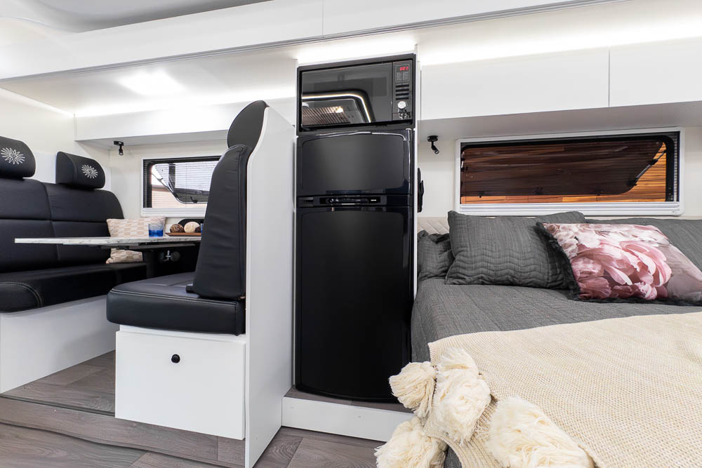 Meanwhile, the kitchen is thoughtfully designed along the opposing wall and includes a stove, generous sink, ample drawers, overhead cupboards, range hood and microwave. For added convenience, a fold-down bench extension near the entry door provides extra preparation space when needed. Likewise, the two-door three-way fridge keeps supplies well organised, making extended trips far easier.
