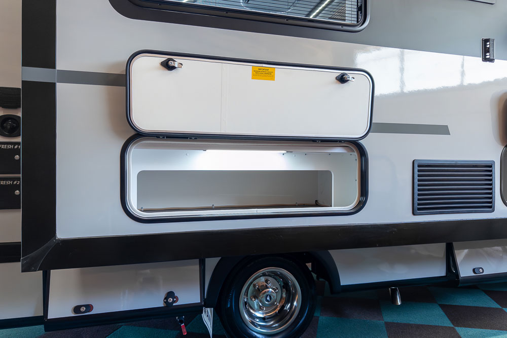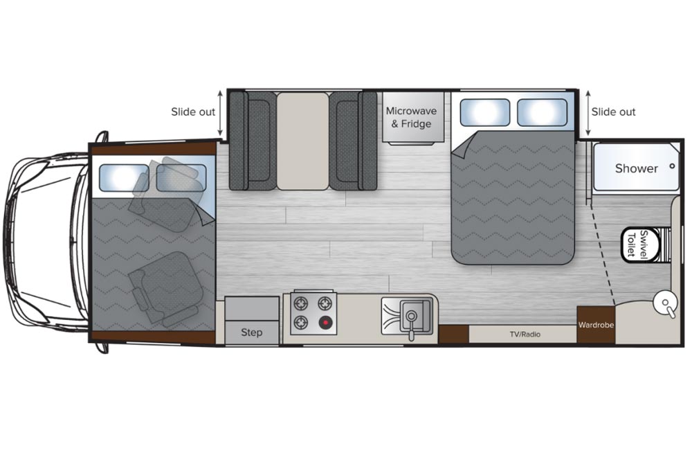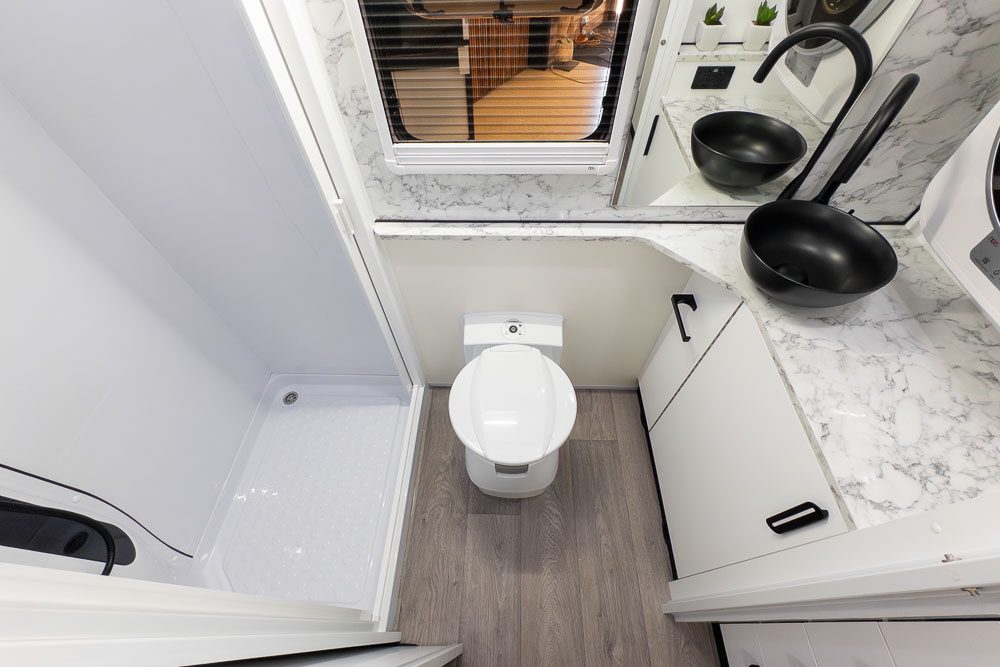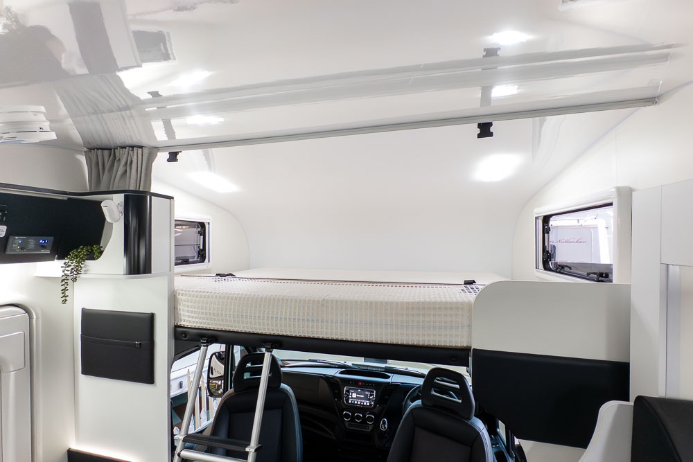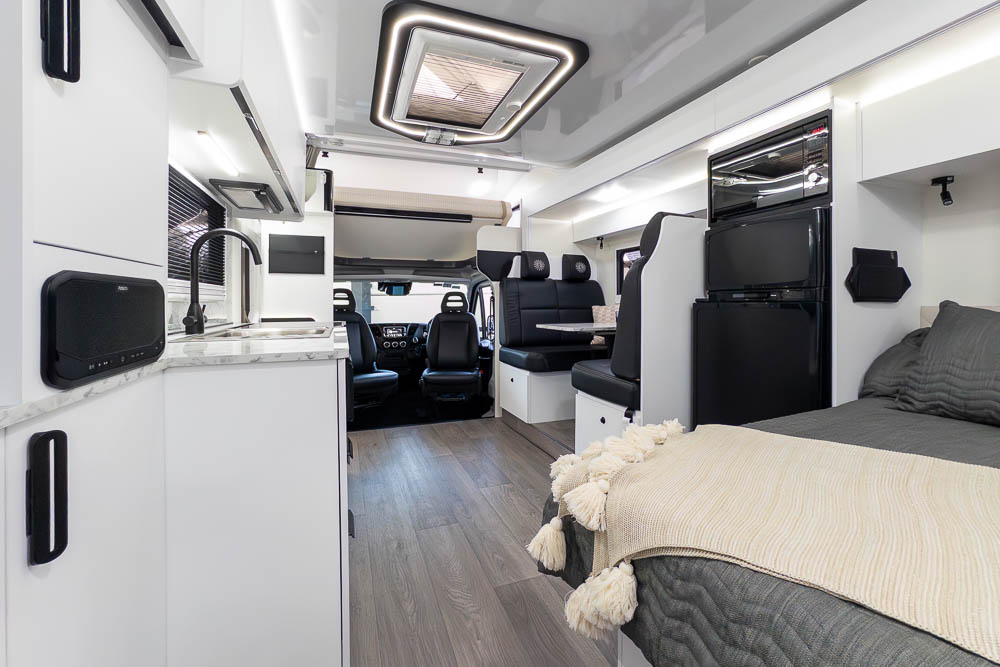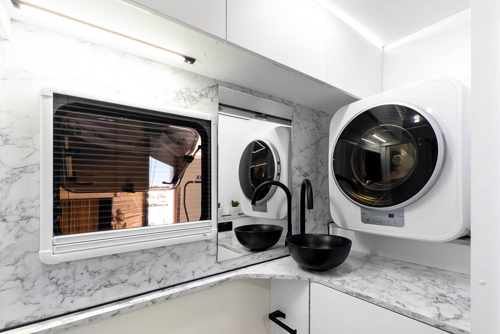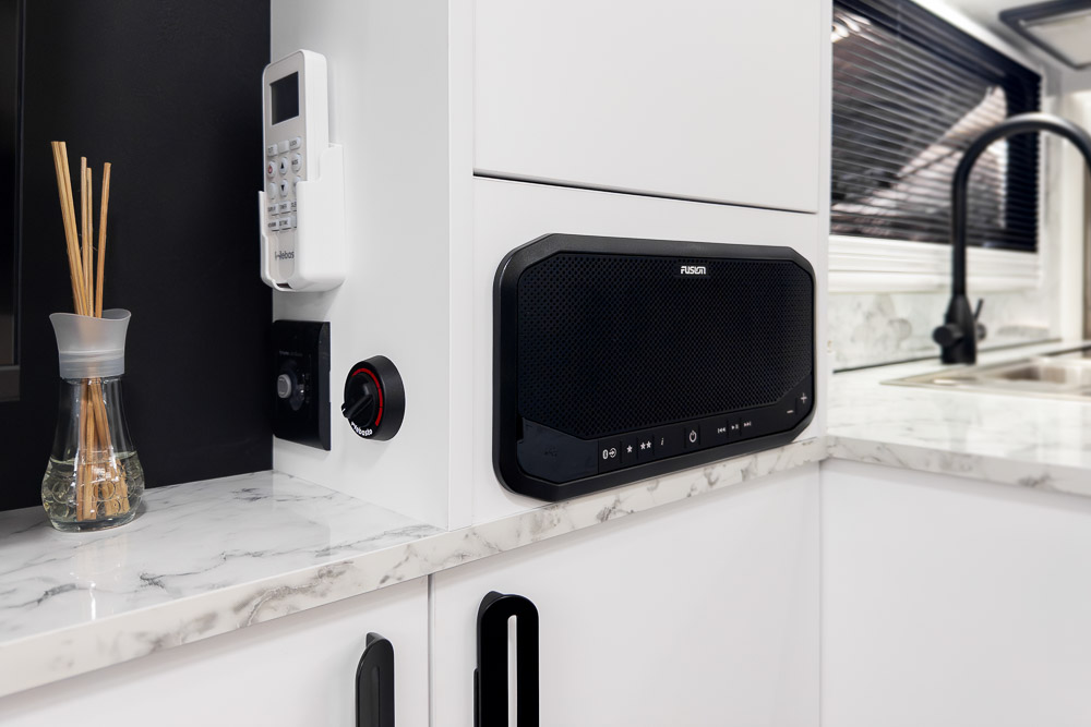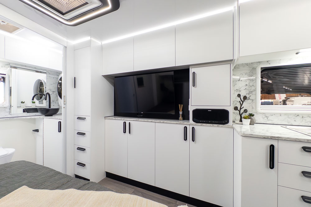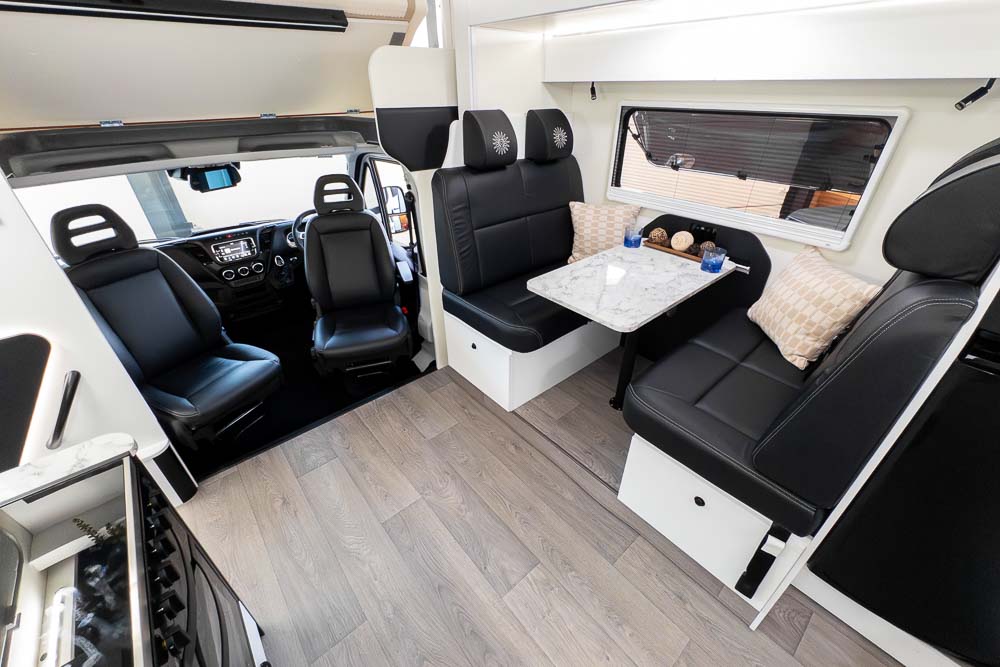 Meanwhile, the kitchen is thoughtfully designed along the opposing wall and includes a stove, generous sink, ample drawers, overhead cupboards, range hood and microwave. For added convenience, a fold-down bench extension near the entry door provides extra preparation space when needed. Likewise, the two-door three-way fridge keeps supplies well organised, making extended trips far easier.