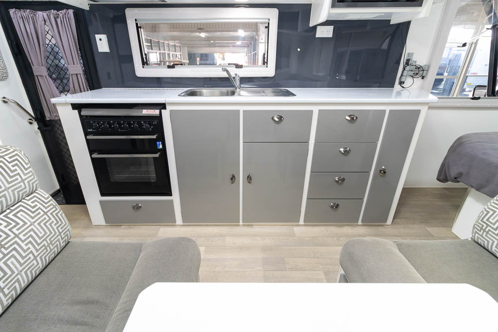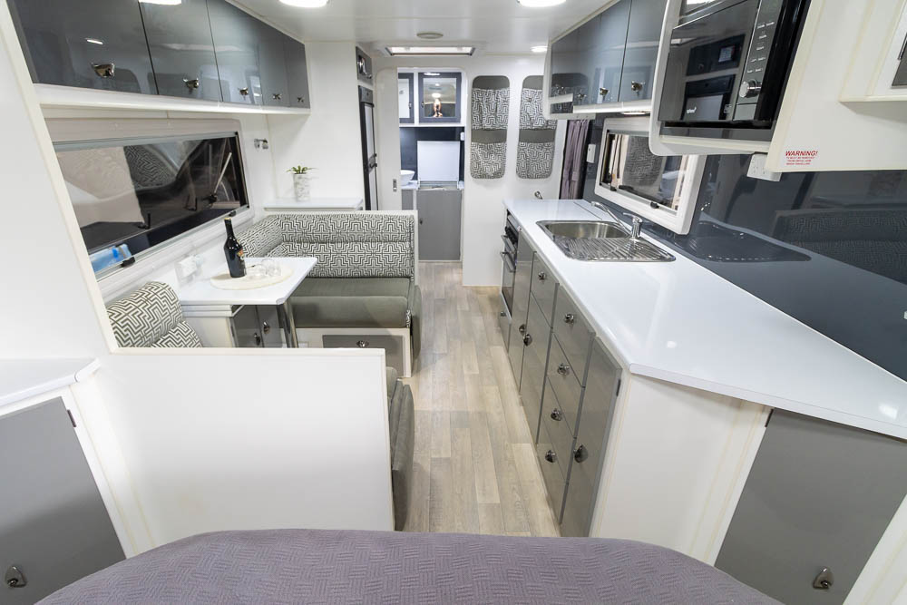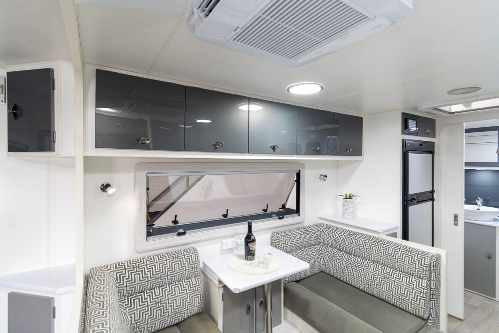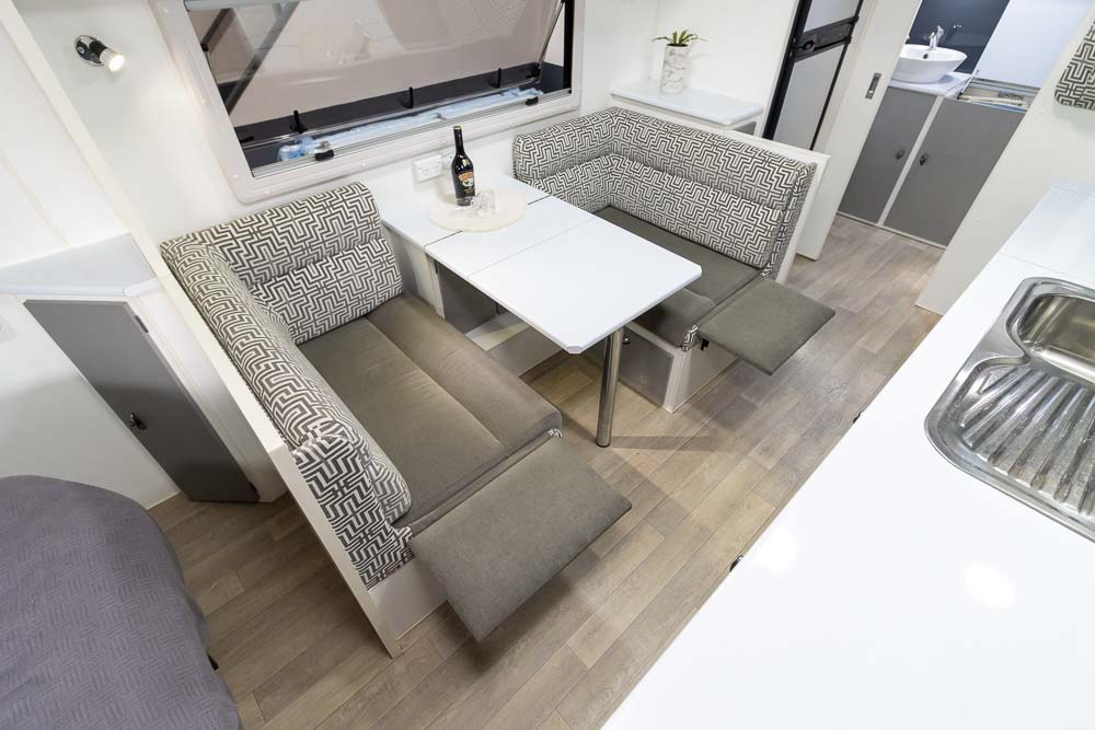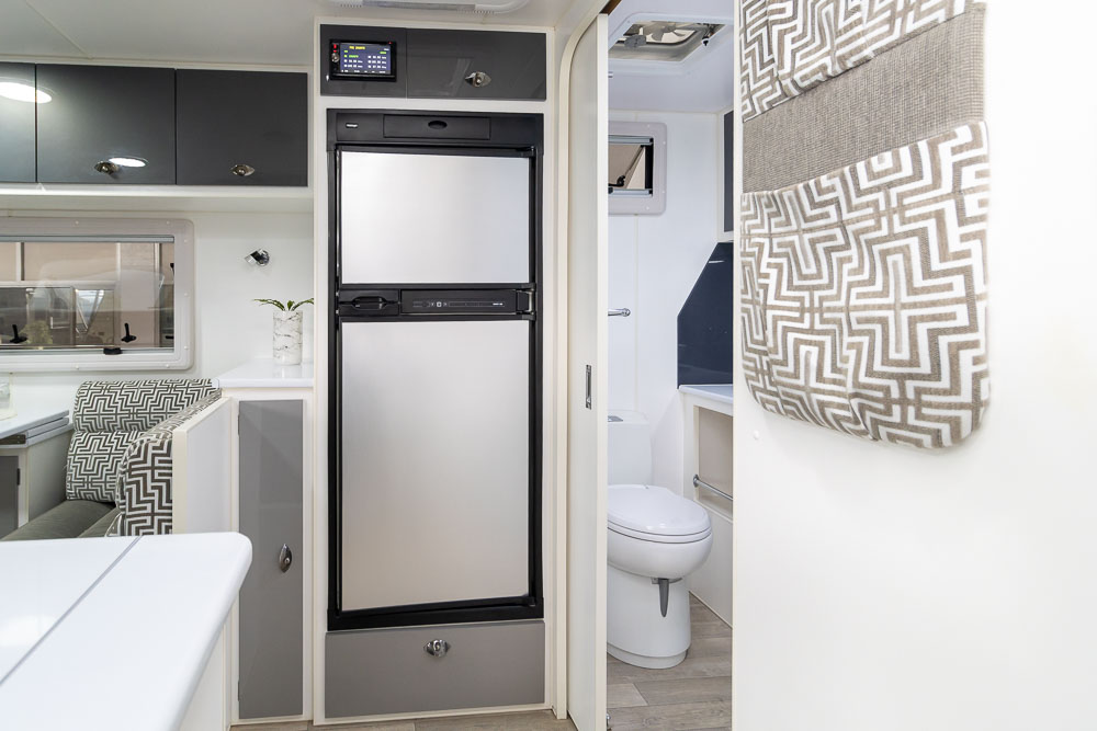 The front island bed creates a cosy, restful retreat, while the central café-style dinette and kitchen provide a social hub for meals, coffee breaks or simply planning your next adventure. The rear ensuite adds a touch of privacy and convenience, while the caravan’s spacious layout, abundant storage and included washing machine ensure you can travel comfortably and confidently with everything you need close at hand.