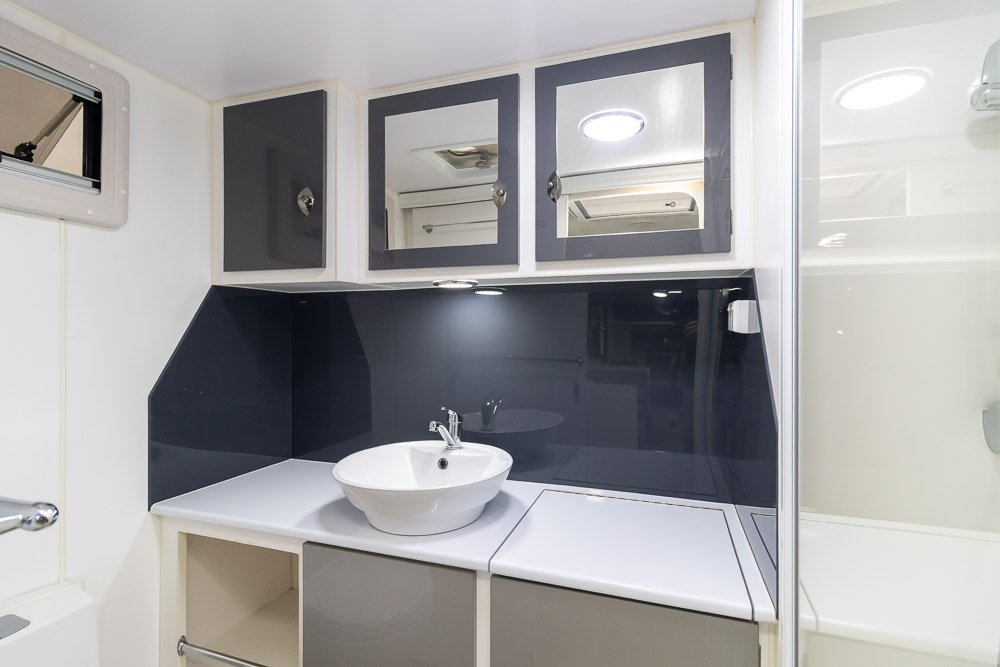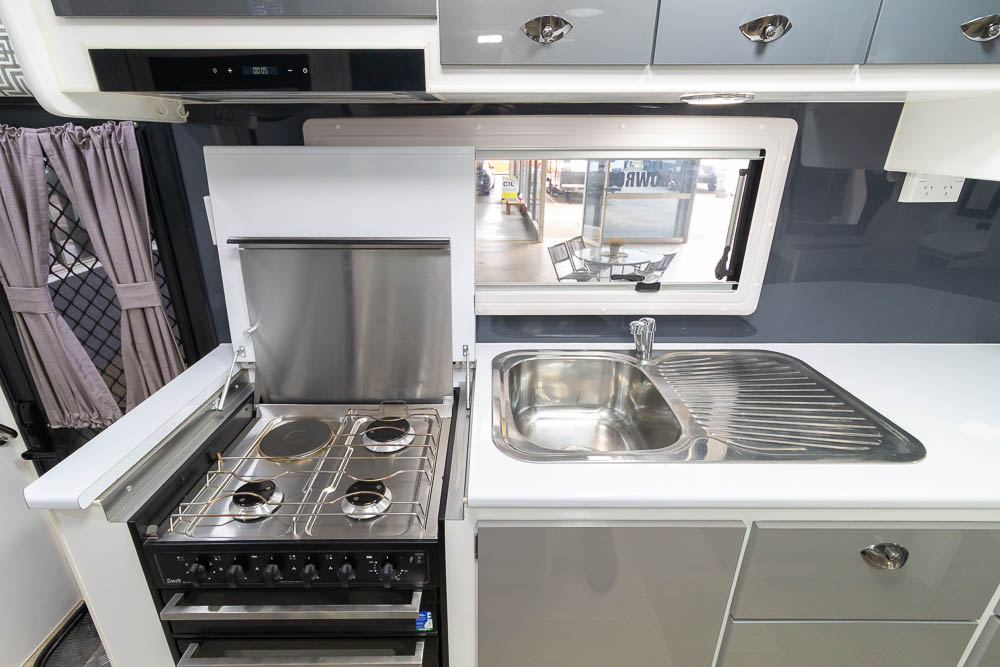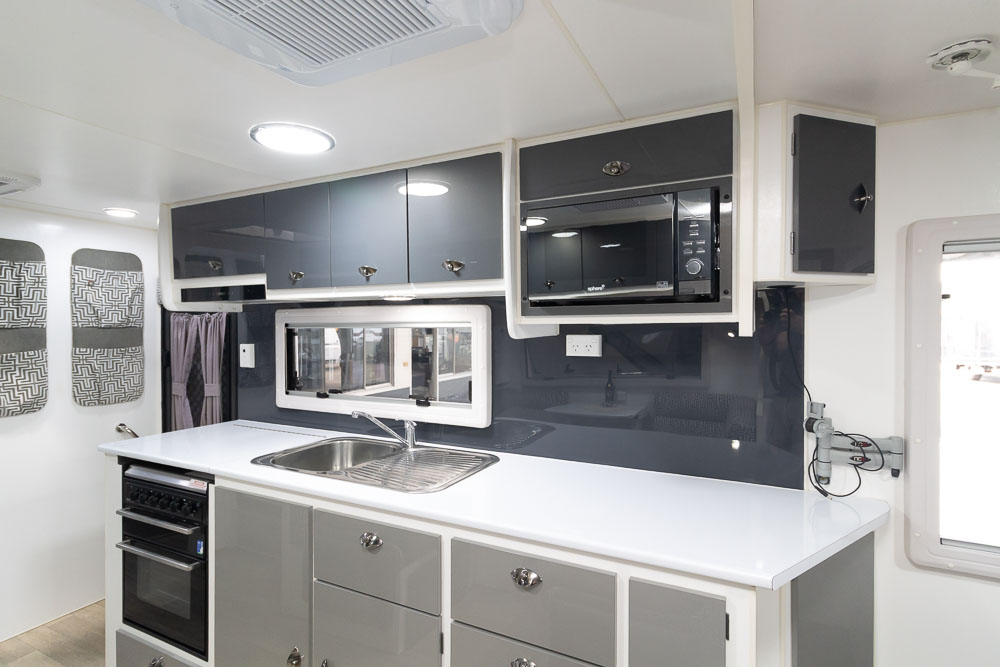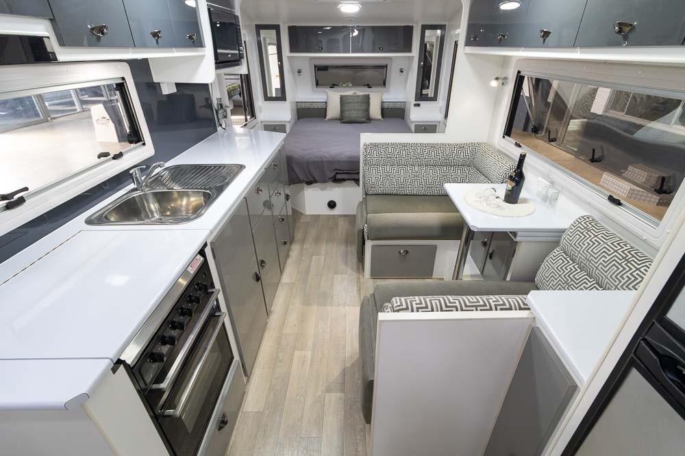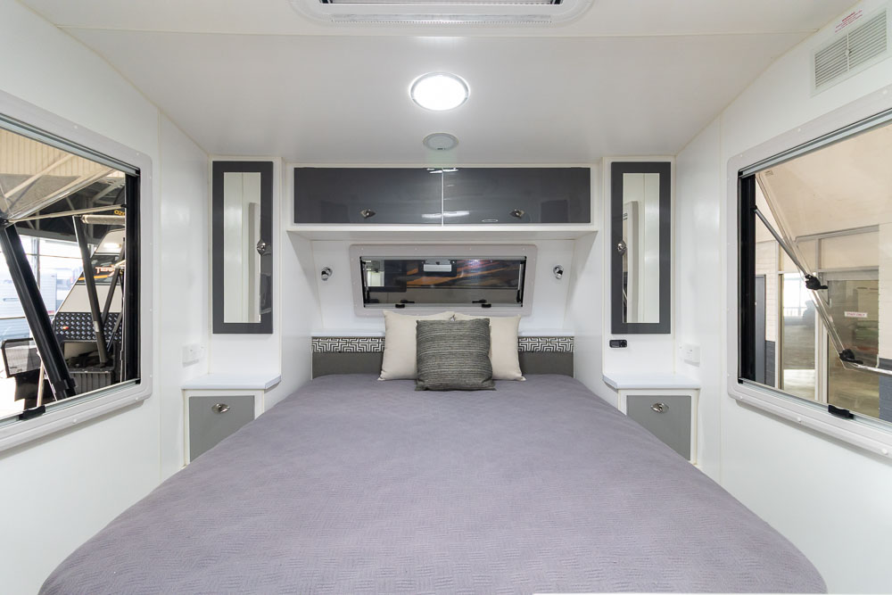 The front island bed creates a cosy, restful retreat, while the central café-style dinette and kitchen provide a social hub for meals, coffee breaks or simply planning your next adventure. The rear ensuite adds a touch of privacy and convenience, while the caravan’s spacious layout, abundant storage and included washing machine ensure you can travel comfortably and confidently with everything you need close at hand.