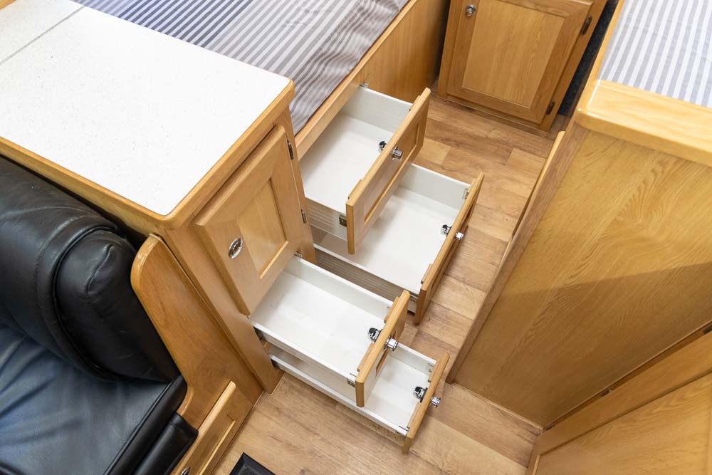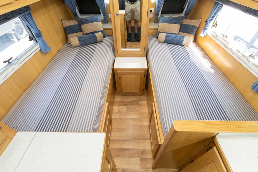 Inside, the layout has been thoughtfully designed for practical touring. The twin single beds at the front provide flexibility and comfort, with generous under-bed storage ideal for longer trips or bulky gear. Moving through the van, the central café-style dinette offers the perfect spot to unwind, share a meal, or plan your next destination, complemented by a versatile tri-fold table.