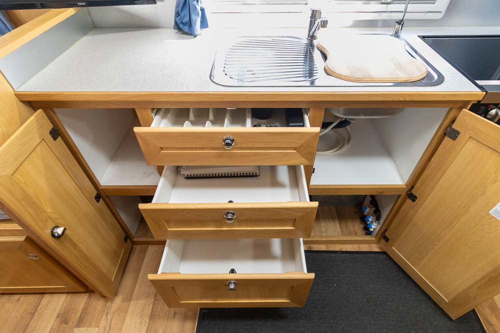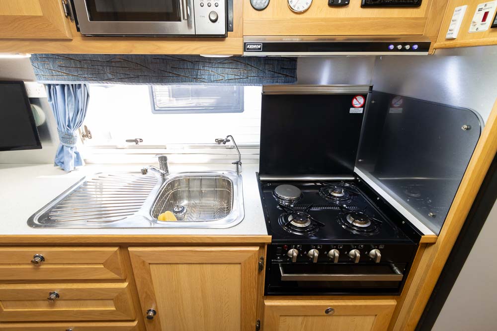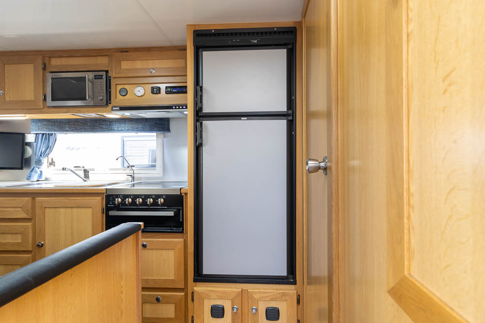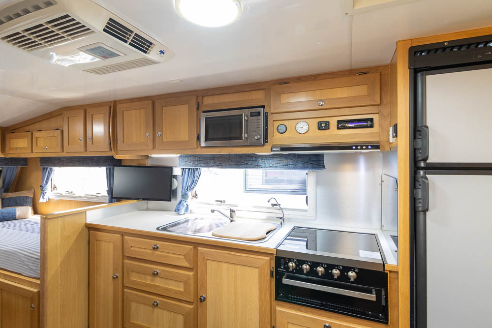 Opposite, the well-appointed kitchen ensures you’re fully equipped for life on the road, featuring ample bench space, a large sink, microwave, and a spacious two-door fridge/freezer. It’s a setup that makes remote travel feel effortless.