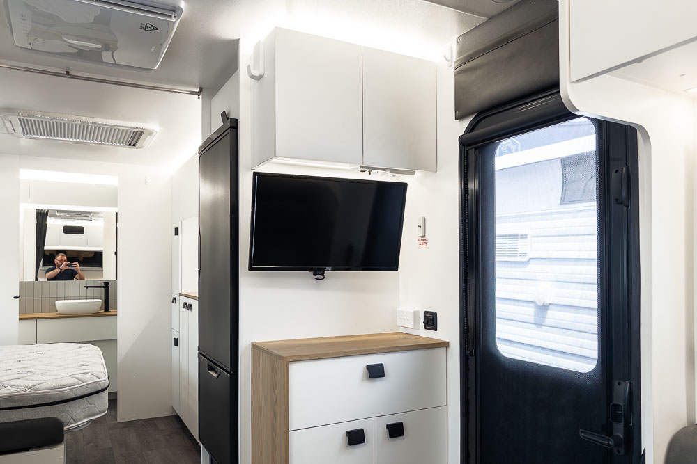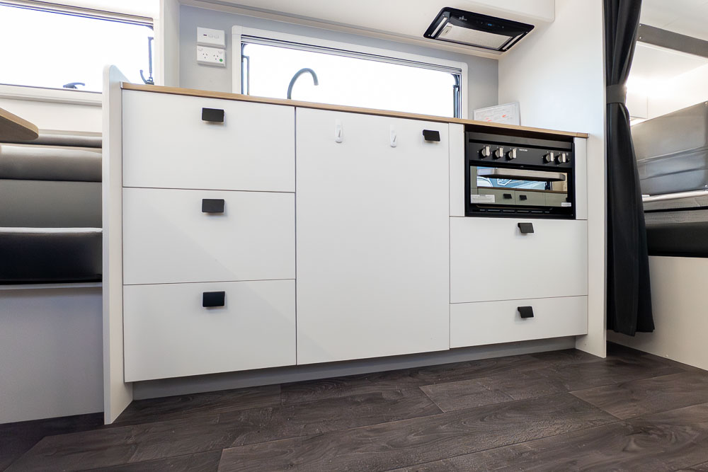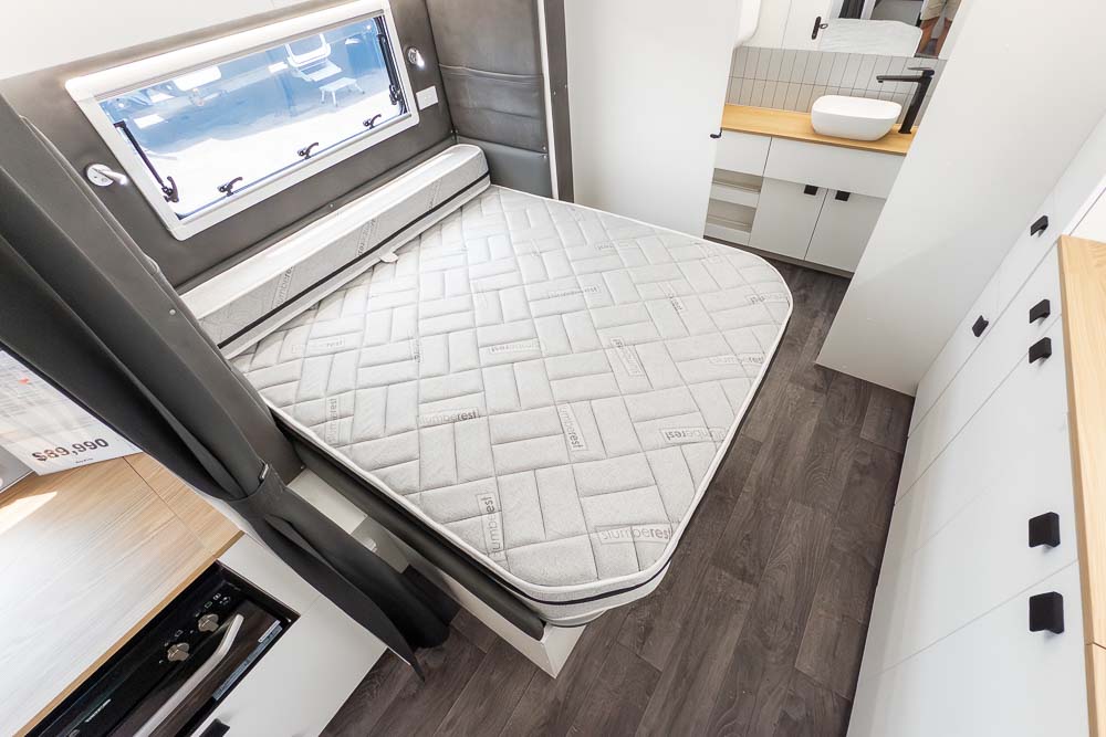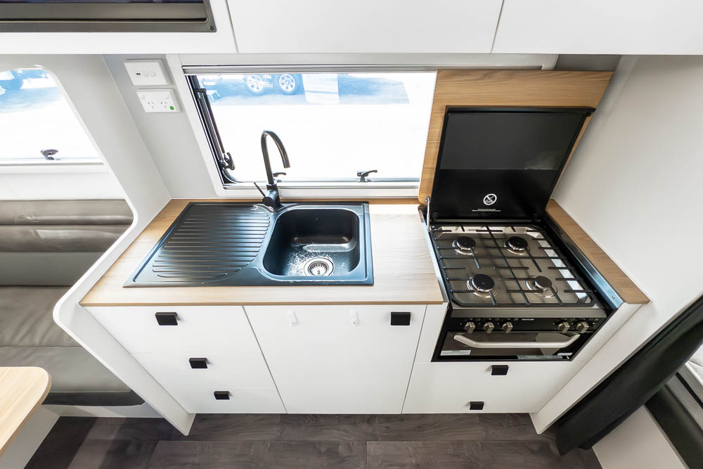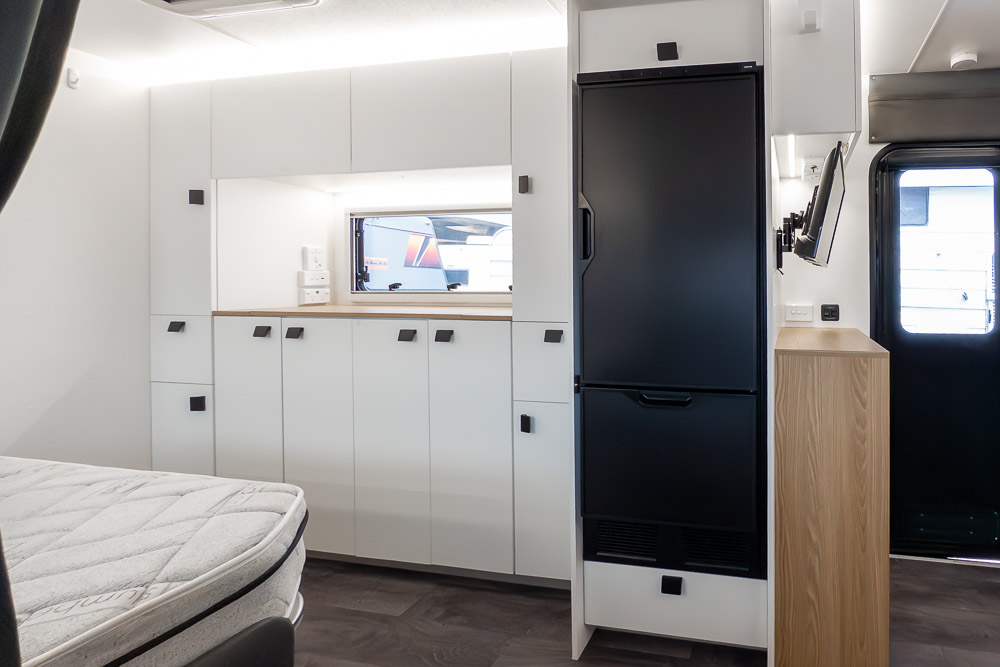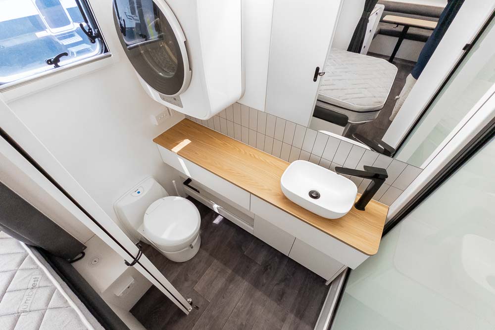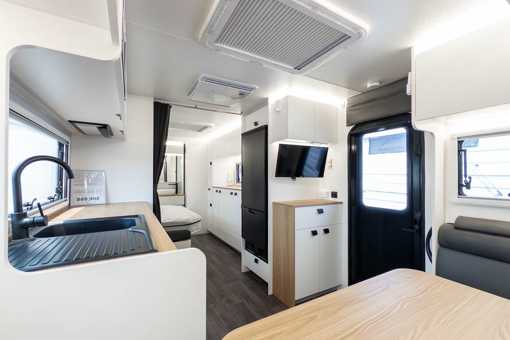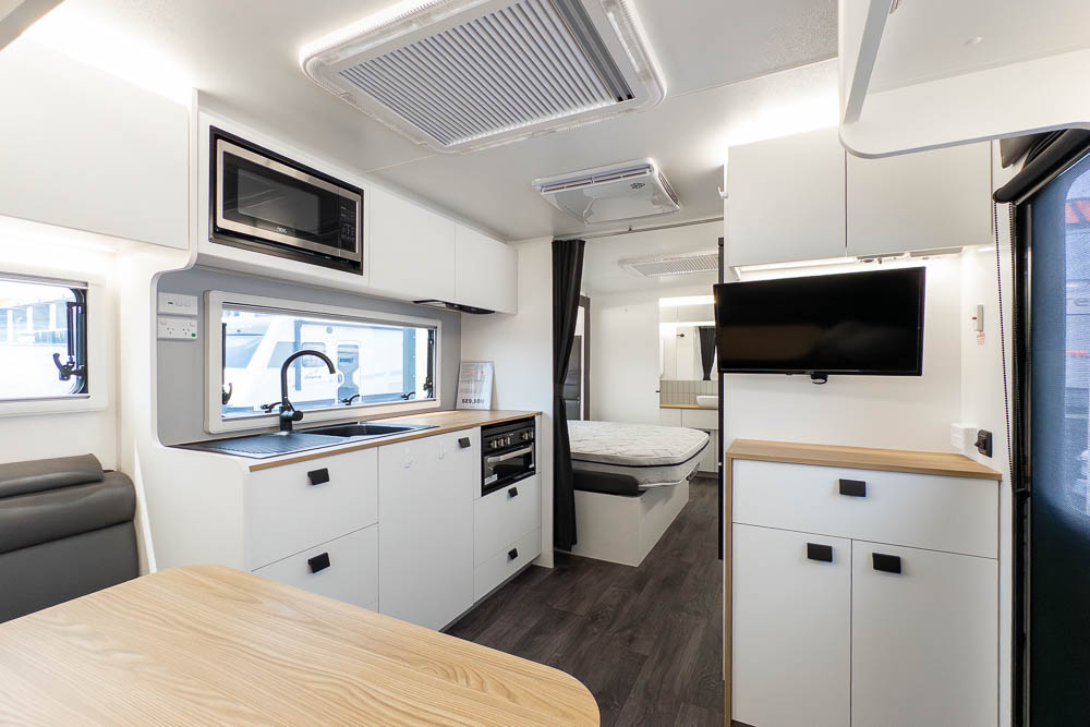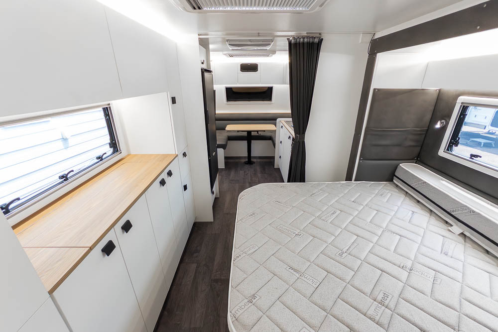 The central kitchen is well appointed with generous bench space, modern cabinetry and quality appliances suited to extended touring. Large windows, contemporary finishes and thoughtful lighting give the interior a bright, modern feel, while reverse-cycle air conditioning ensures comfort in all seasons.