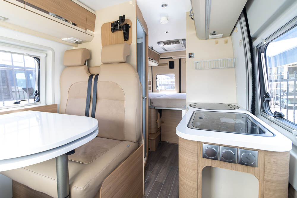 Up front, the Adria 600 Twin SP campervan features a practical four-person dinette lounge that benefits from swivel cab seats, creating a relaxed living and dining space within seconds. A smart inclusion is the dinette table bench extension, which adds a significant amount of usable table space. The open-plan design and generous headroom make moving through the cabin easy and comfortable.