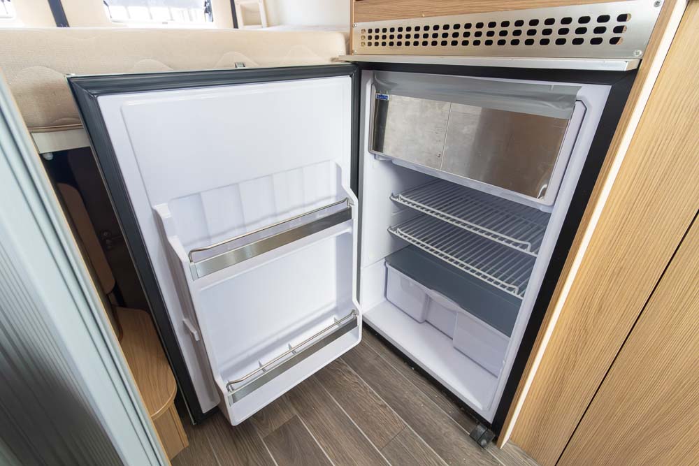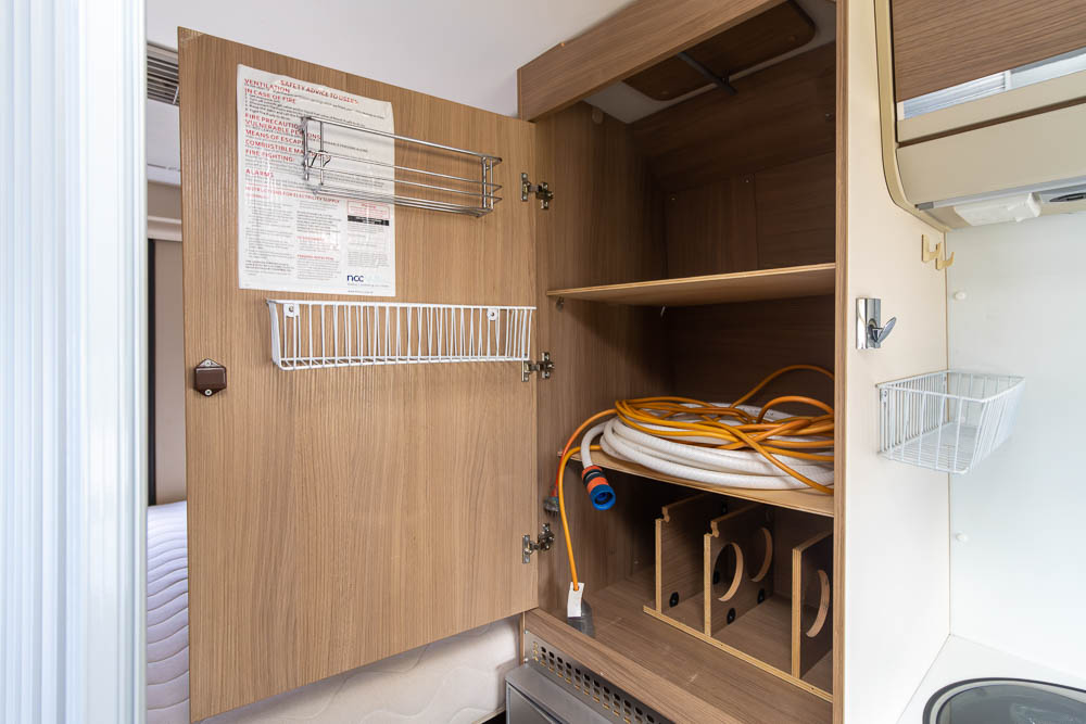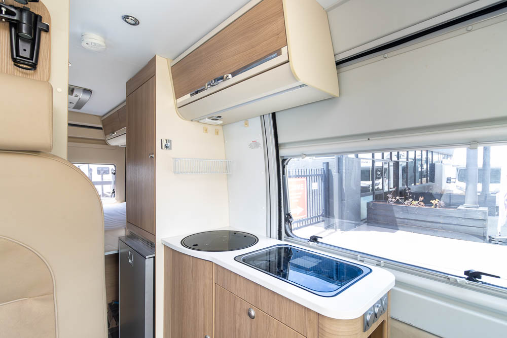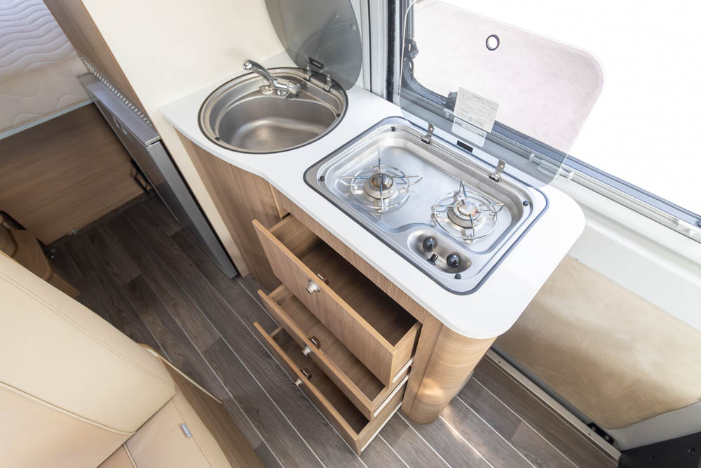 The central kitchen is compact yet well thought out, equipped with a sink and mixer tap, a two-burner gas cooktop and ample cabinetry and drawers for storage. A 12V fridge is positioned nearby, with a half-height wardrobe above for clothing and personal items.