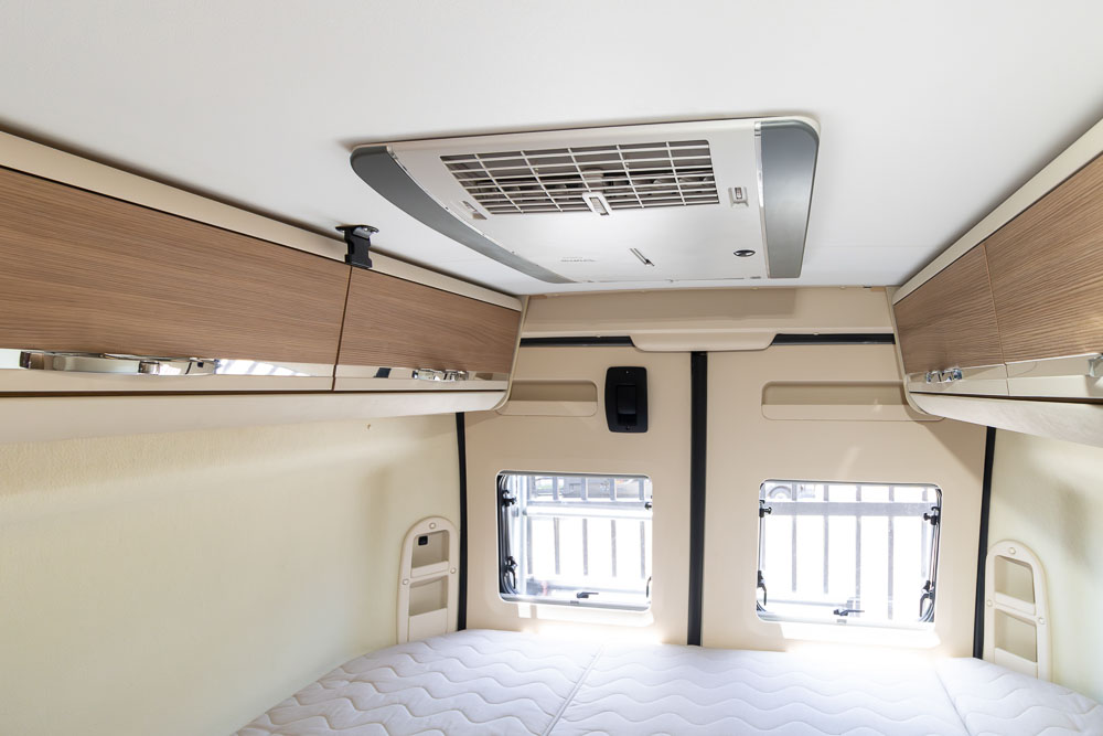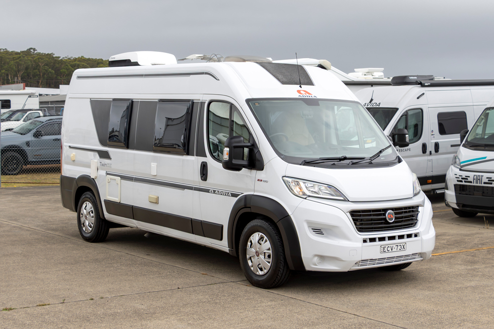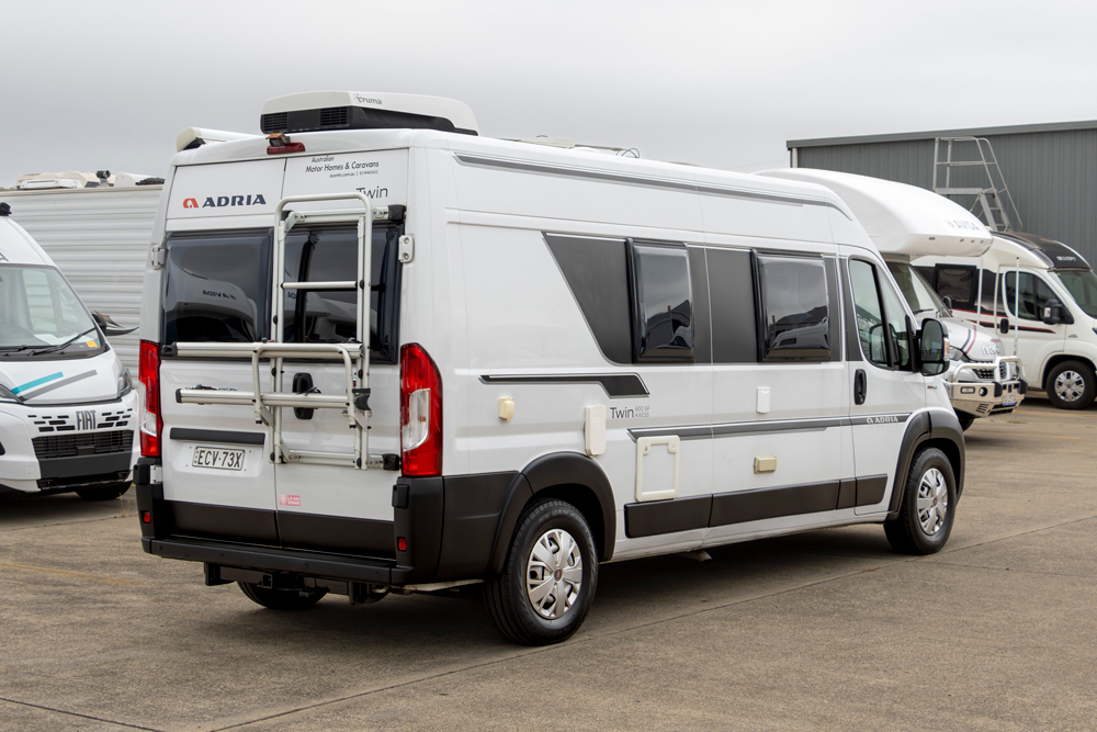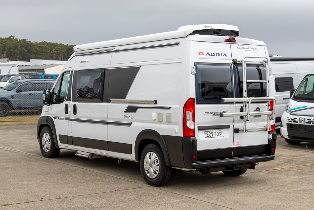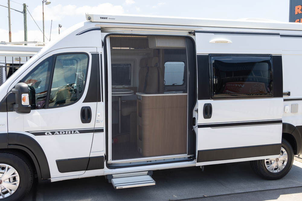 Externally, the Adria 600 Twin SP is set up for relaxed outdoor living, featuring 240V and USB outlets, a gas bayonet and the ability to run a TV under the roll-out awning. Additional features include a powered entry step, push-out windows with blinds and insect screens, a sliding flyscreen to the side door and a rooftop air conditioner.