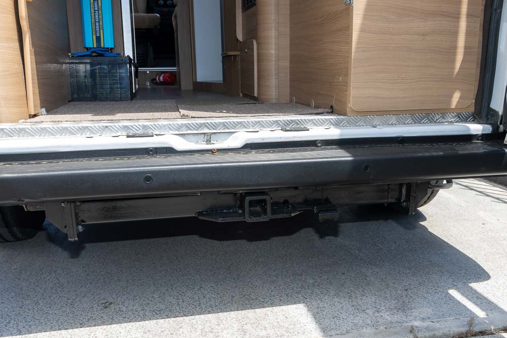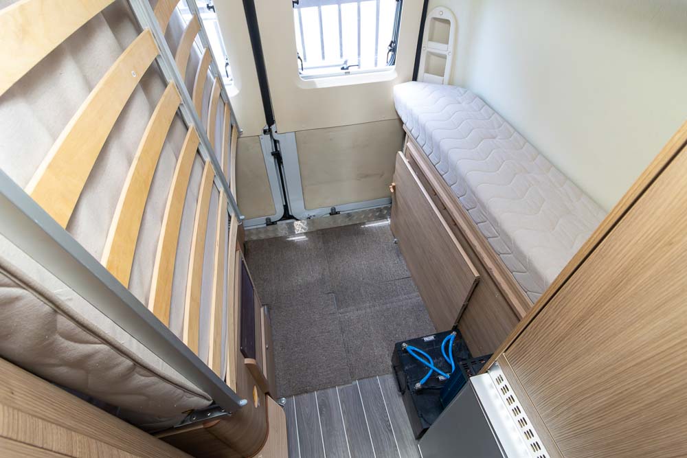 Opposite the kitchen is the combined shower and toilet, offering the convenience of an onboard ensuite without needing to step outside. At the rear, the fold-down bed deploys in seconds, revealing a comfortable space suitable for two adults. When the bed is stowed, the rear space opens up to accommodate bikes or larger items.
