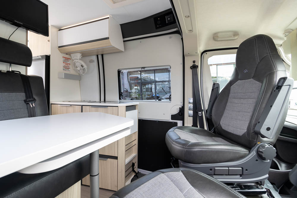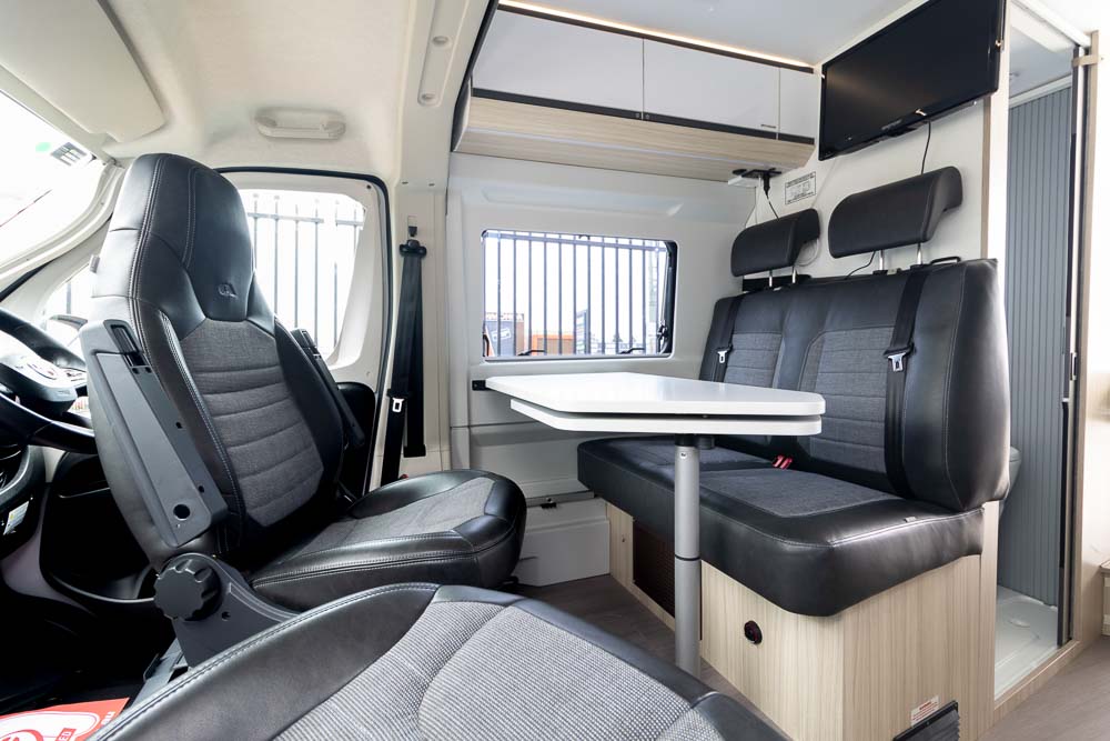 Up front, the cabin quickly transforms into a welcoming lounge thanks to the swivel driver and passenger seats. The four-person dinette provides a comfortable setting for meals or relaxing, enhanced by a clever table bench extension that significantly increases usable surface area. It’s a simple but effective design that makes everyday living easier.