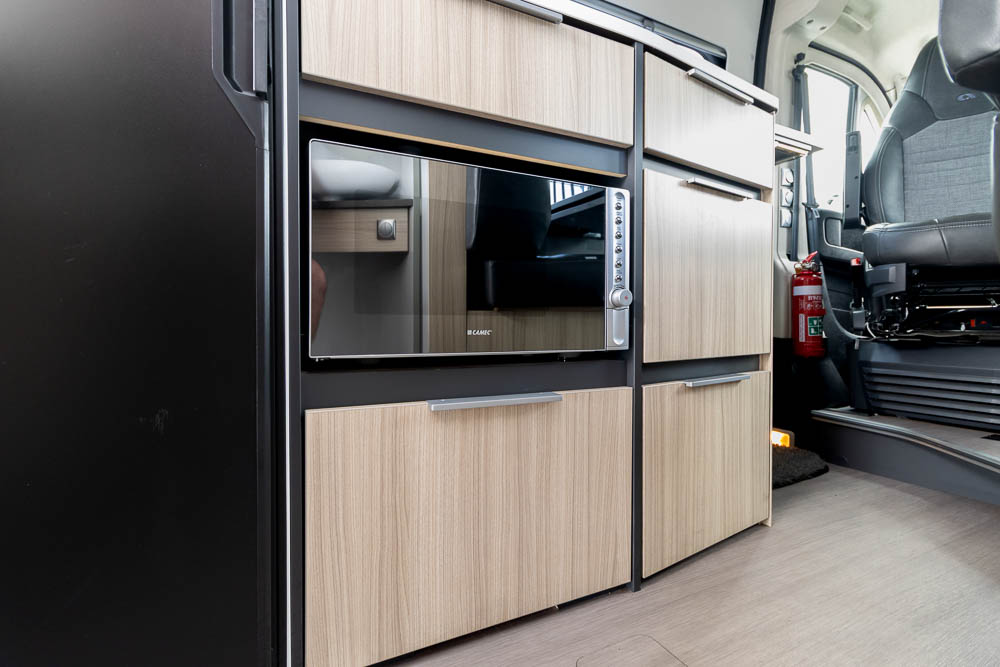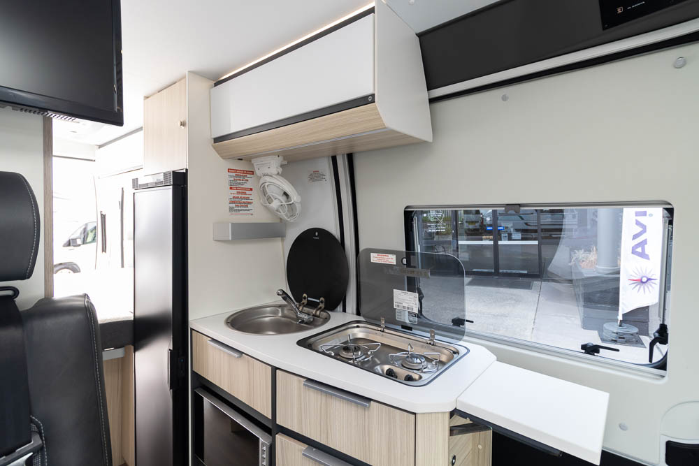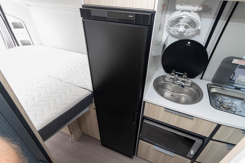 The centrally positioned kitchen is compact yet efficient, fitted with a two-burner gas cooktop, sink with mixer tap, microwave and a generous 12V fridge. Storage has been carefully considered, with cabinetry and drawers positioned for easy access.