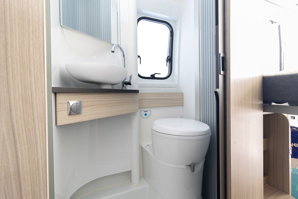 Opposite, the combined shower and toilet ensures complete self-sufficiency, allowing you to travel confidently without relying on park amenities.