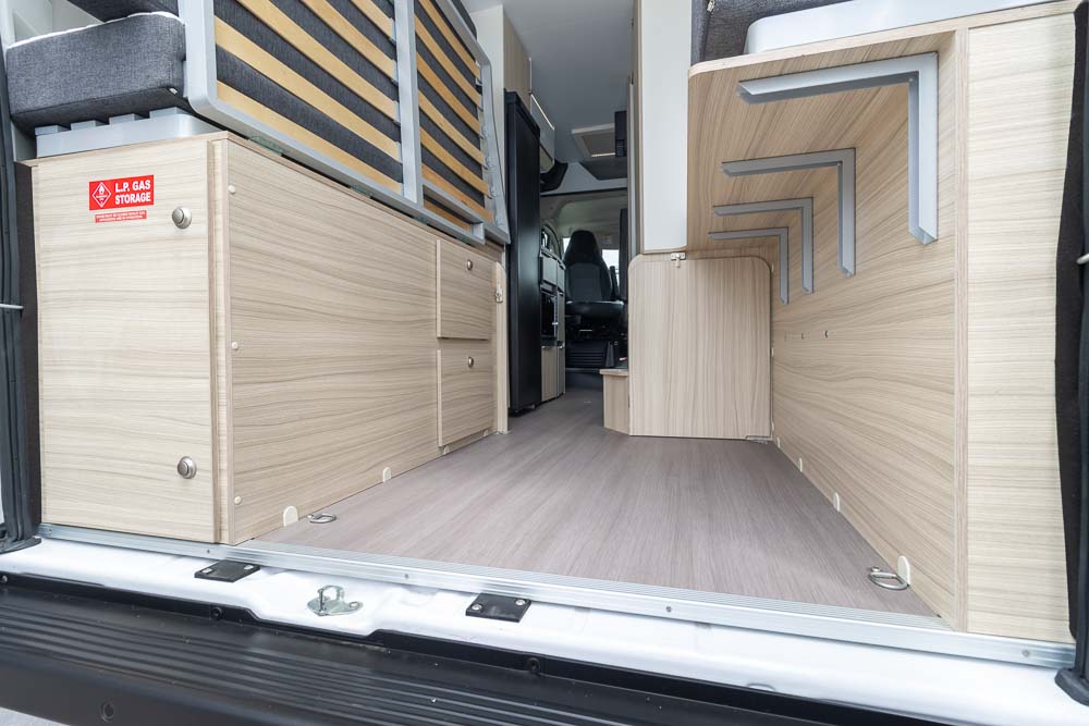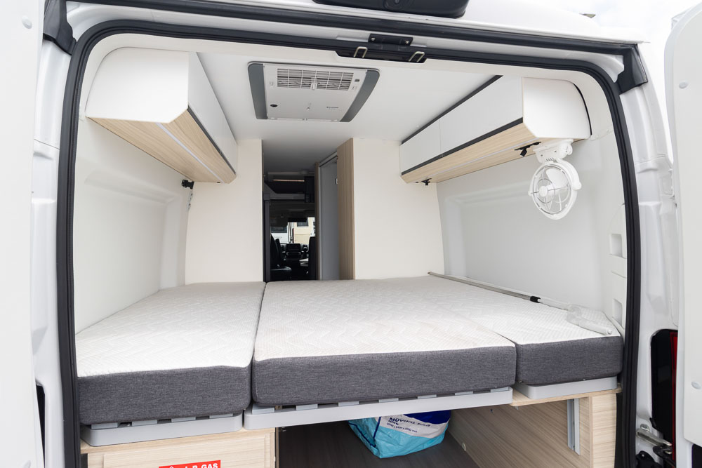At the rear, the fold-down double bed sets up quickly to create a comfortable sleeping space for two adults. When lifted away, the rear compartment opens into a highly usable storage zone — ideal for bikes, outdoor gear or larger touring essentials. This dual-purpose design is one of the Twin SPB’s most practical strengths.
