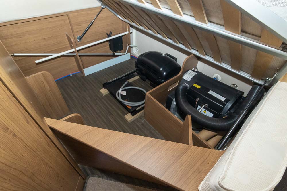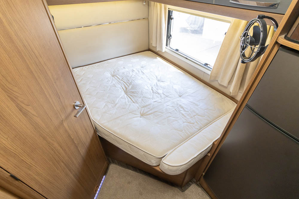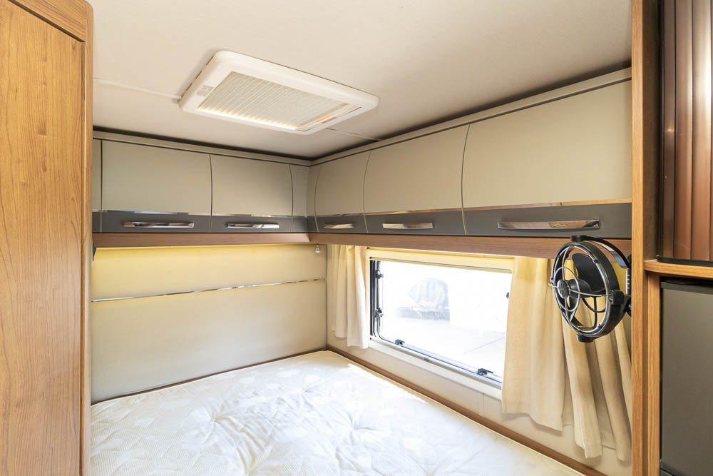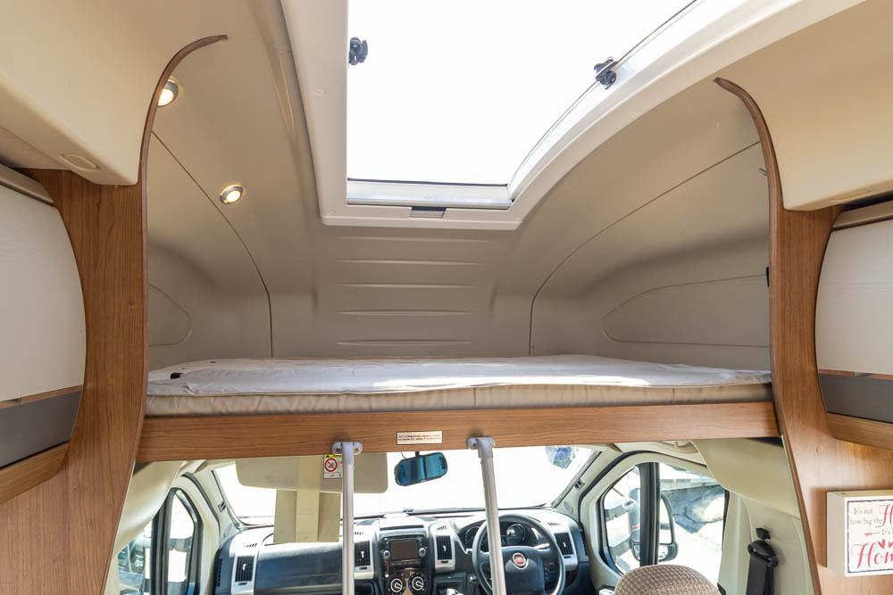 In the rear, the French bed provides a comfortable main sleeping space complete with overhead cabinetry, a wardrobe and a window hatch for natural light. An additional over-cab bed offers further sleeping room for family or guests.