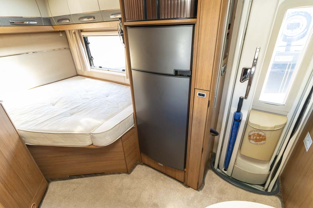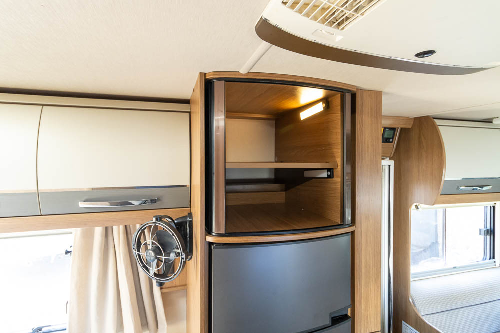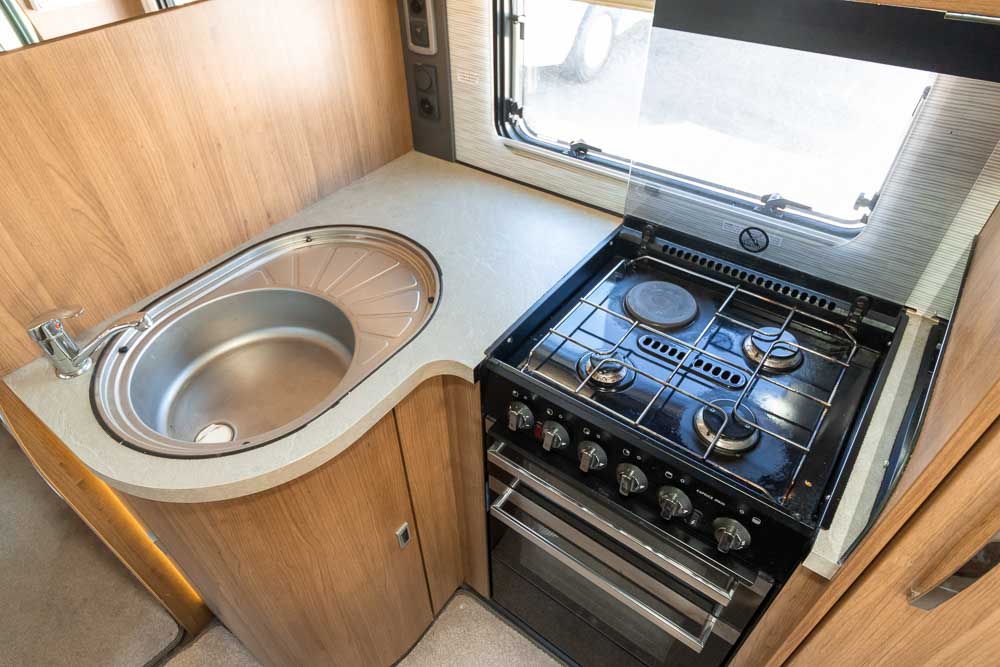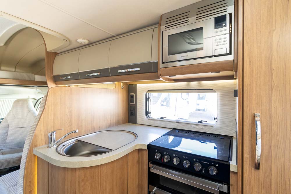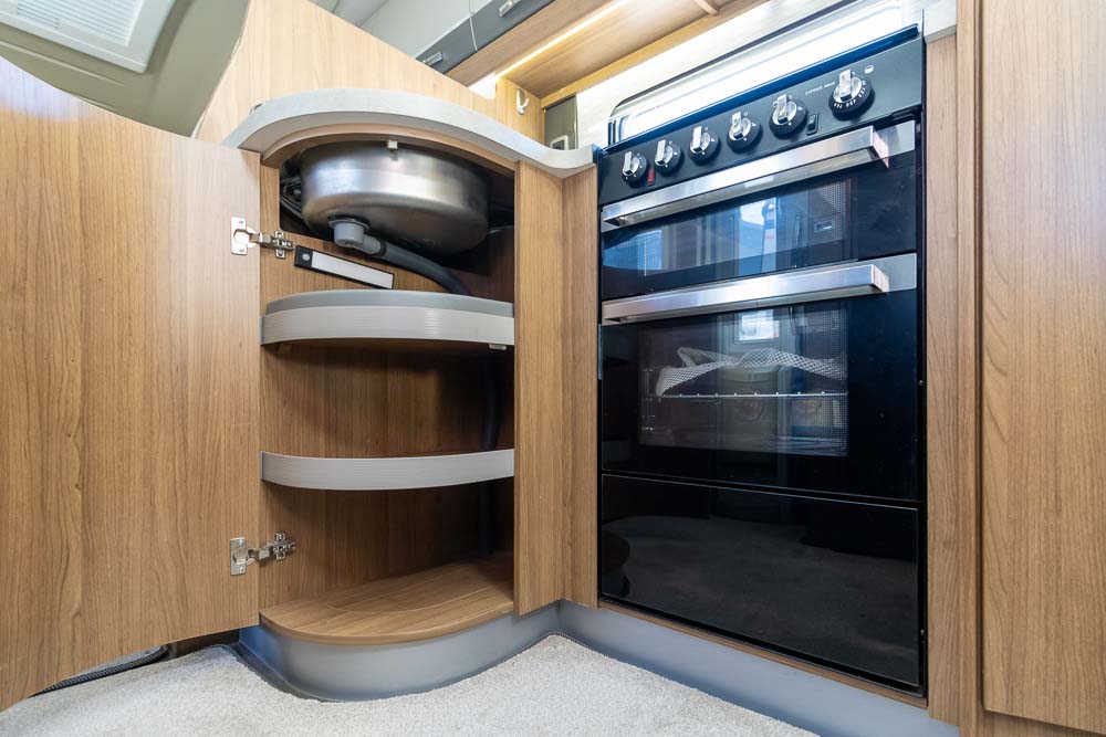 The kitchen is highly specified for travellers who enjoy preparing meals on the road. It includes a dual-fuel hob with a grill and oven, a microwave, a full sink with drainer and a fridge with separate freezer. Ample cupboards and lockers ensure everything has a place.