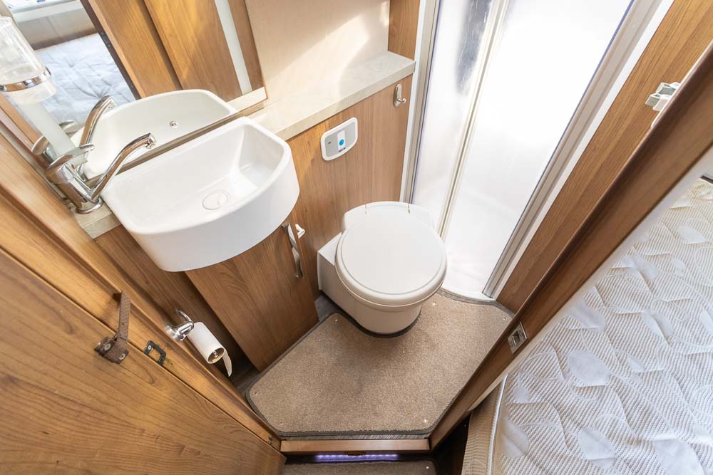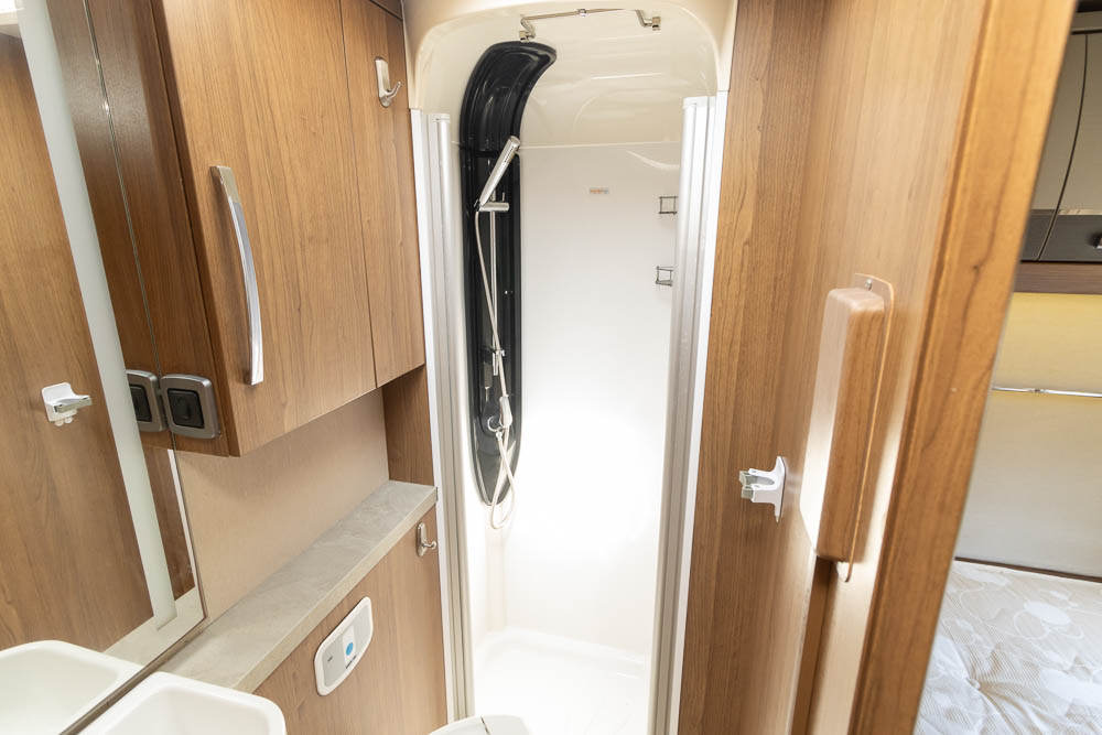 The bathroom is surprisingly spacious, featuring a separate shower cubicle with double doors, a handbasin with mixer tap, a Thetford cassette toilet and built-in storage cabinets. Comfort is assured year-round with a Truma Combi heating and hot water system along with the roof mounted air-conditioner.