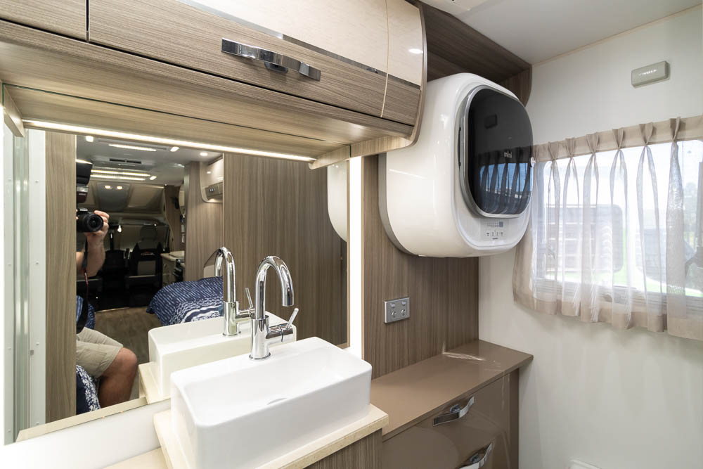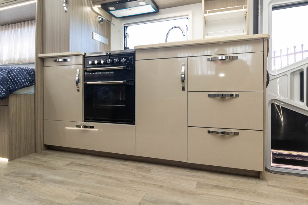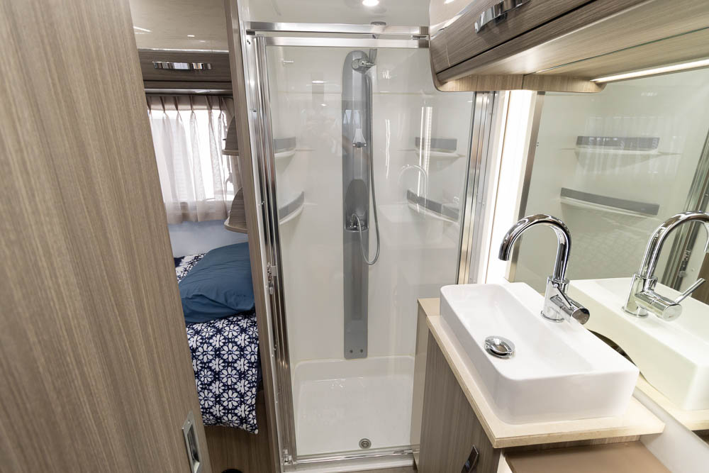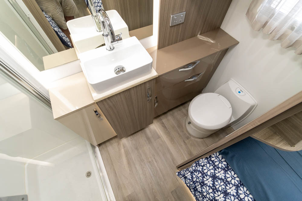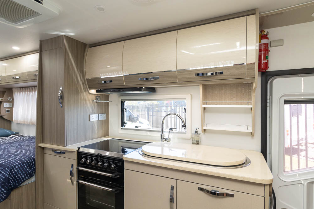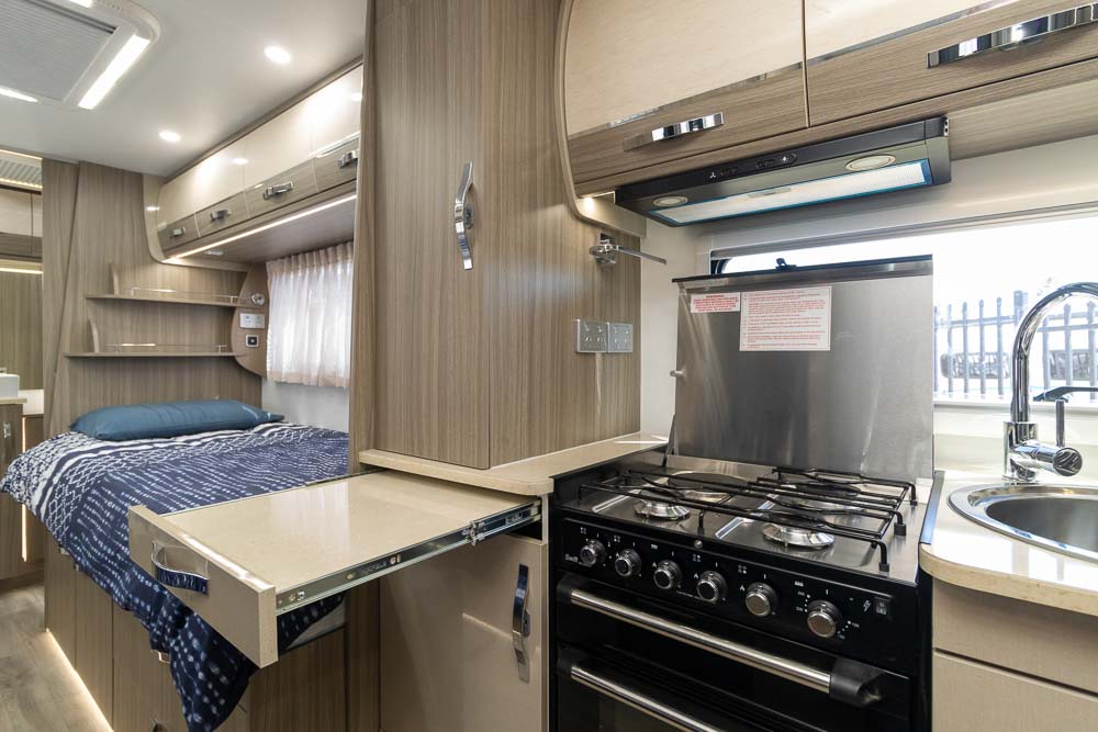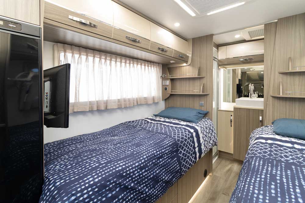 The kitchen is a highlight, offering modern appliances and cleverly hidden bench extensions that provide extra preparation space when required. This thoughtful design makes meal preparation easy whether you’re cooking for one or entertaining guests. Moving toward the rear, the motorhome features twin single beds along each side, offering independent sleeping arrangements and flexibility for couples or solo travellers.