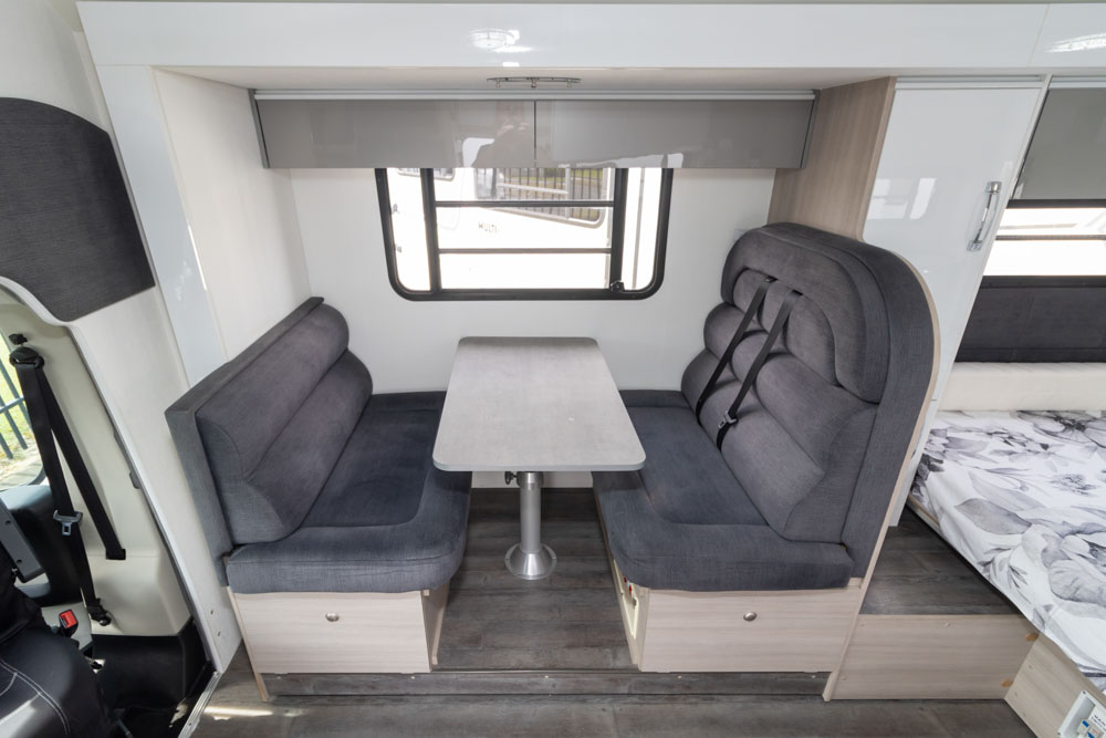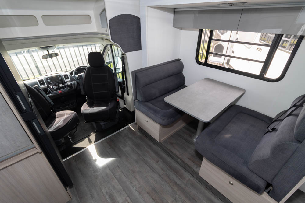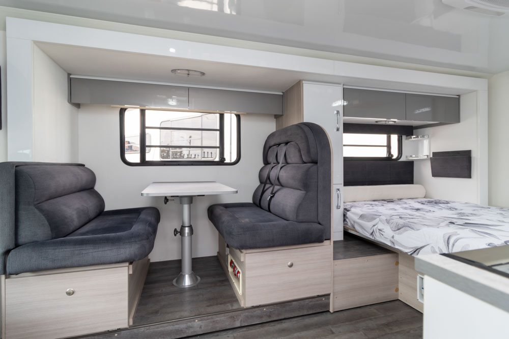 A generous slide-out expands the interior, creating a roomy lounge and dining zone with café-style seating and a central table. Overhead cupboards and a wardrobe offer smart storage solutions, while the rear of the slide-out is home to the comfortable island bed – a welcoming retreat after a day of exploring.