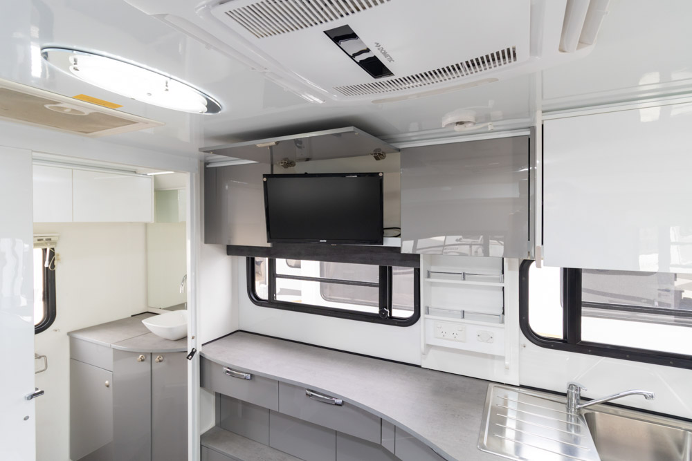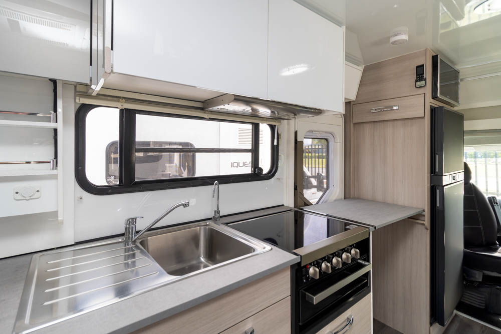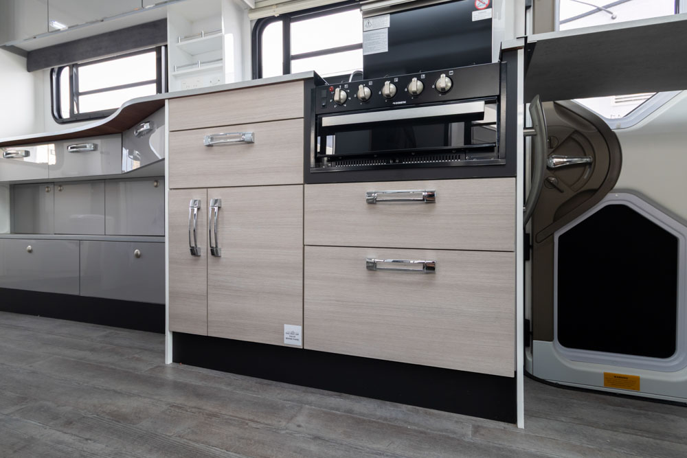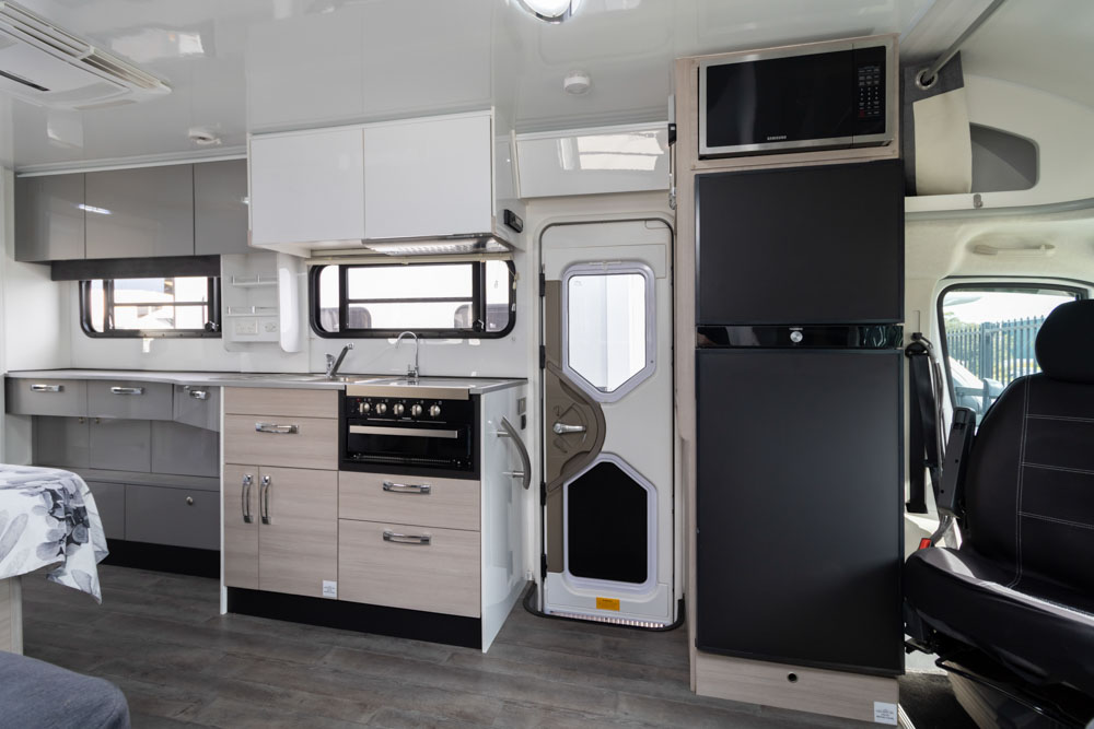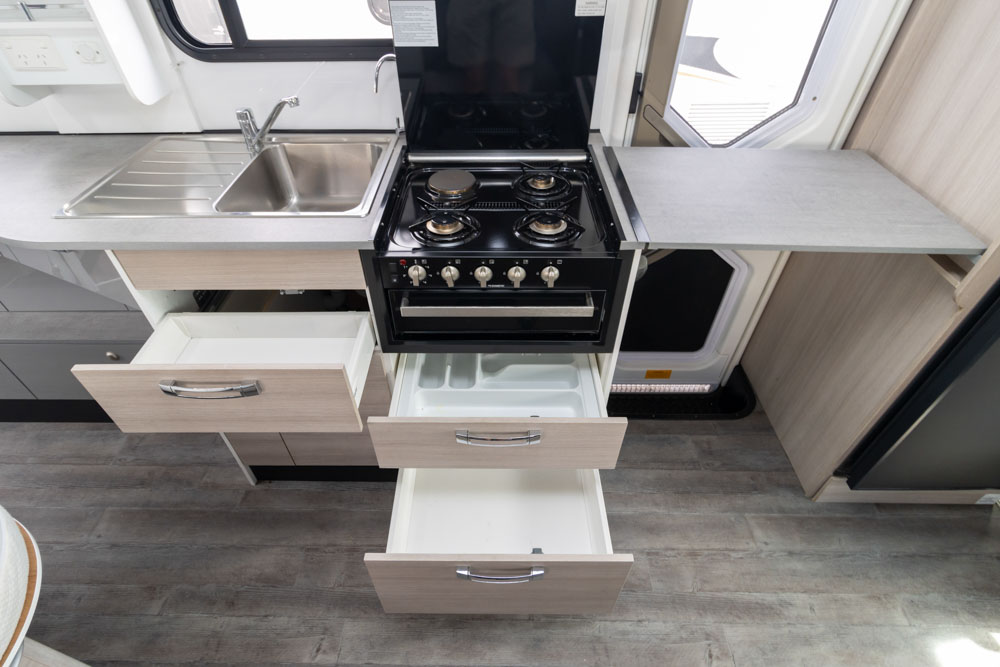 Step inside to find a bright, thoughtfully designed living space. The kitchen is positioned by the entry door and features a 4-burner gas stove with grill, sink, plenty of storage drawers and cupboards, plus a bench extension that adds extra prep space. A 3-way fridge and overhead microwave complete the cooking setup, keeping your meals simple and convenient while travelling.
