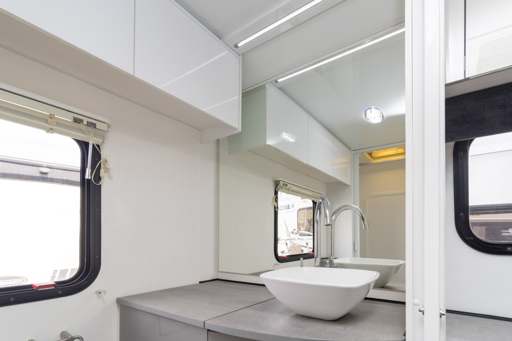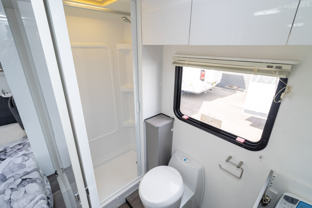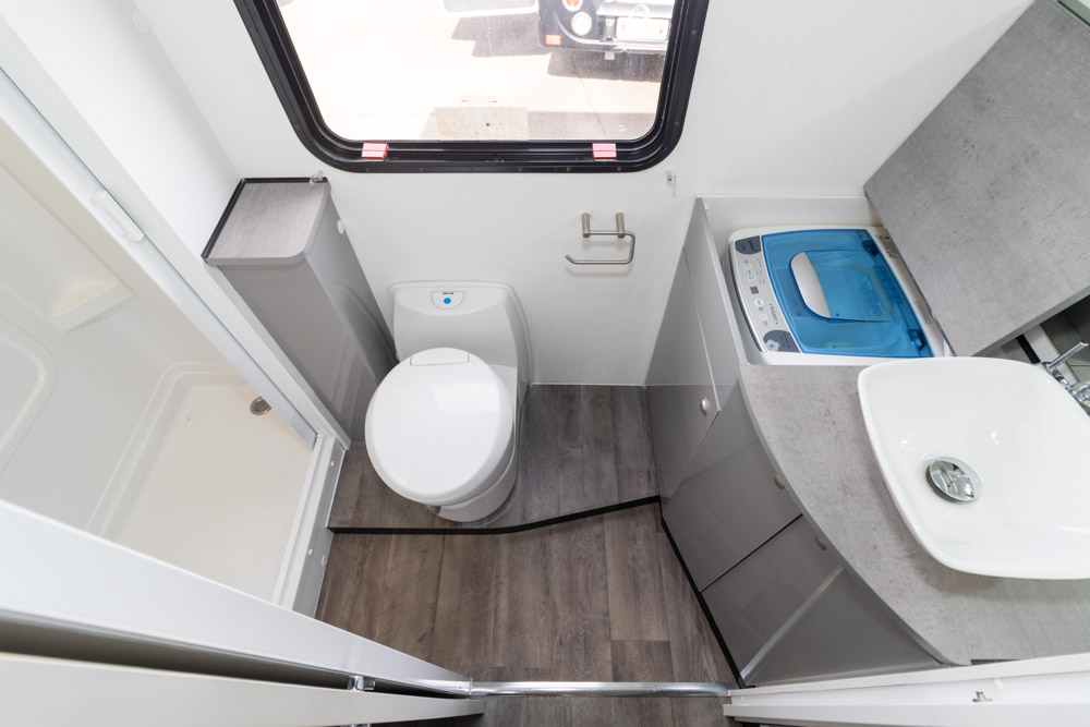 The rear bathroom is designed as a fully dry setup, featuring a separate shower, toilet, basin, mirror and handy storage for toiletries. A top-load washing machine is cleverly integrated beneath the benchtop, adding practicality for longer trips.