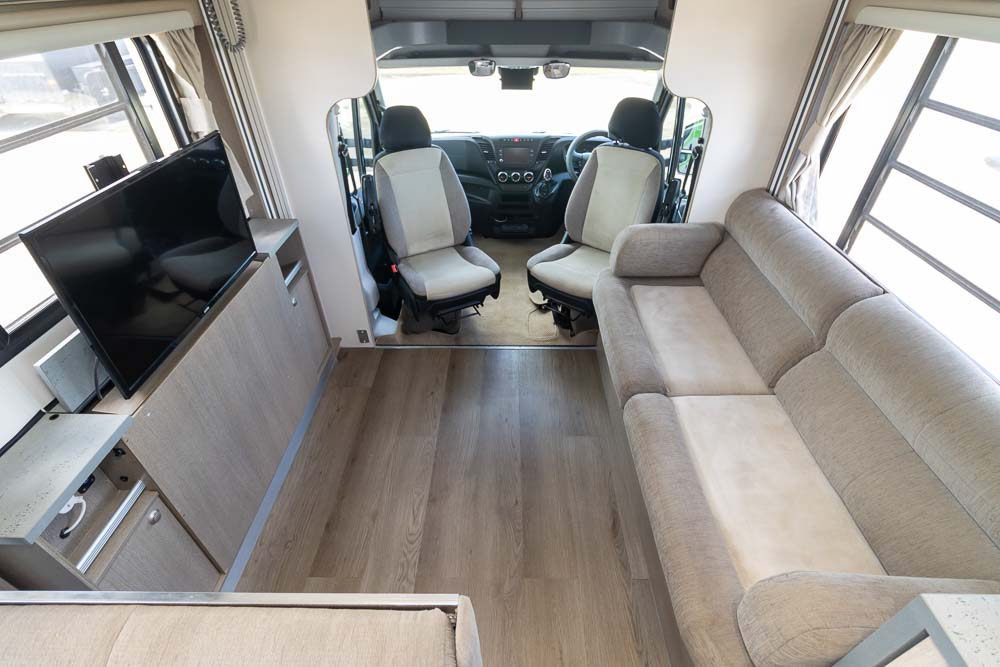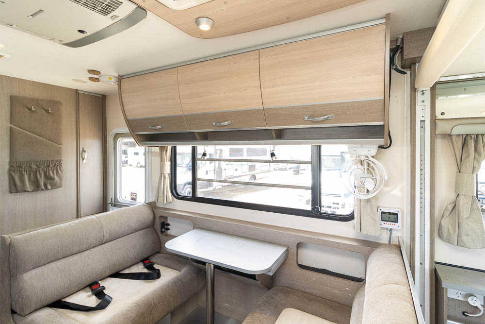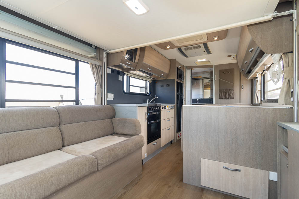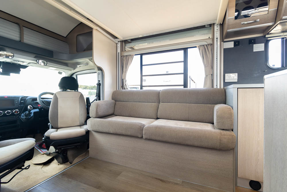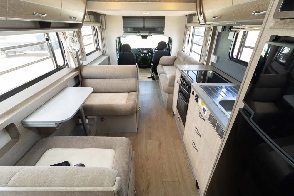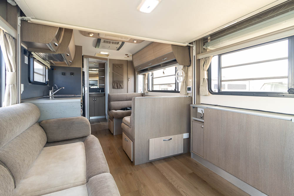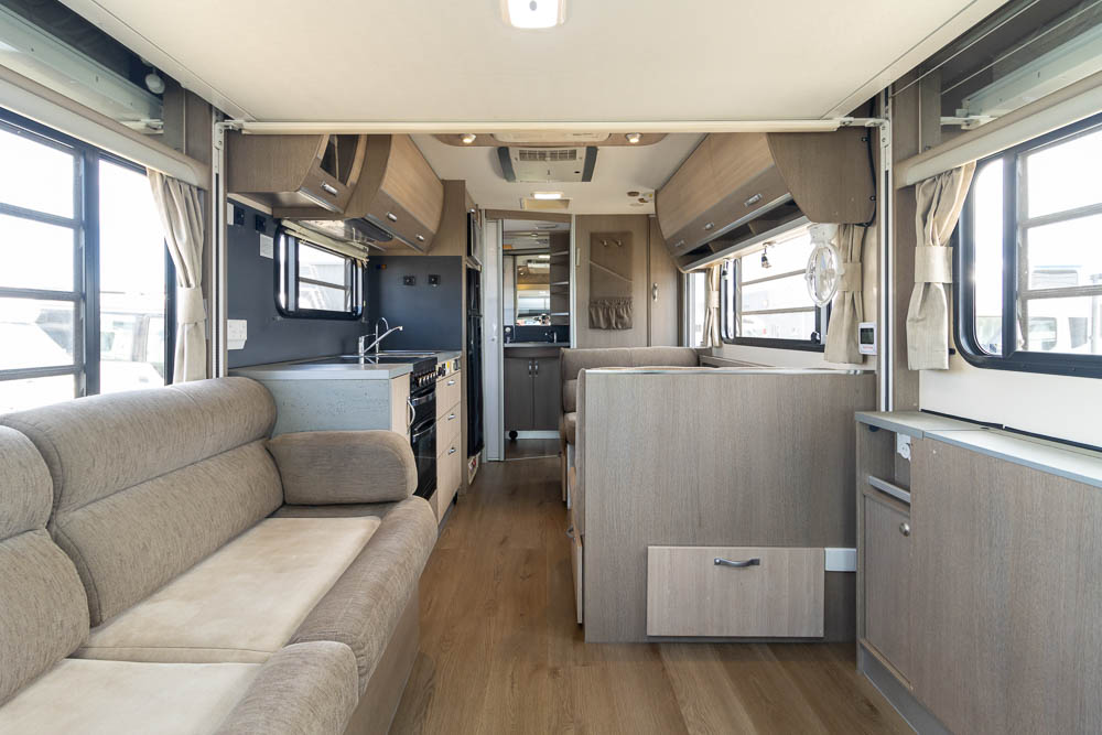 This motorhome’s clever dual sitting areas offer real flexibility – ideal for enjoying a morning coffee in one space while someone else relaxes or reads in the other. The well-equipped kitchen and considered storage solutions ensure daily living is easy and enjoyable.
