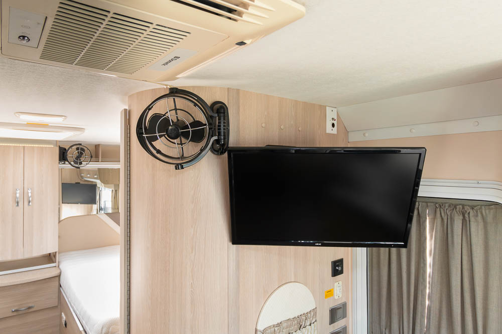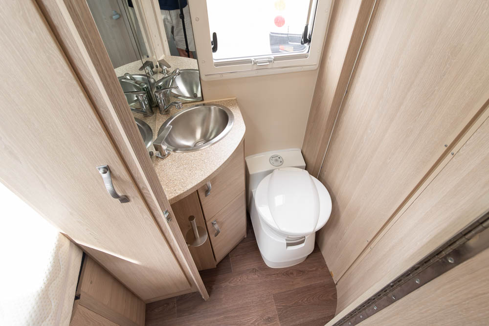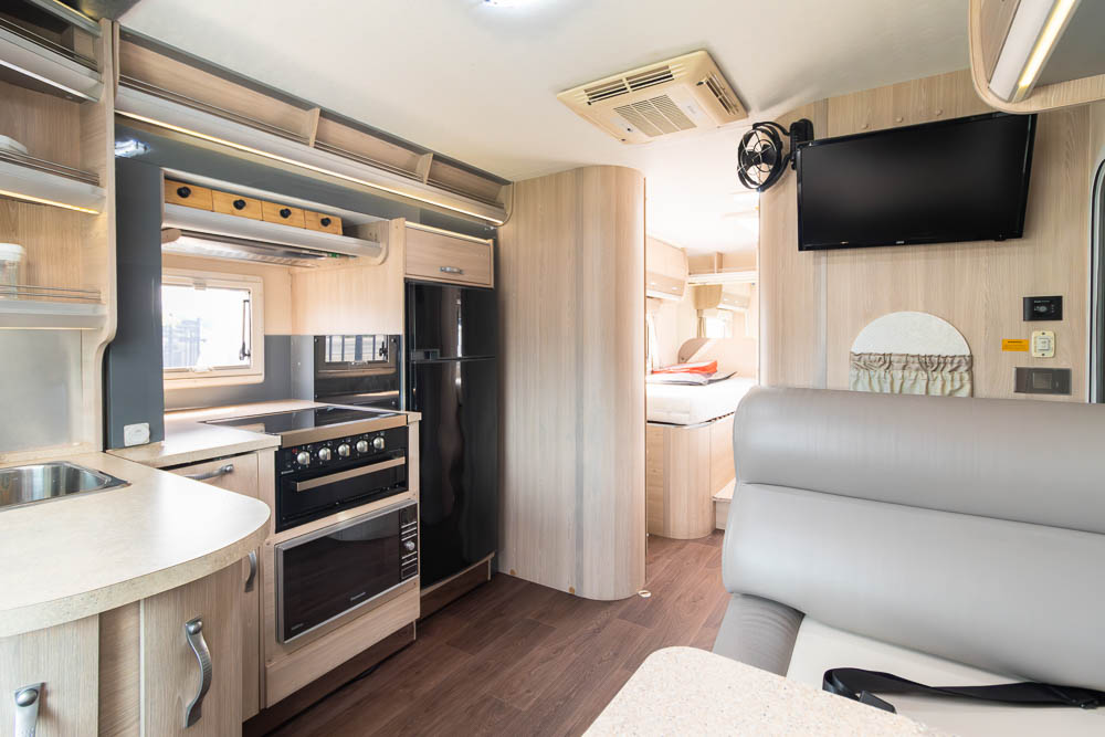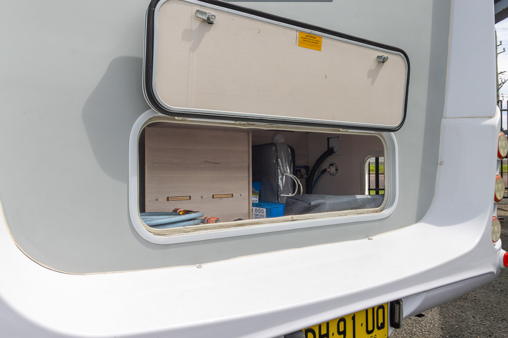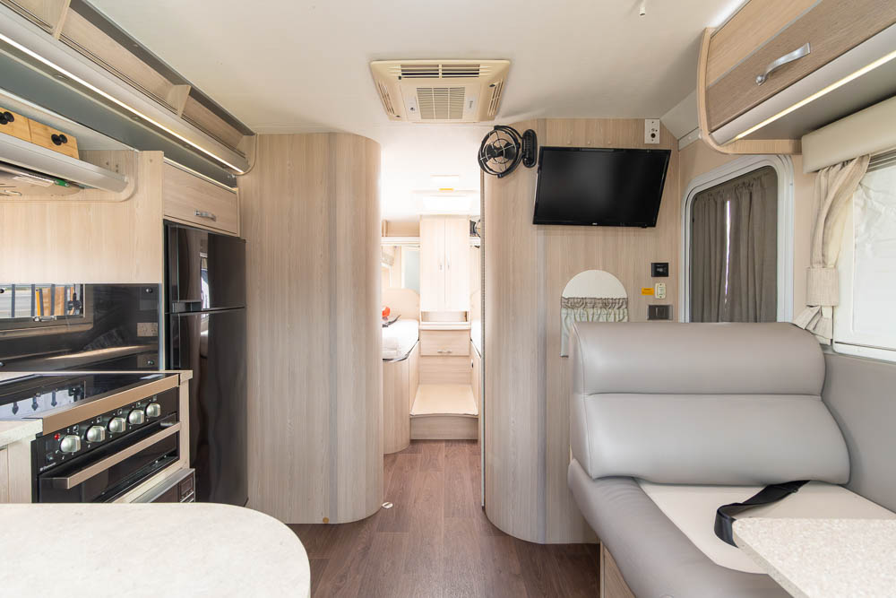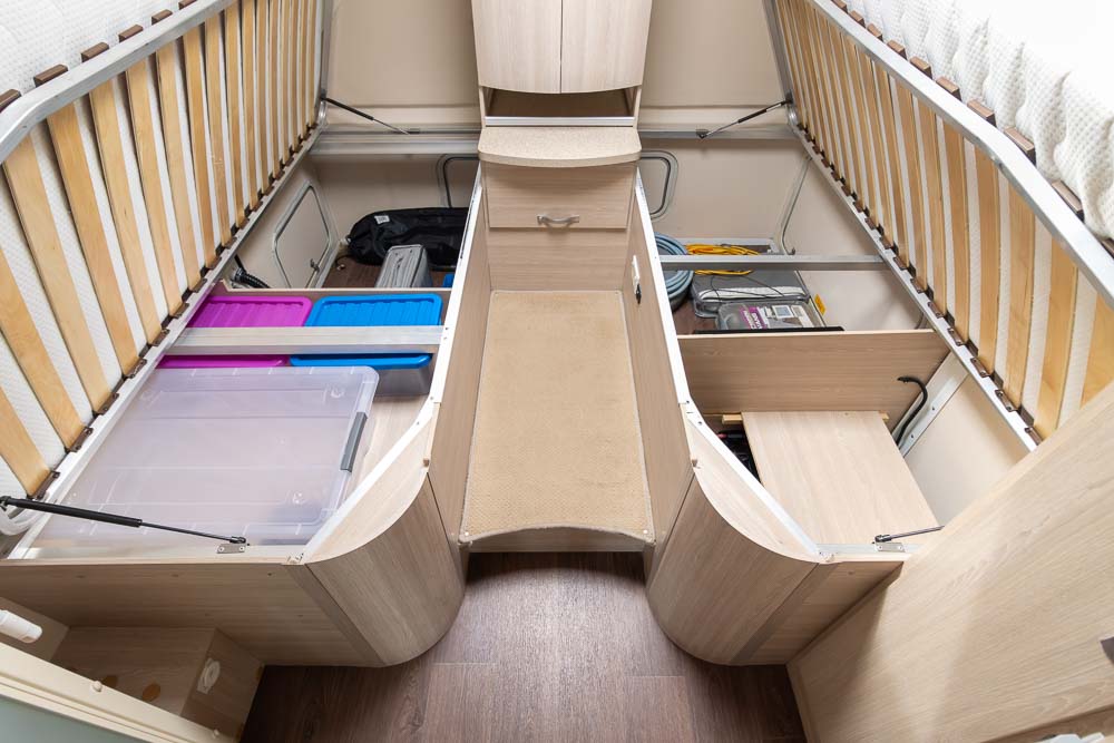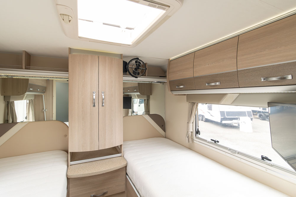 At the very back, you’ll find twin single beds; ideal for easy access and a comfortable night’s sleep. A centrally positioned wardrobe, along with drawers and overhead cupboards, provides ample storage for longer trips.
