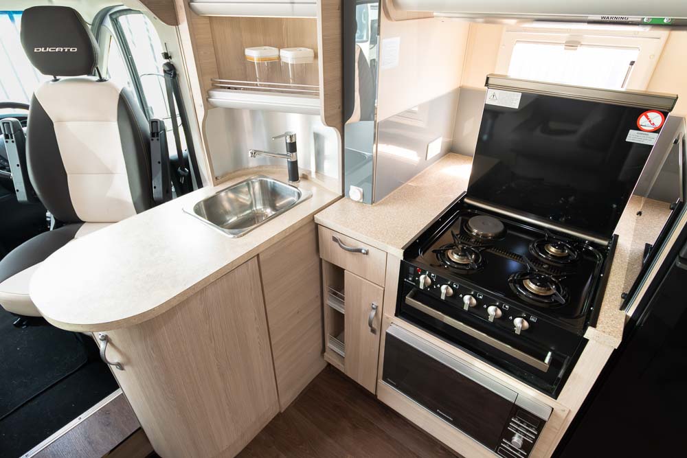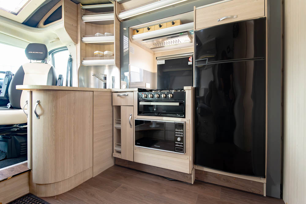 A: You’ll find a stove, sink, microwave, range hood and a two-door three-way fridge, along with generous storage.