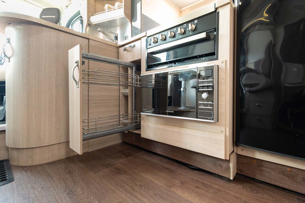 The L-shaped kitchen is both practical and spacious, positioned within the slide-out for maximum usability. It includes a sink, stove, two-door three-way fridge, microwave, range hood and plenty of storage. Everything you need to cook comfortably on the road.