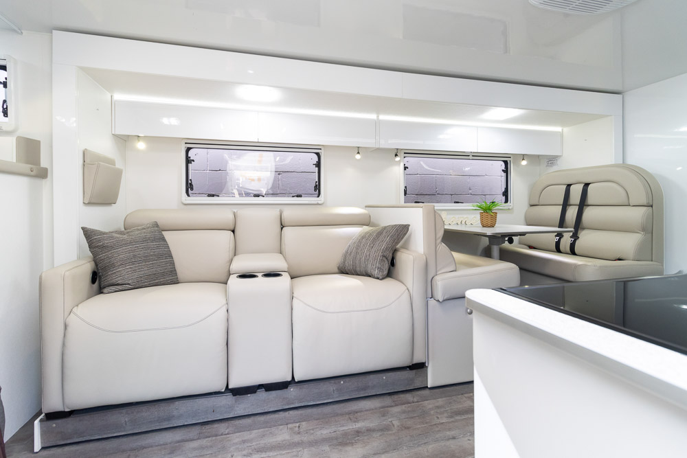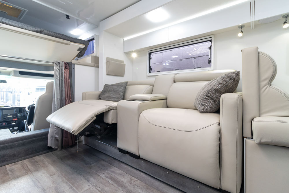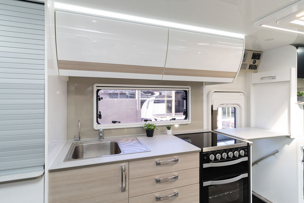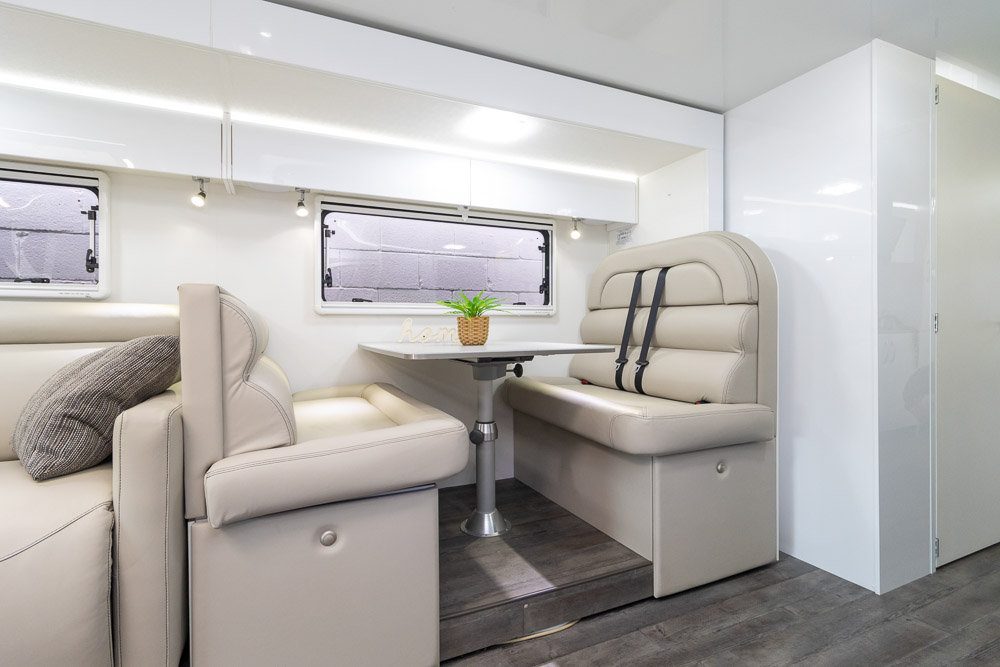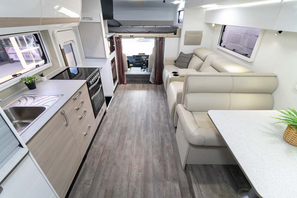 - Luxury touring interior with leather seating, Pebble benchtops and gloss cabinetry