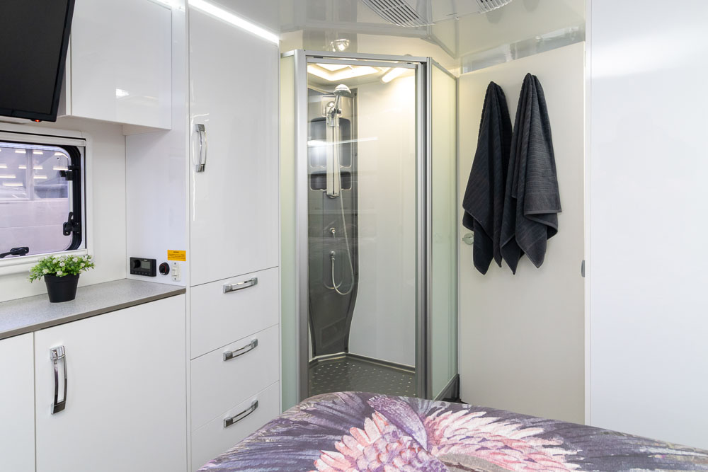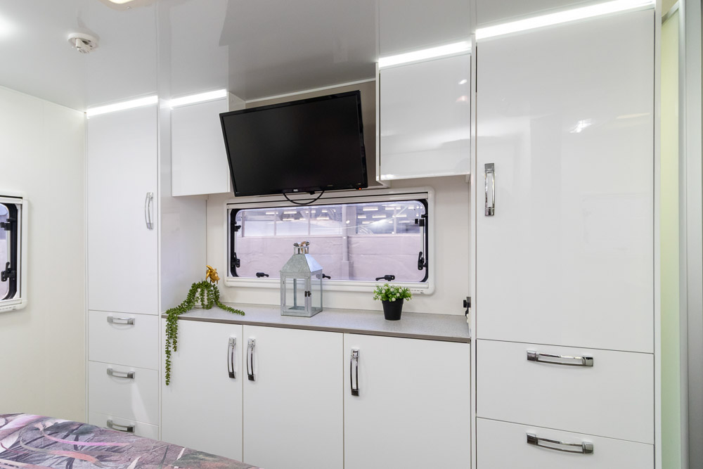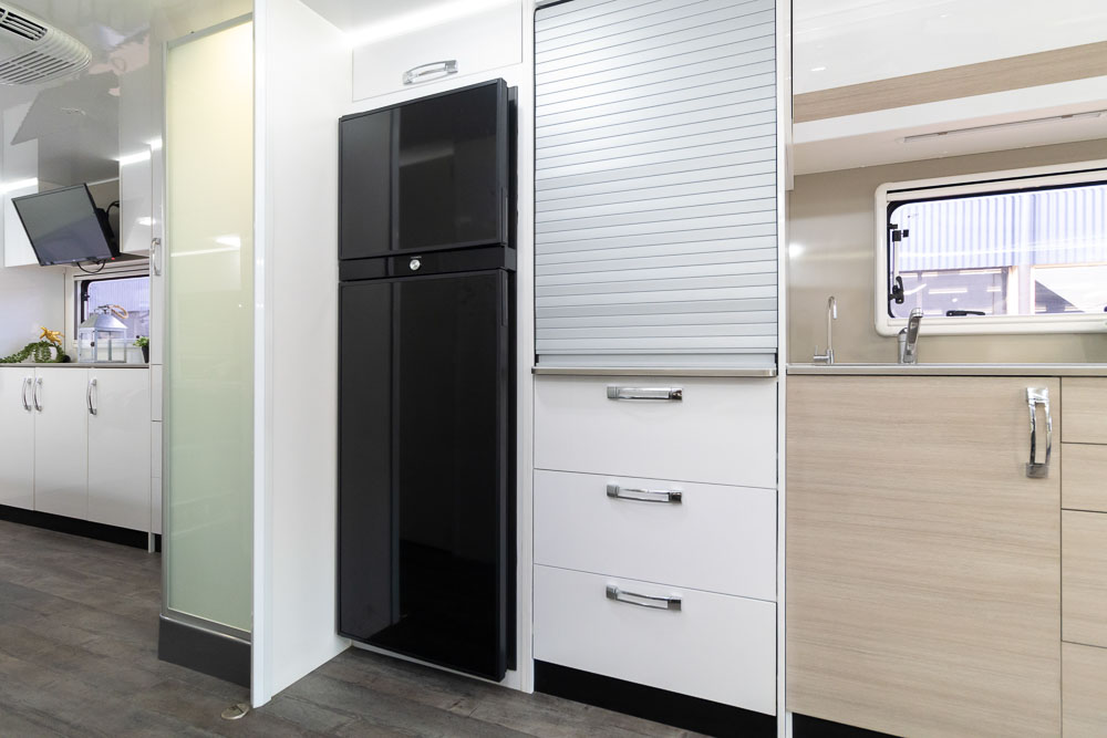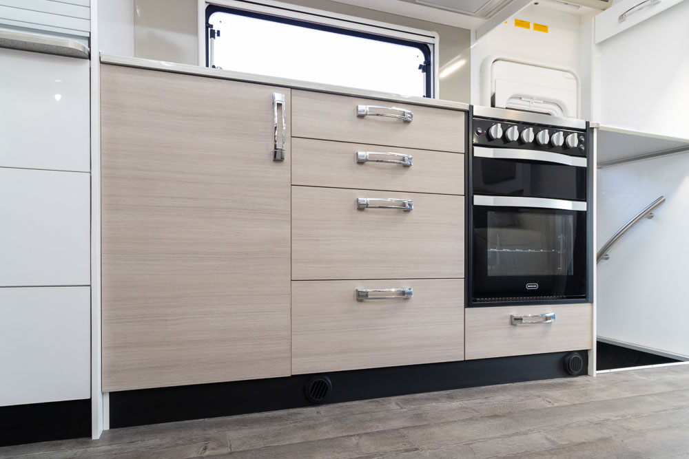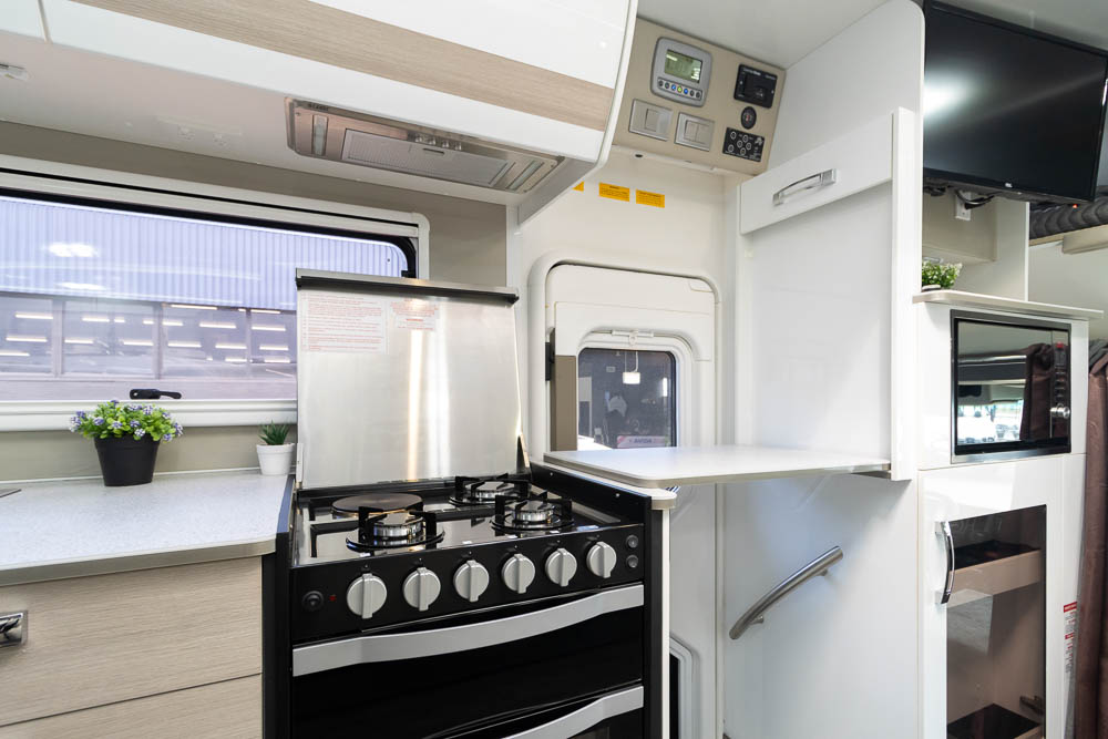 - Luxury touring interior with leather seating, Pebble benchtops and gloss cabinetry