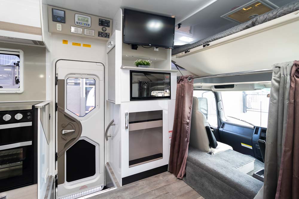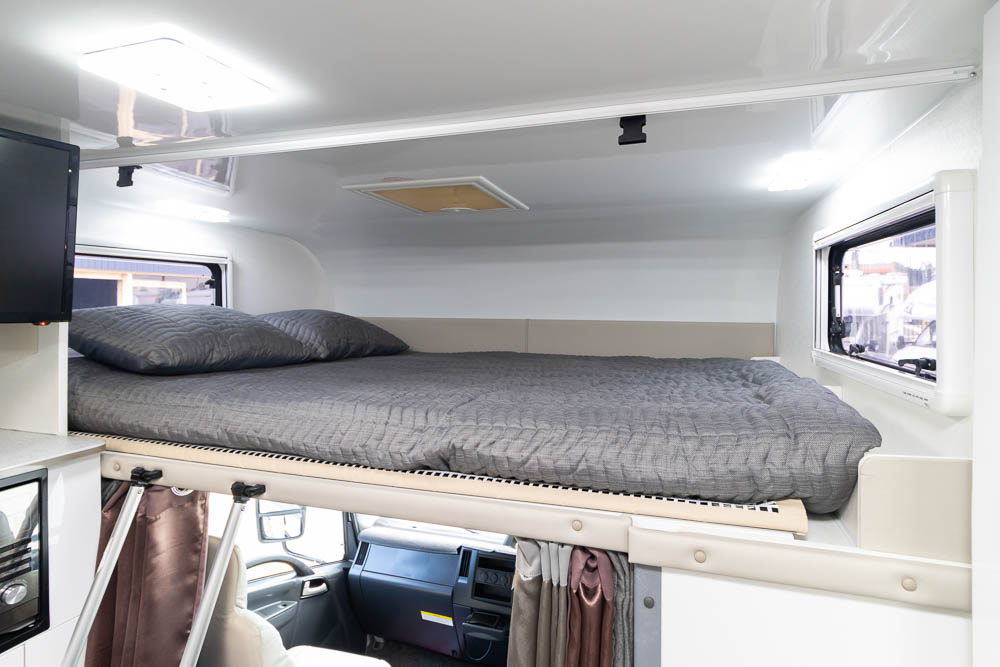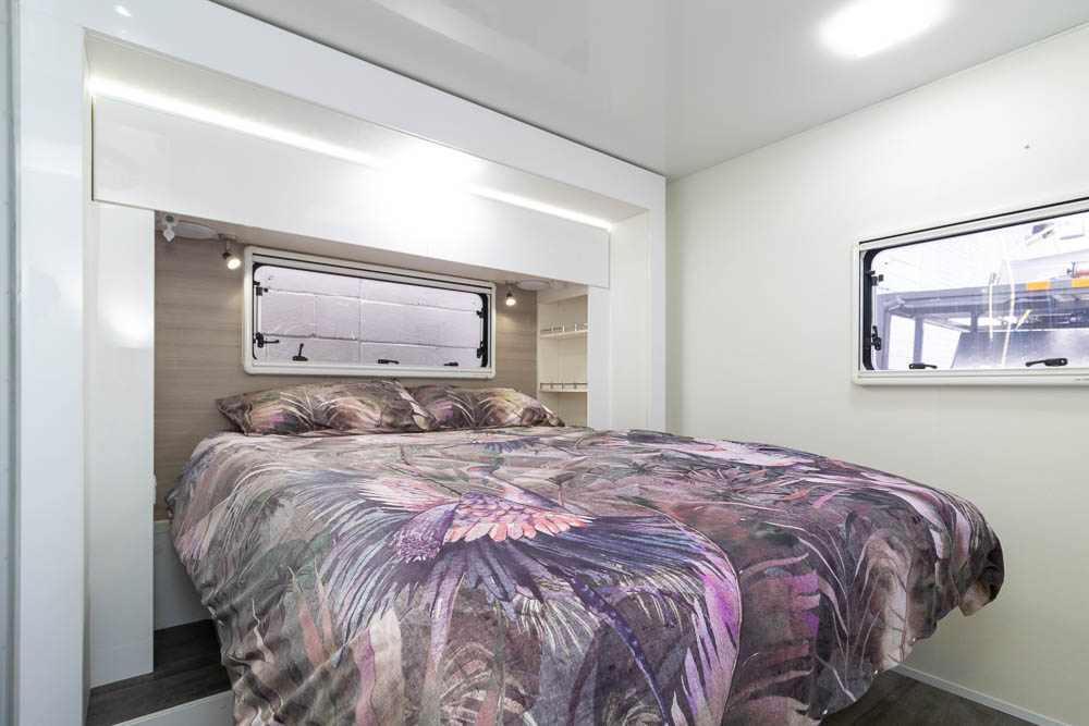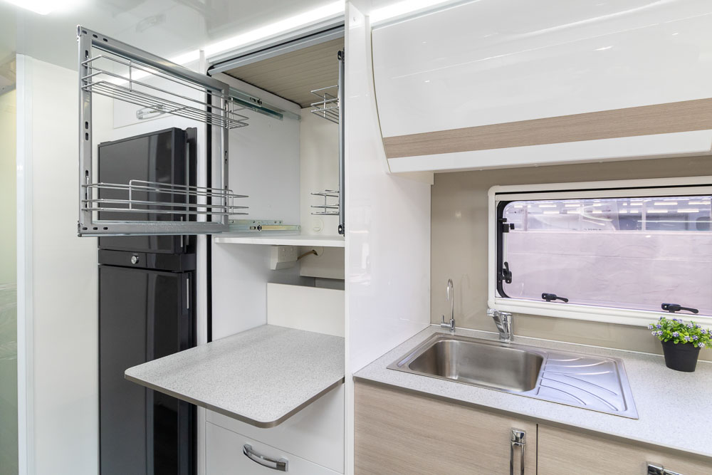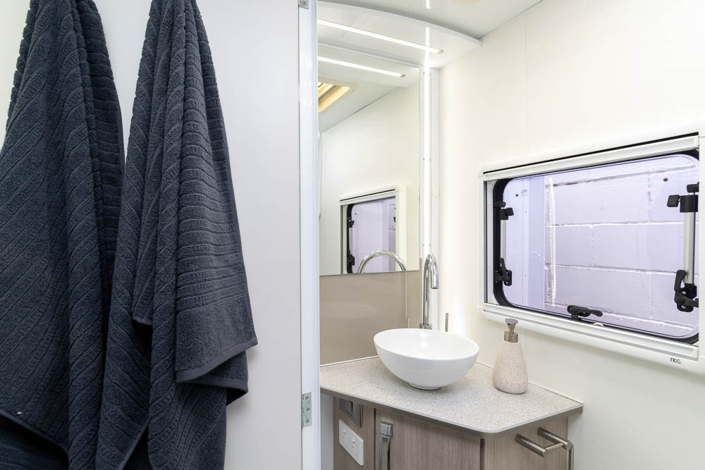Inside, the twin slide-out design dramatically expands the living area, creating a generous interior that comfortably accommodates up to six people for sleeping and four for travelling. The interior design focuses on luxury and comfort, with soft leather seating, Pebble benchtops and stylish gloss white cabinetry creating a bright and sophisticated living environment. Large windows and LED mood lighting throughout further enhance the sense of space and atmosphere.