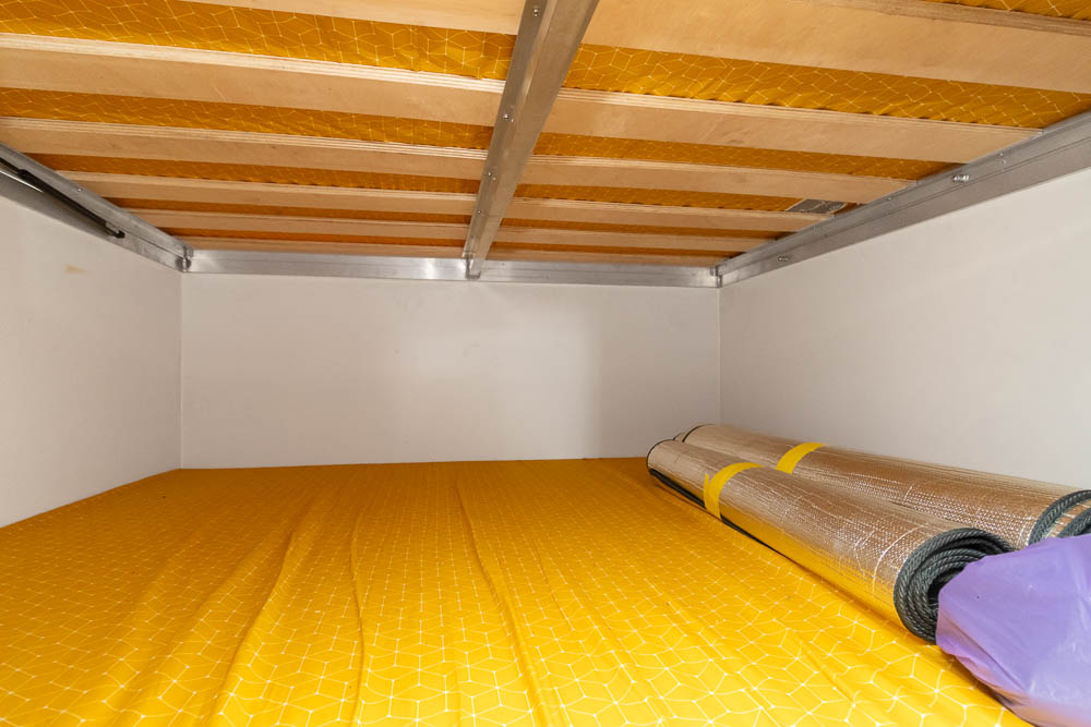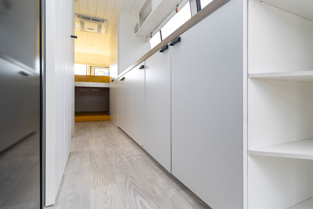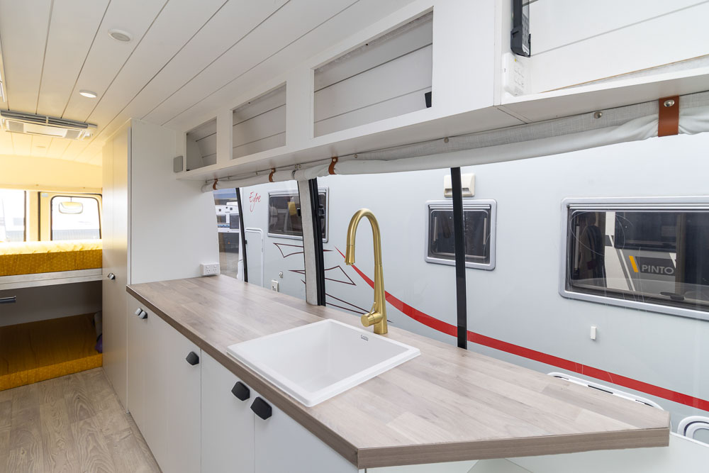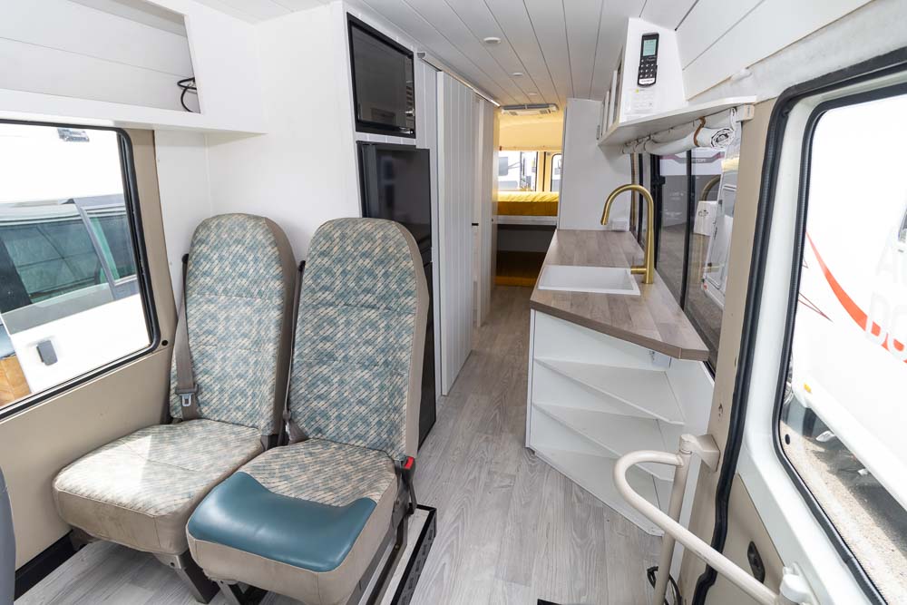Step inside and you’re greeted by a bright, open interior finished in crisp white with timber ceiling panelling, creating a relaxed, home-like atmosphere. The layout is designed for two travellers who value space, storage and comfort, with seating for up to four while on the move.