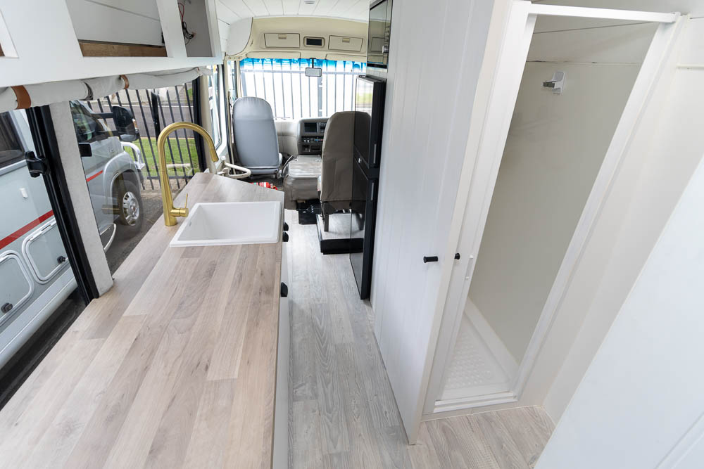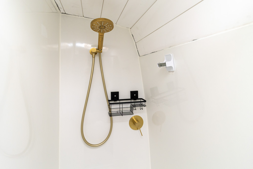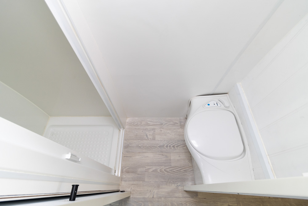 Yes, it features a combined shower and toilet, onboard water systems and internal washing machine.