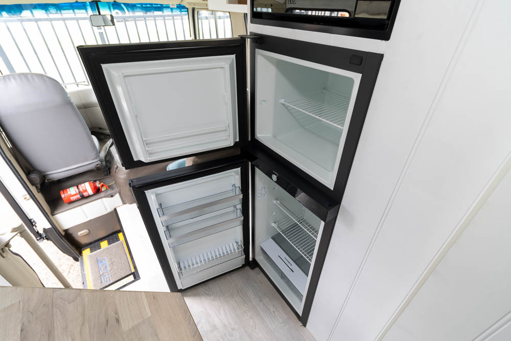 At the rear is a full-width bed, offering easy access and a comfortable night’s sleep without daily setup. The ensuite offers a shower and toilet to provide full self-containment, while ample storage throughout ensures everything has its place. A top-load washing machine cleverly housed within the wardrobe adds a level of convenience rarely found in this class.