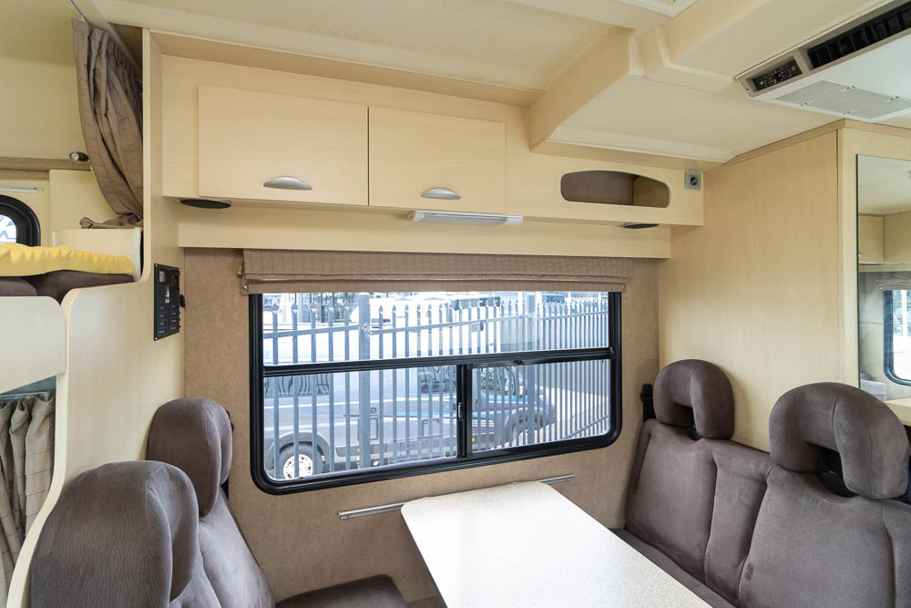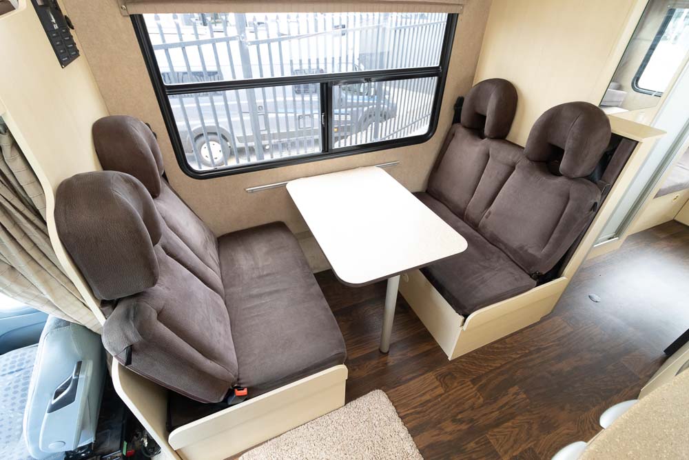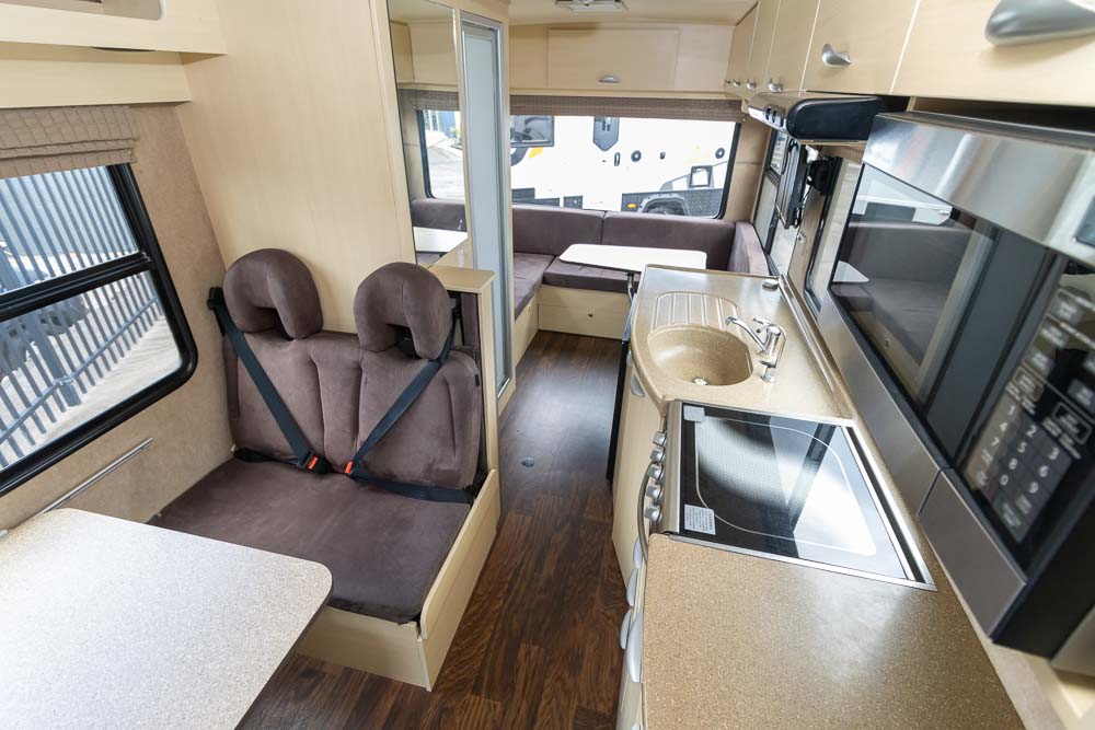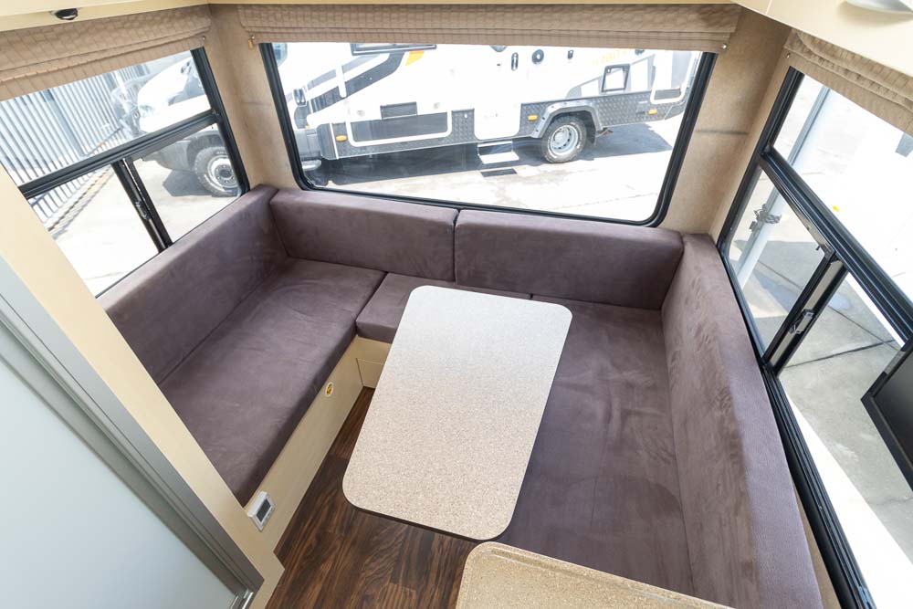 Above the cab, you’ll find the first bed, perfect for kids or extra storage when not in use. At the front behind the driver’s seat, a café-style dinette with two lounge chairs converts into a second bed. The rear U-shaped lounge and dining area can easily convert into a third bed, providing plenty of space for everyone. Large windows ensure a bright, airy feel with excellent views of your campsite.