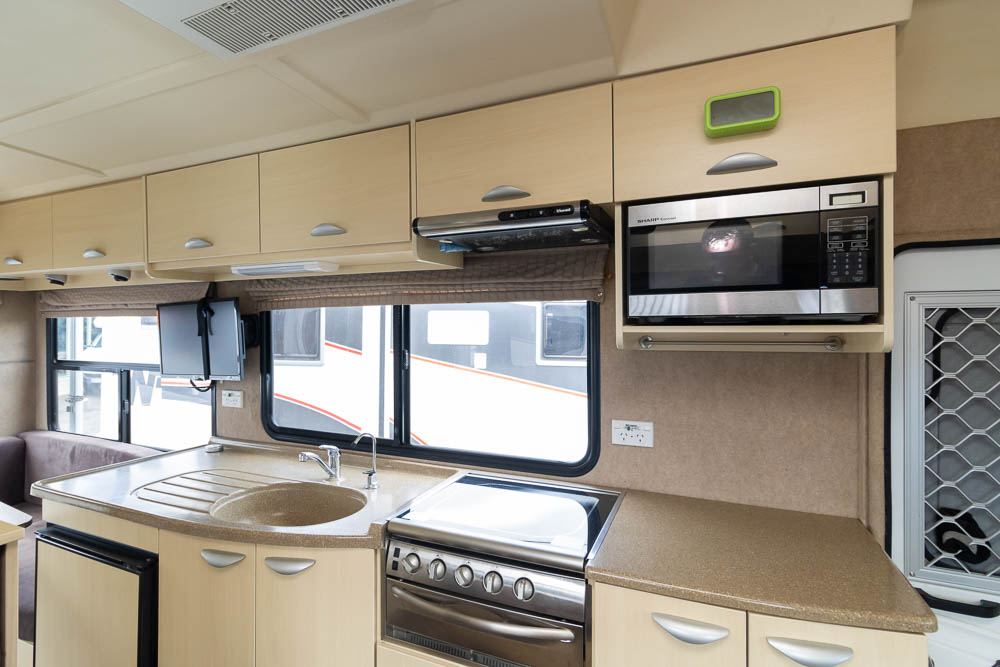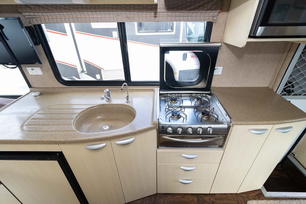 The mid-section kitchen offers practical features including a stove with lid, sink, range hood, microwave and two-way fridge, giving you all the essentials for life on the road. Opposite, the combination bathroom includes a toilet, shower and drop-down vanity, cleverly maximising the space within this compact design.