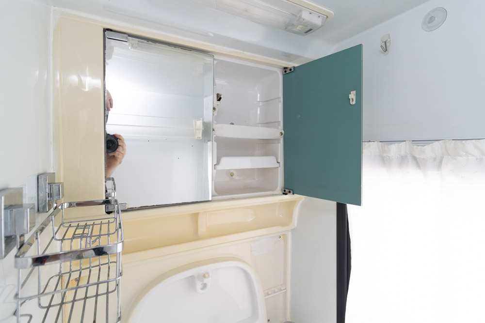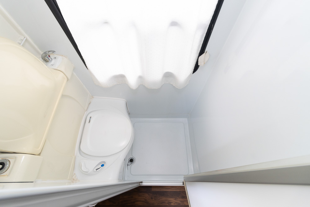 - Mid-combination bathroom with shower, toilet & drop-down vanity