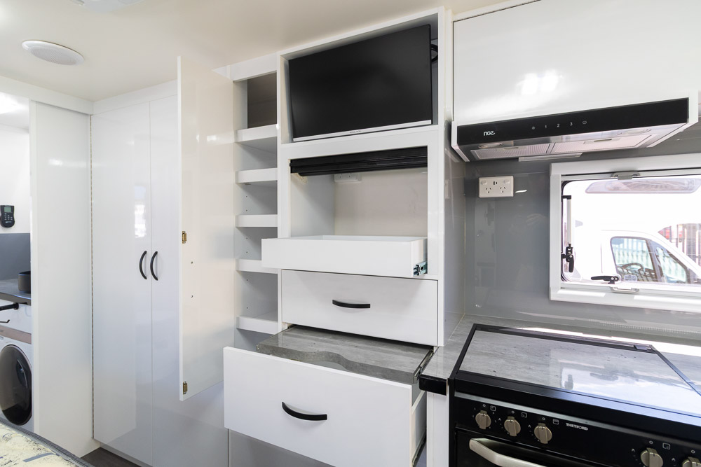 The well-equipped kitchen, luxurious bathroom and ample storage throughout ensure you can tour with comfort and convenience. Complementing these features is the motorhome’s advanced power technology – a remote start generator, a high-capacity EcoFlow battery system, solar array and digital monitoring allow you to enjoy extended off-grid adventures with confidence, keeping your appliances, lighting and climate control running efficiently without reliance on external power.