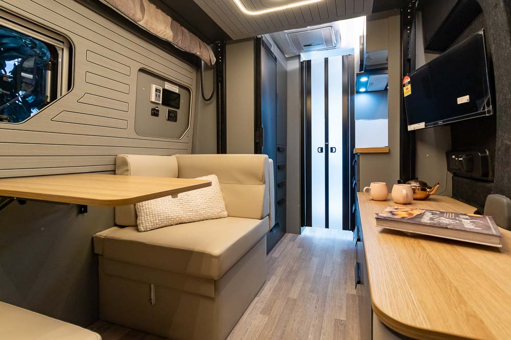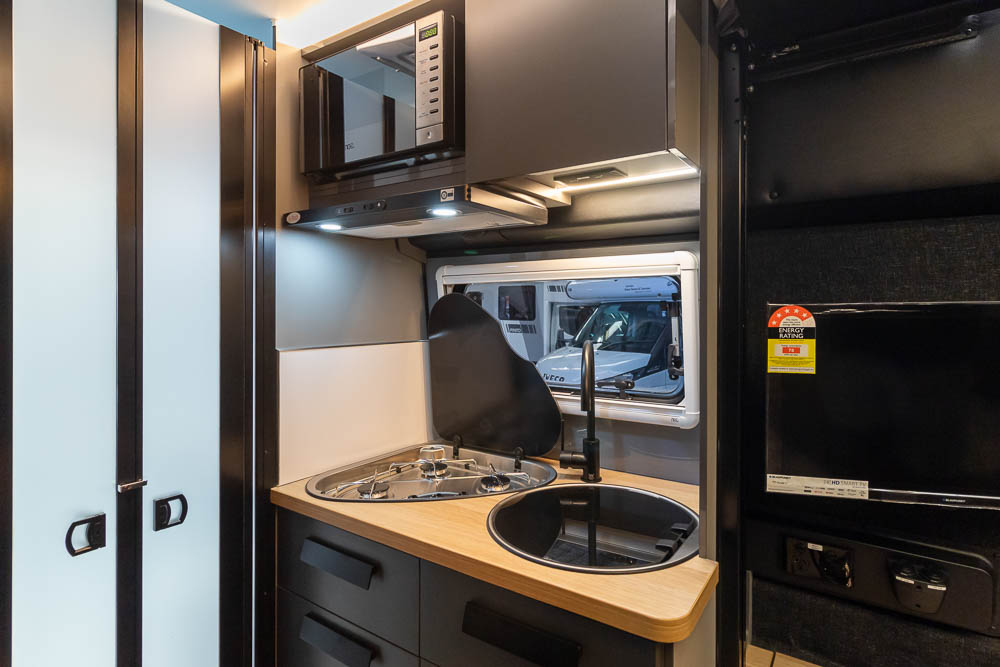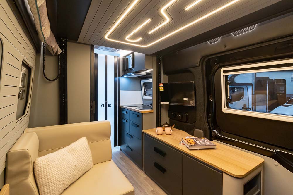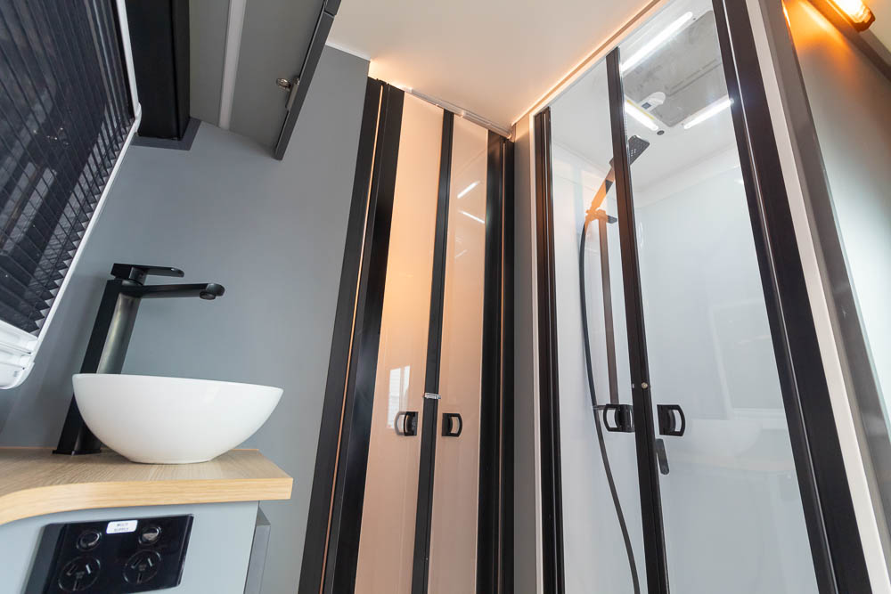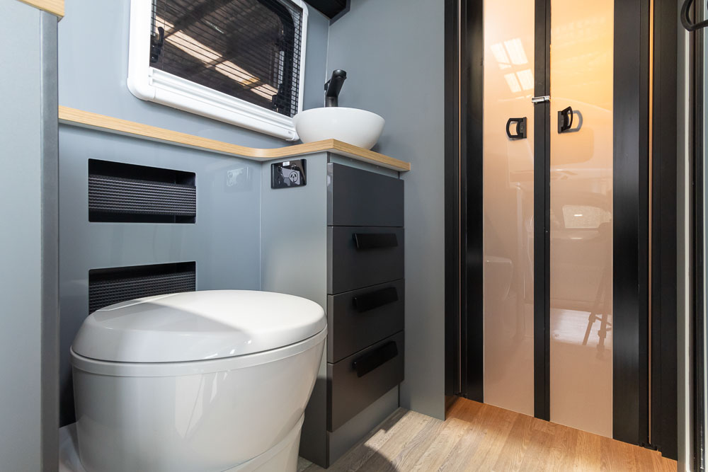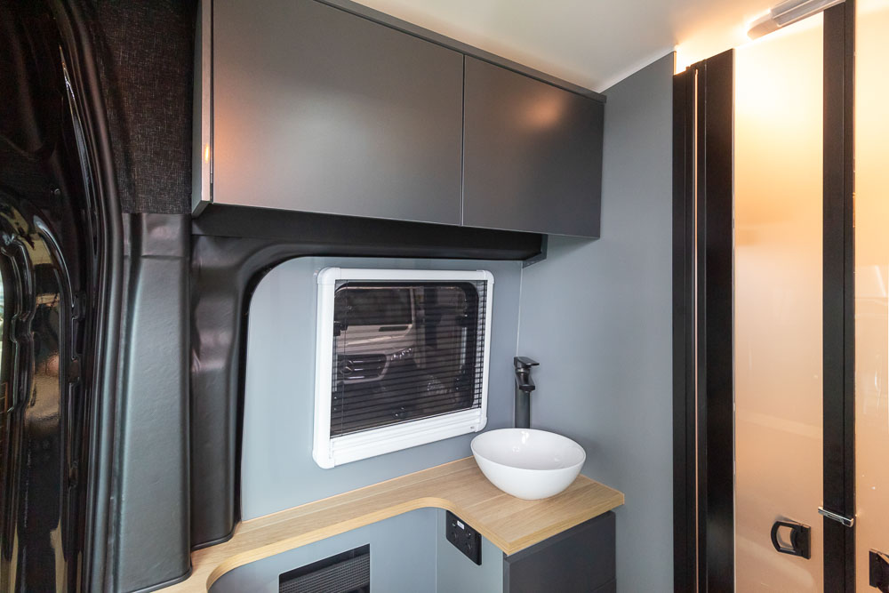 The kitchen is well-appointed, with functional bench space and abundant storage, while the rear dry bathroom offers a spacious ensuite rarely seen in campervans, complete with ample storage. The chassis cabin is fully enclosed by sliding doors, ensuring privacy and separation from the living space.