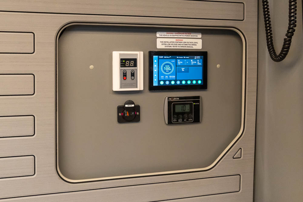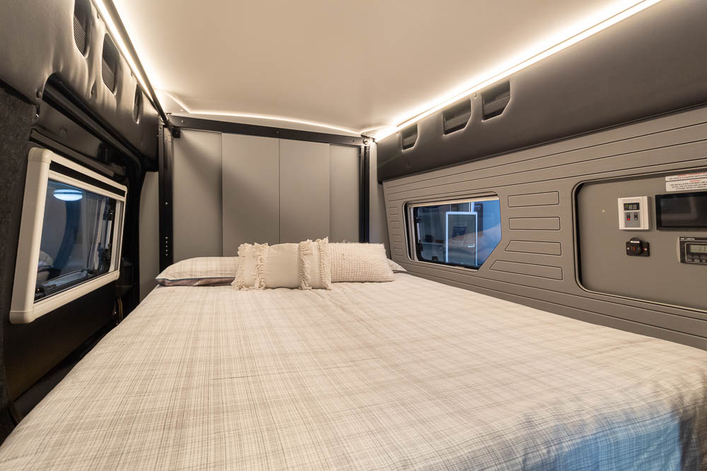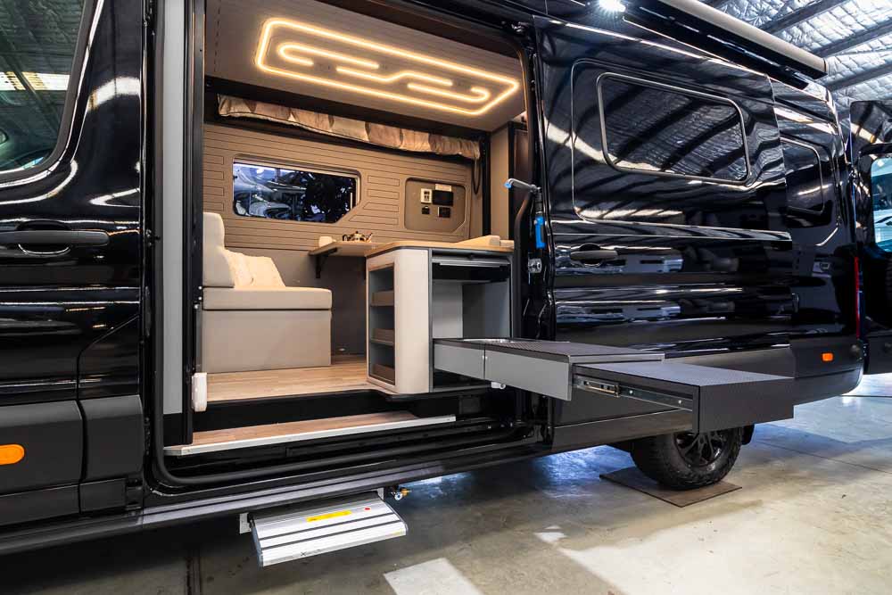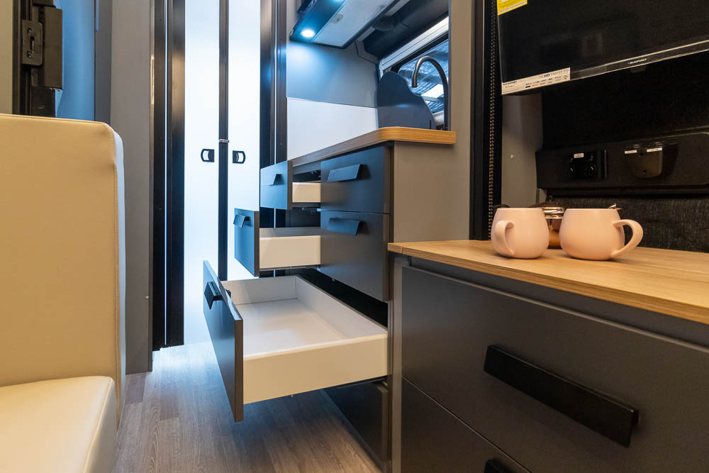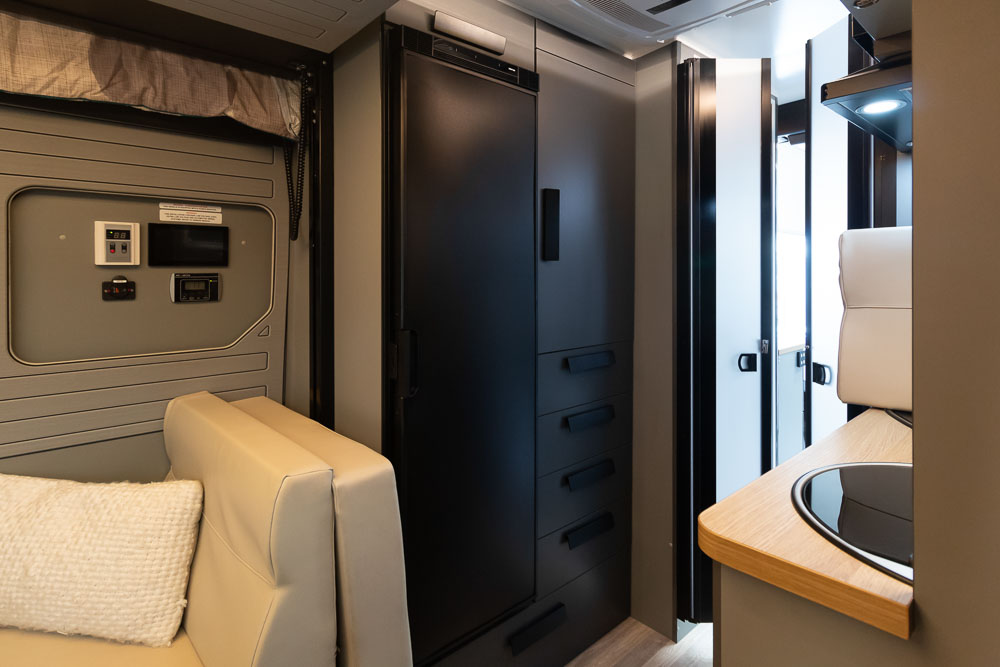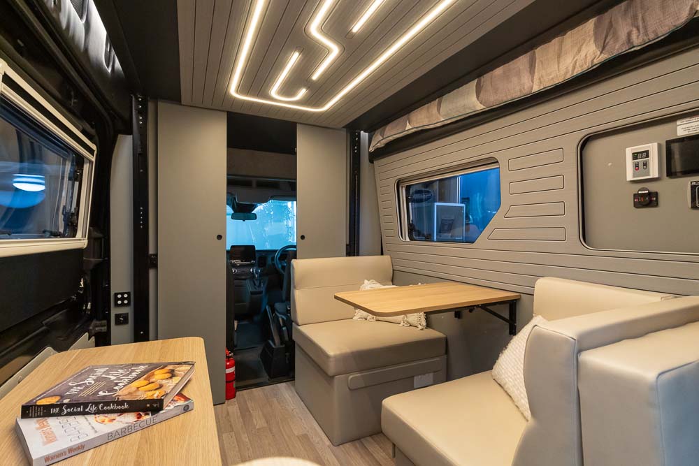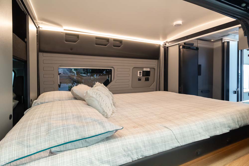 The kitchen is well-appointed, with functional bench space and abundant storage, while the rear dry bathroom offers a spacious ensuite rarely seen in campervans, complete with ample storage. The chassis cabin is fully enclosed by sliding doors, ensuring privacy and separation from the living space.