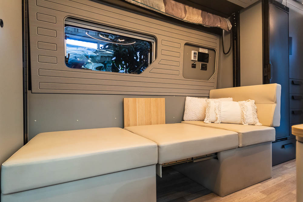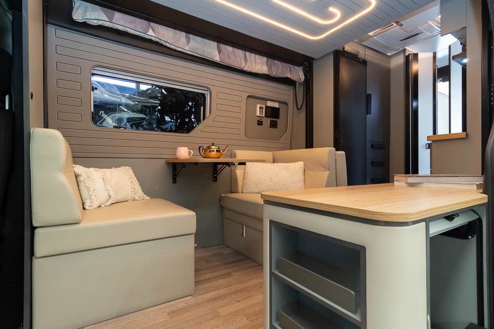 - Living Area: 2×2 person dinette converts to day/single bed, integrated lift-up tabletop