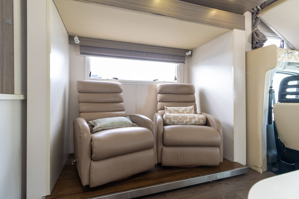 The Monte Carlo M72 is designed for travellers who value open living and separation of zones. The forward slide-out transforms the lounge into a spacious entertaining area, complete with leather upholstery and additional travel seating. Whether you’re parked by the coast or settled inland, the interior feels residential rather than recreational.