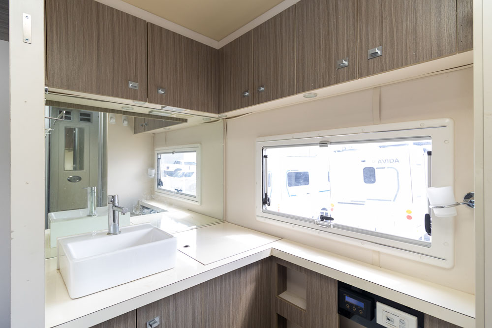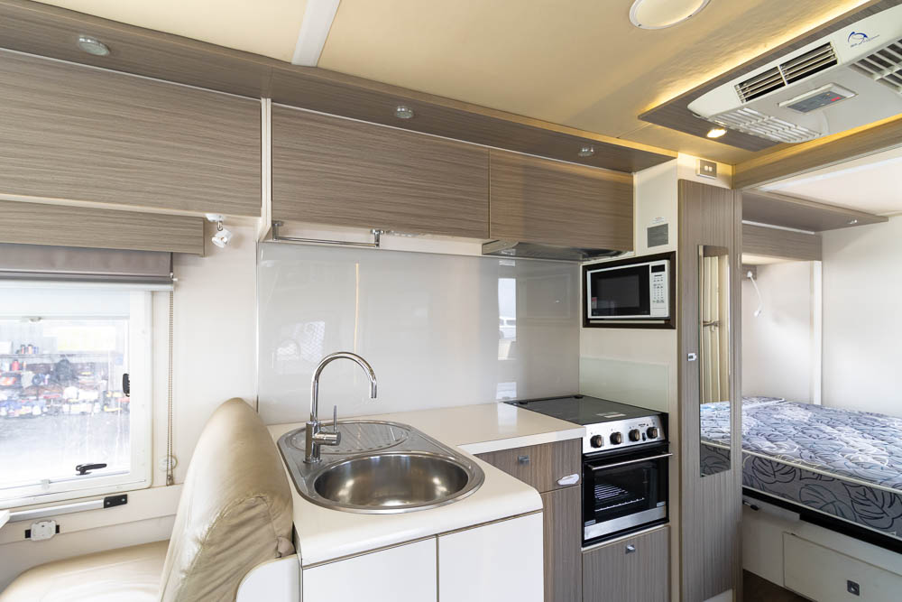 Mid-vehicle, the kitchen offers generous bench space, microwave, 2-way fridge/freezer, ample storage and practical workflow for longer stays. Everything is positioned for comfort rather than compromise.