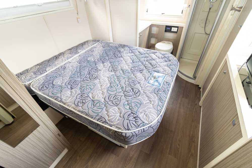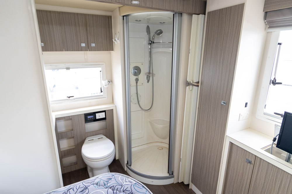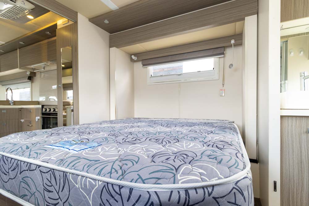 The second slide-out enhances the private rear bedroom, creating walk-around access to the island bed and excellent wardrobe storage. Across the back sits a full-width ensuite featuring a separate shower, toilet, vanity and top-load washing machine; ideal for extended touring without relying on caravan park amenities.
