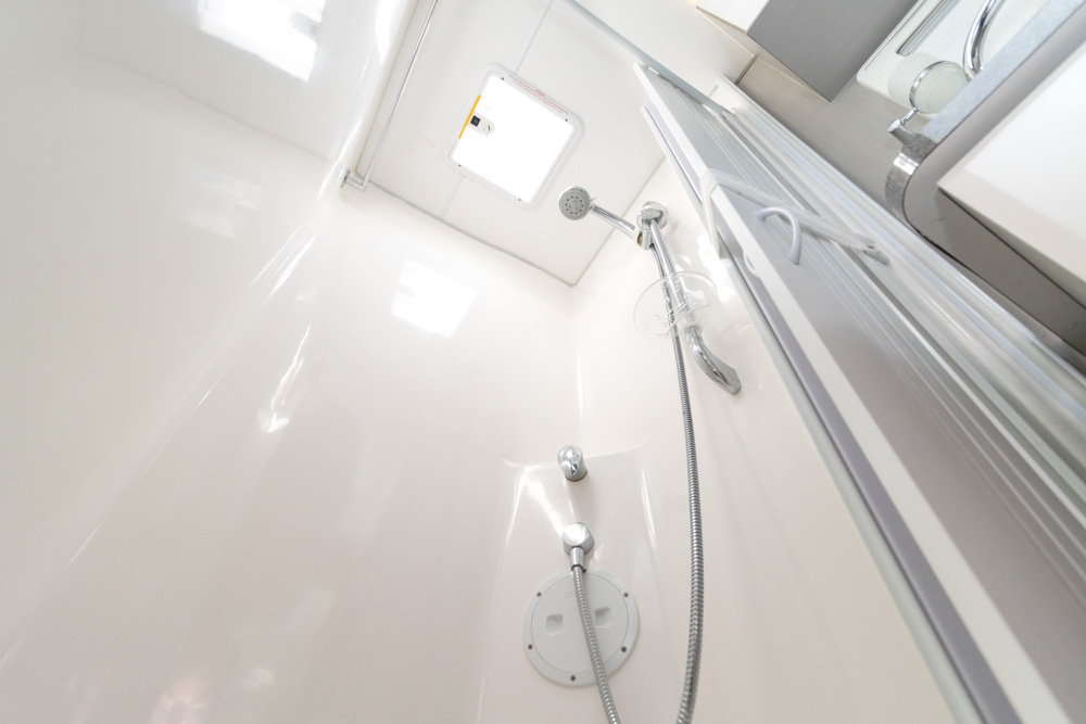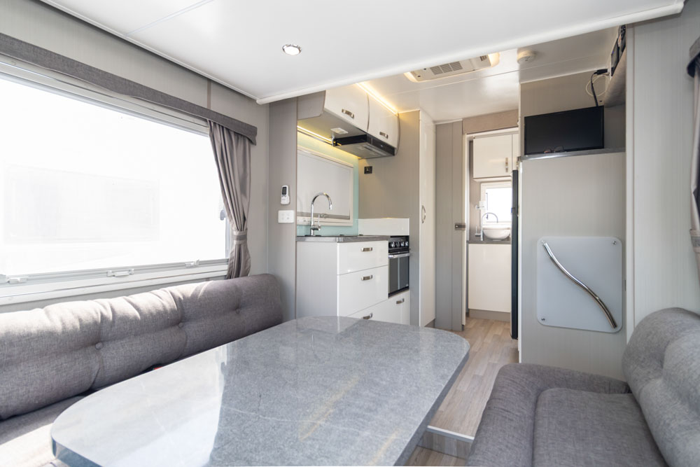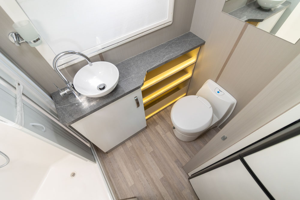 At the rear, the full ensuite includes a separate shower, toilet, vanity and generous storage, making it ideal for extended stays or full-time touring.