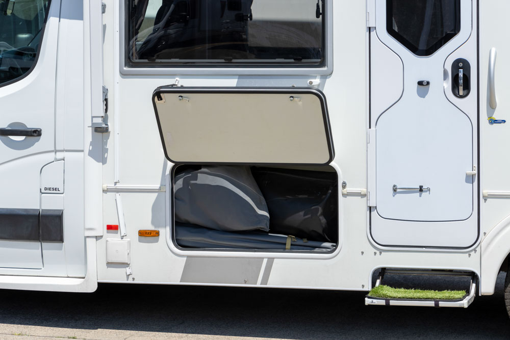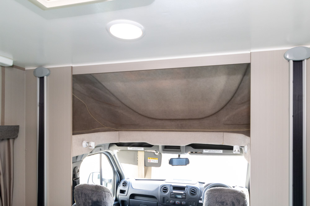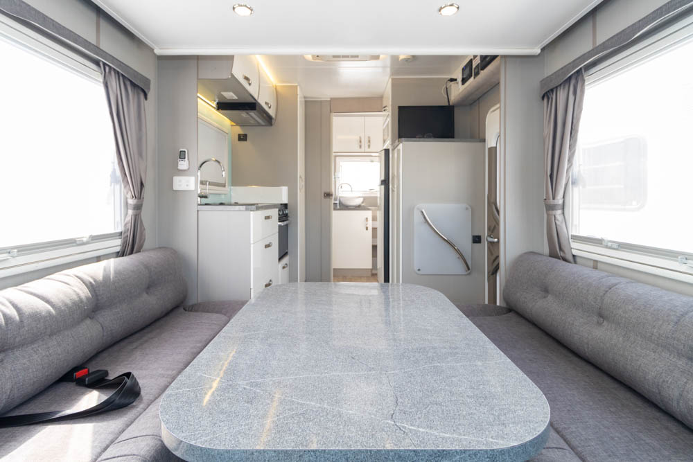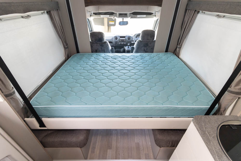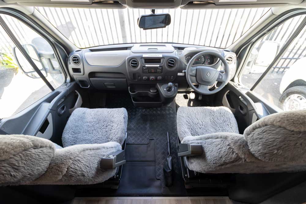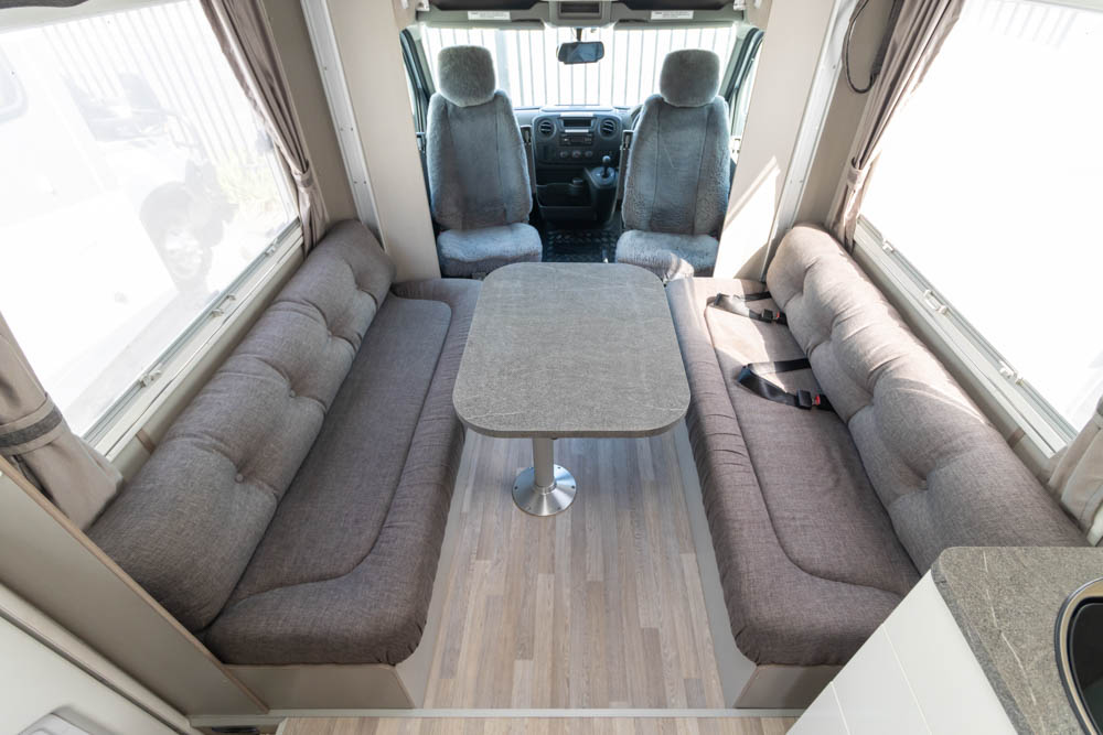 The front living area is open and inviting, with twin bench seats that lift to reveal extra storage. Large windows on either side flood the space with natural light and allow you to enjoy scenic views from the comfort of your motorhome. The bench seats also feature two additional seat belts for any travel companions.