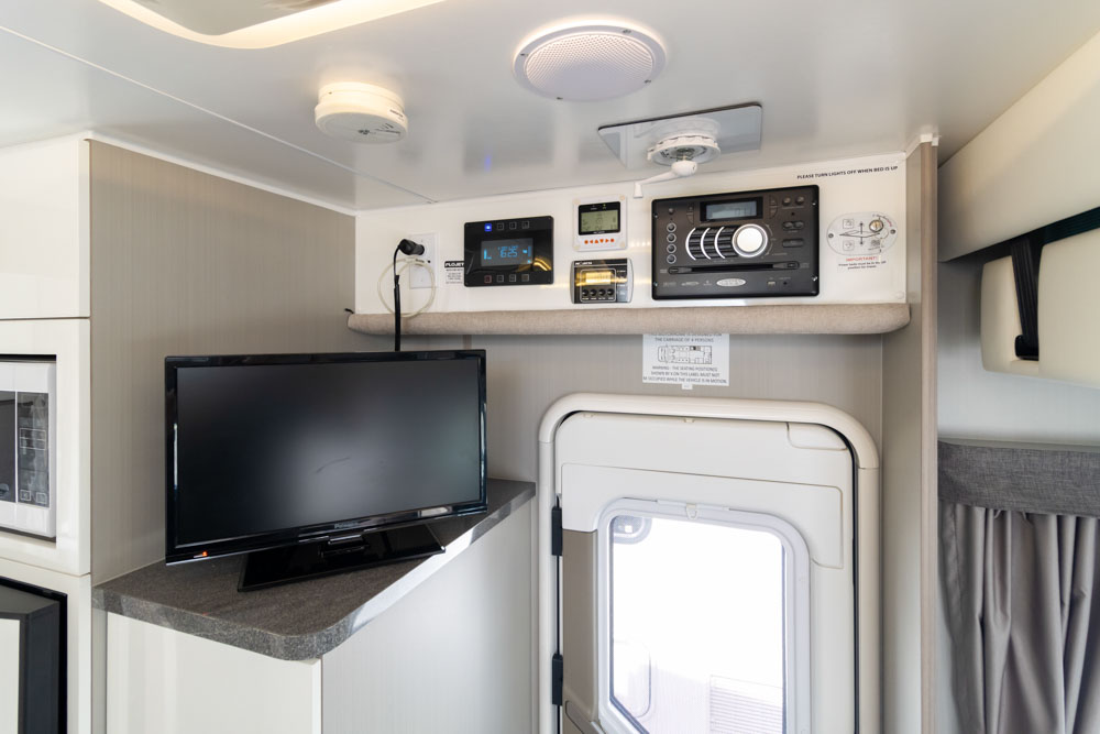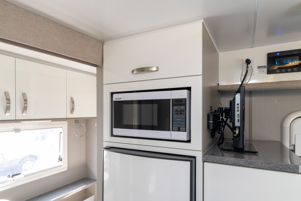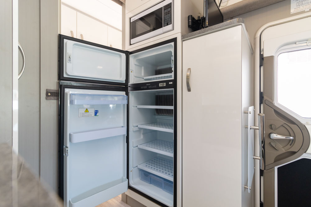 The centrally located kitchen is designed for function and ease. It includes a sink, stove, range hood and window for ventilation. On the opposite wall, you’ll find a two-door, three-way fridge and an overhead microwave, giving you everything needed for cooking on the road.