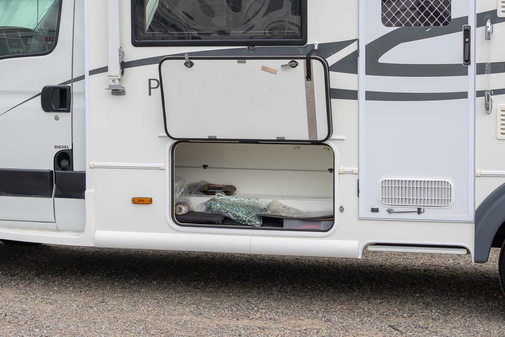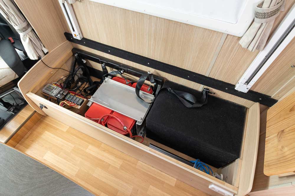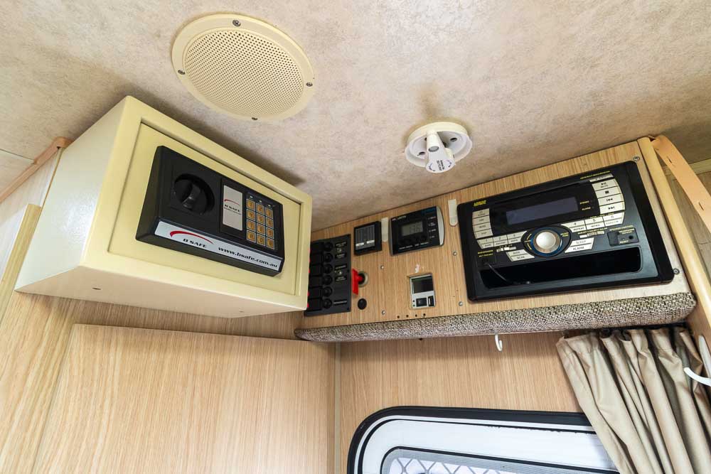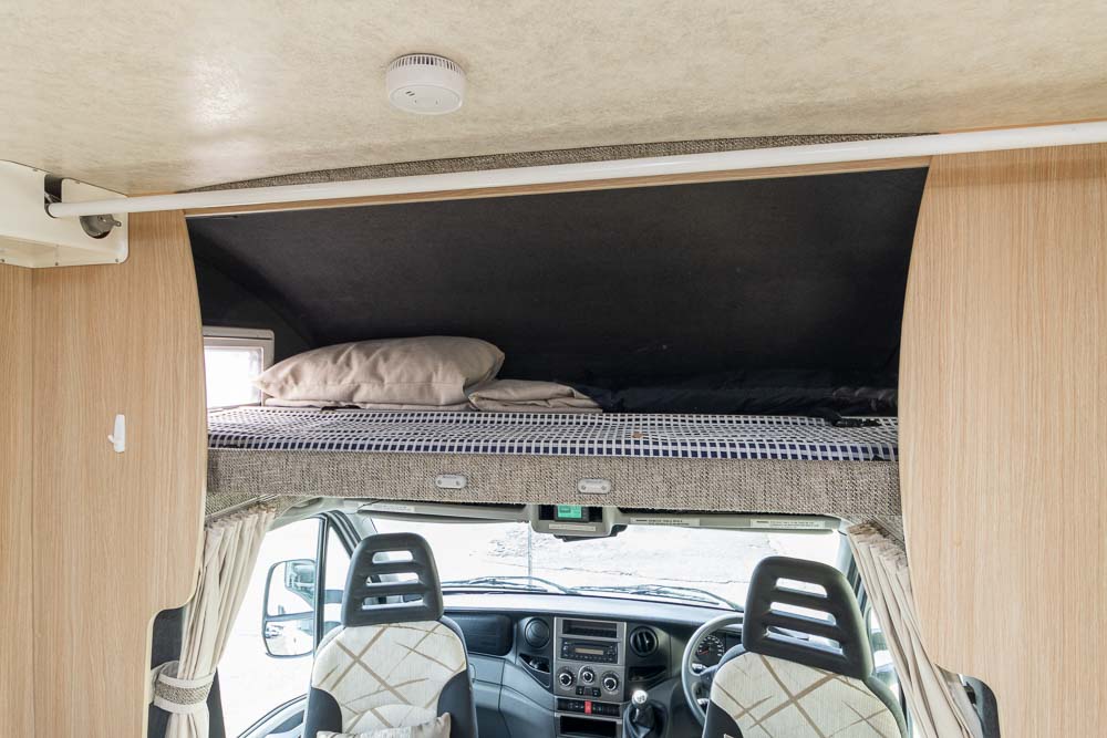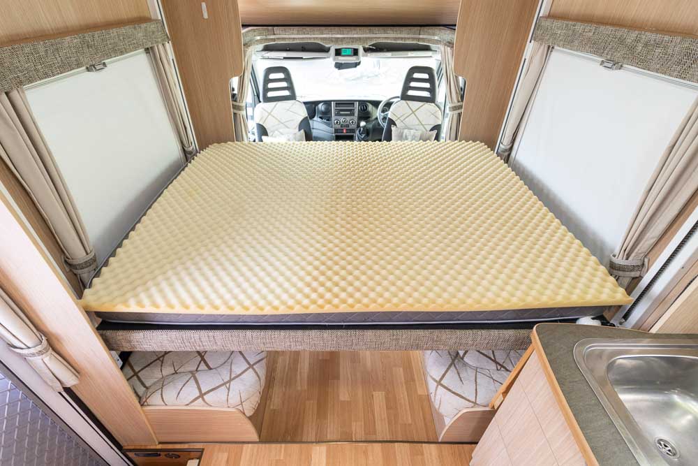 A: At the touch of a button, the bed lowers from the overhead compartment, providing a comfortable sleeping space while maintaining the motorhome’s compact length.